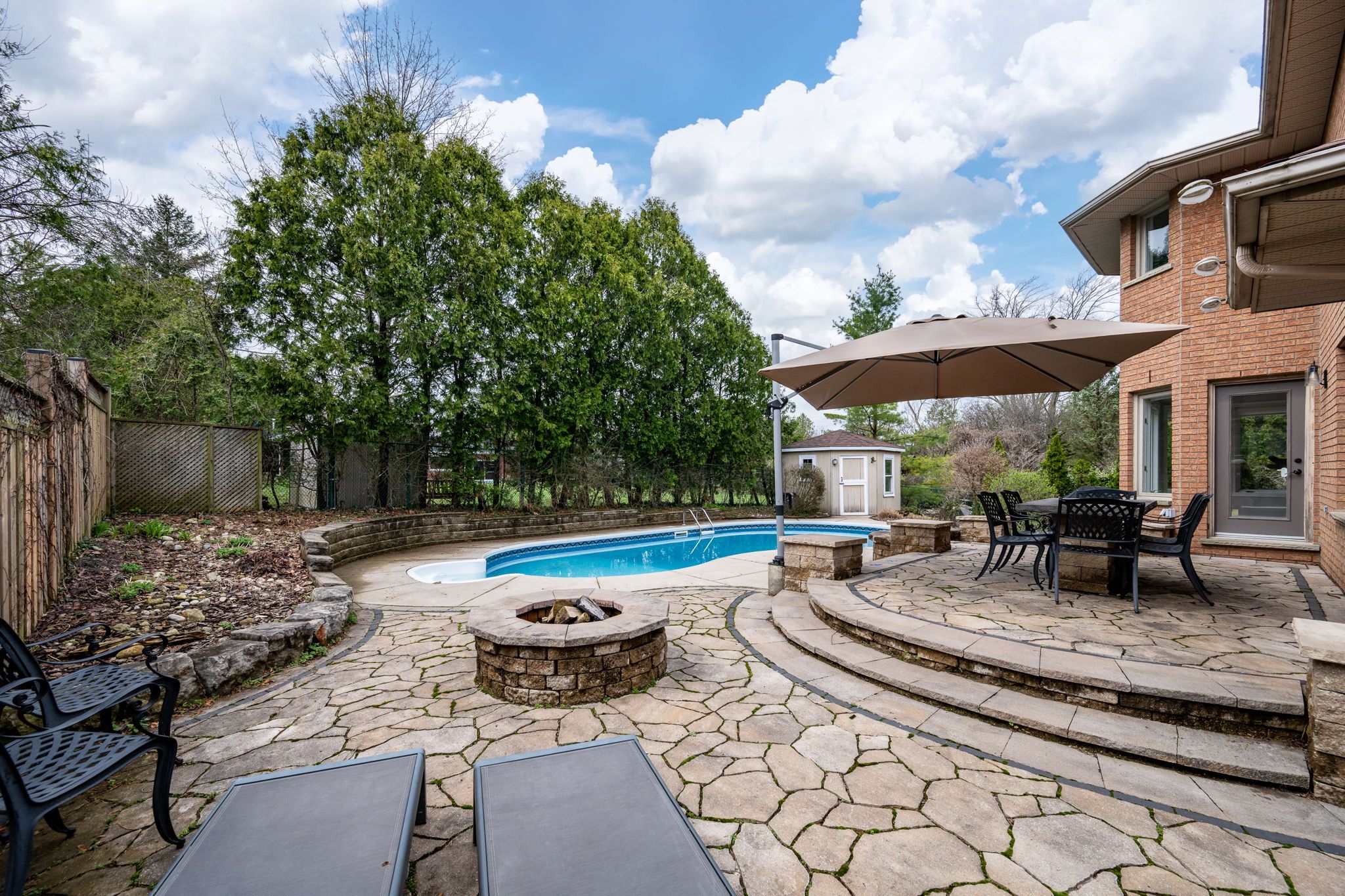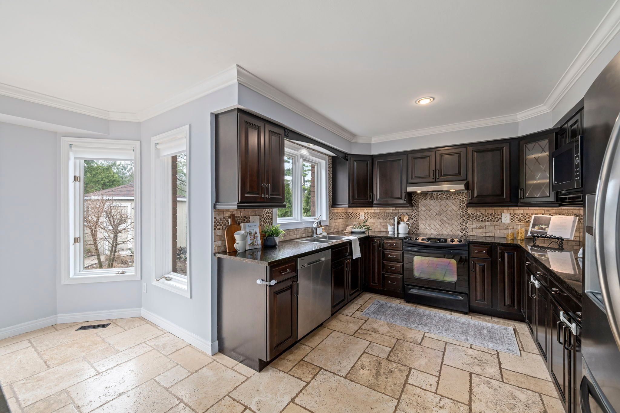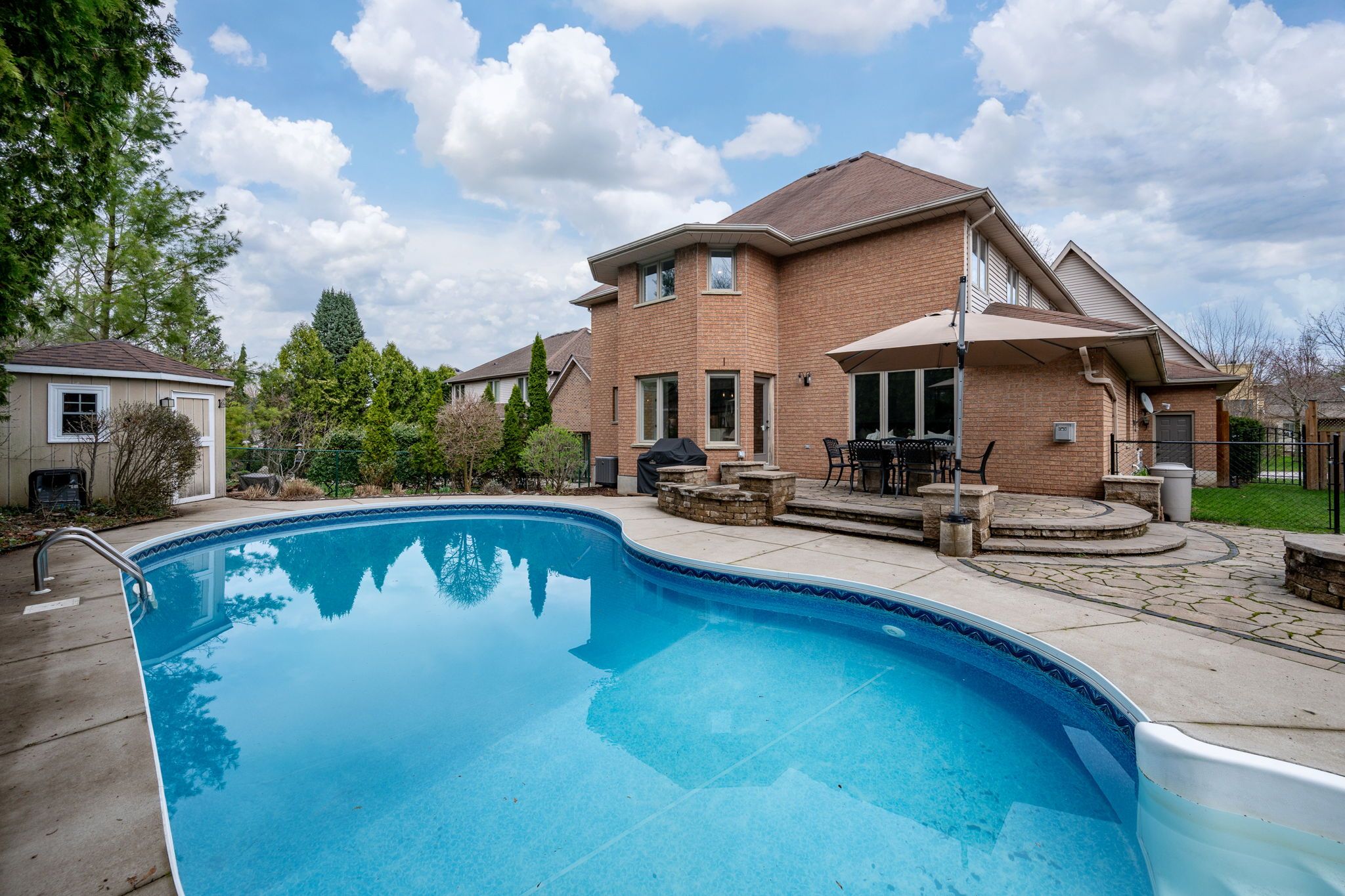 • Eat-in kitchen with backyard views, in-ground pool, and open layout.