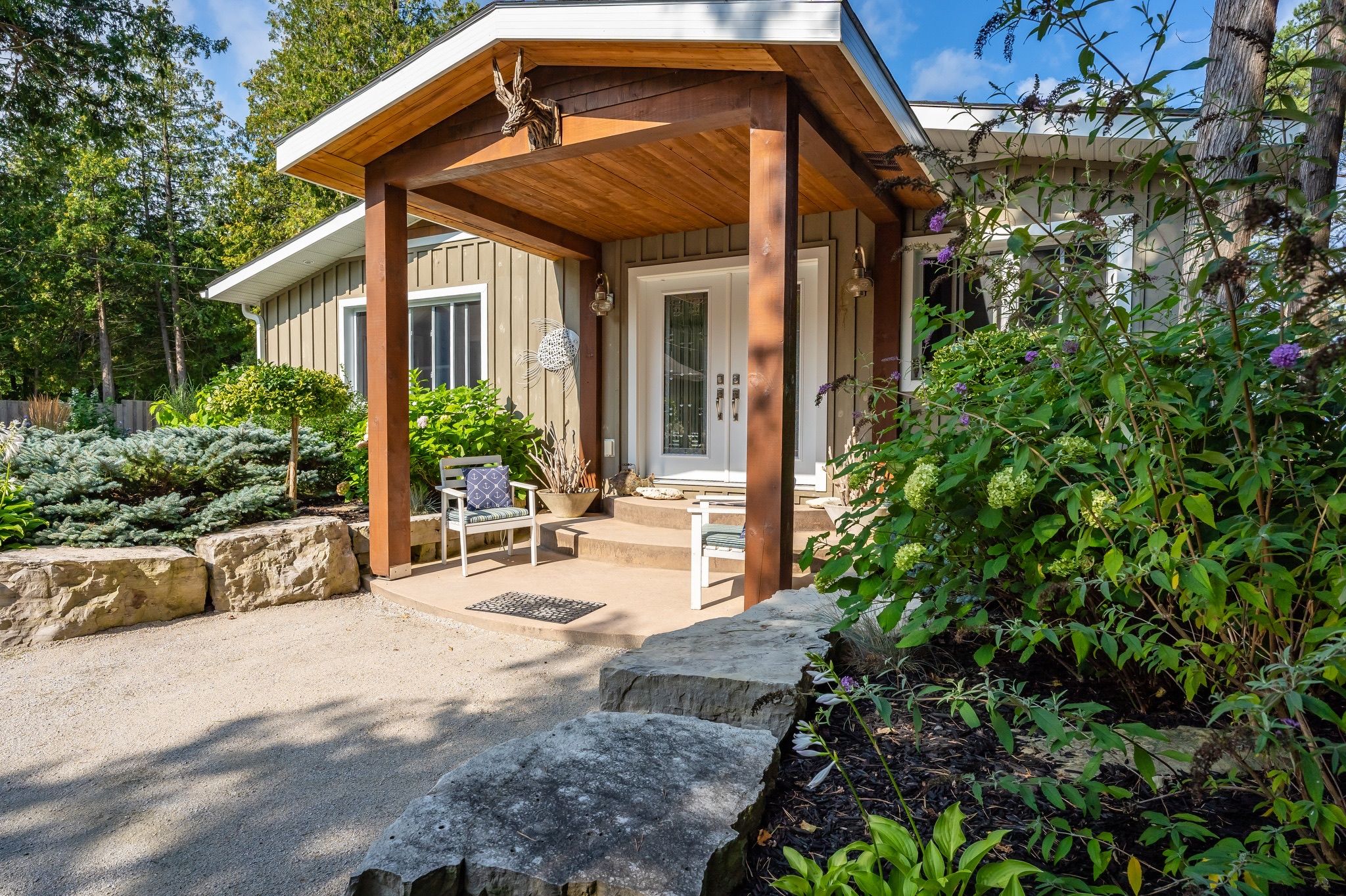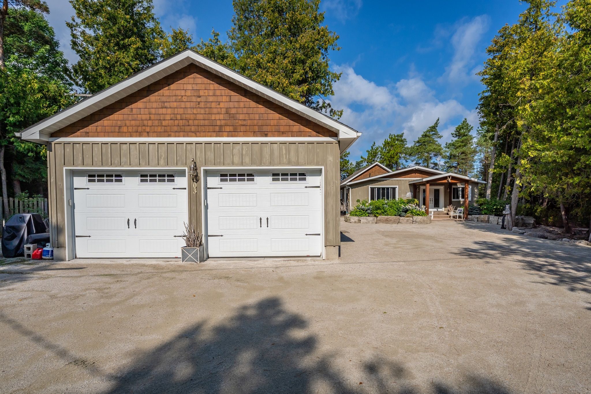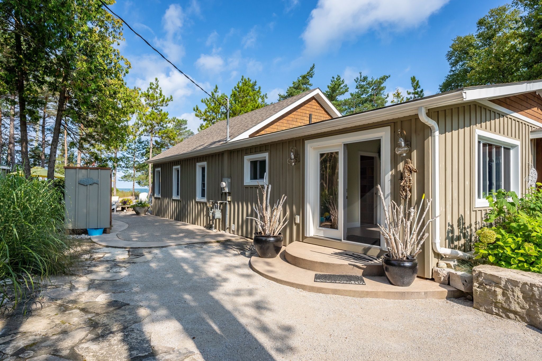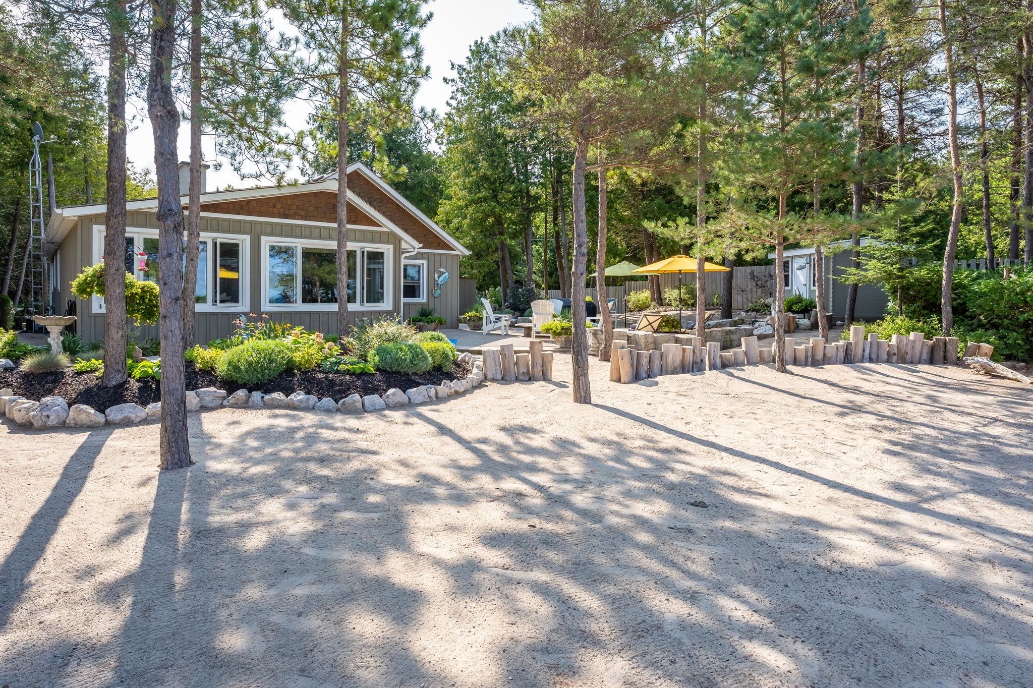Dream beachfront retreat in port elgin. This is an unparalleled opportunity to own a piece of saugeen beach road's coveted shoreline, nestled in the trees along the enclave known locally as eidt's grove. This property boasts a generous 111 foot frontage of sandy lake huron shoreline, offering spectacular panoramic views and sunsets. The large, private lot is a natural oasis, featuring a charming babbling stream that meanders through the property. The fully renovated 1,800 square foot year-round home or vacation hideaway (fully updated in 2010) is designed for comfort and style. Inside, the home is anchored by a rustic stone fireplace in the main living area, complemented by engineered hickory wood floors and a bright, functional kitchen featuring whitewashed poplar cabinetry, a large island, and stainless steel appliances. With three bedrooms, a large entrance foyer, and a main-floor laundry room, this home is as practical as it is beautiful. Step outside to exceptional outdoor living spaces, including stunning exposed aggregate concrete walkways and patios that lead directly to the white sand beach. The property is complete with an oversized, detached 24 x 30 foot insulated garage/workshop, a woodshed, a 7 x 11 foot bunkie, and a refreshing outdoor shower, making this a truly turn-key lakefront gem.