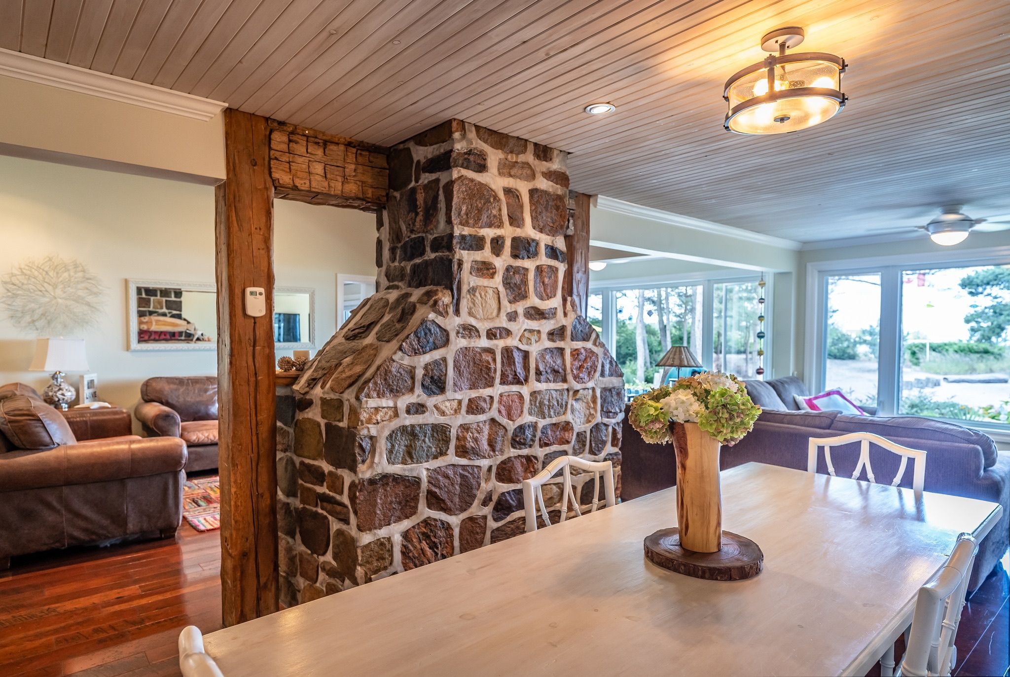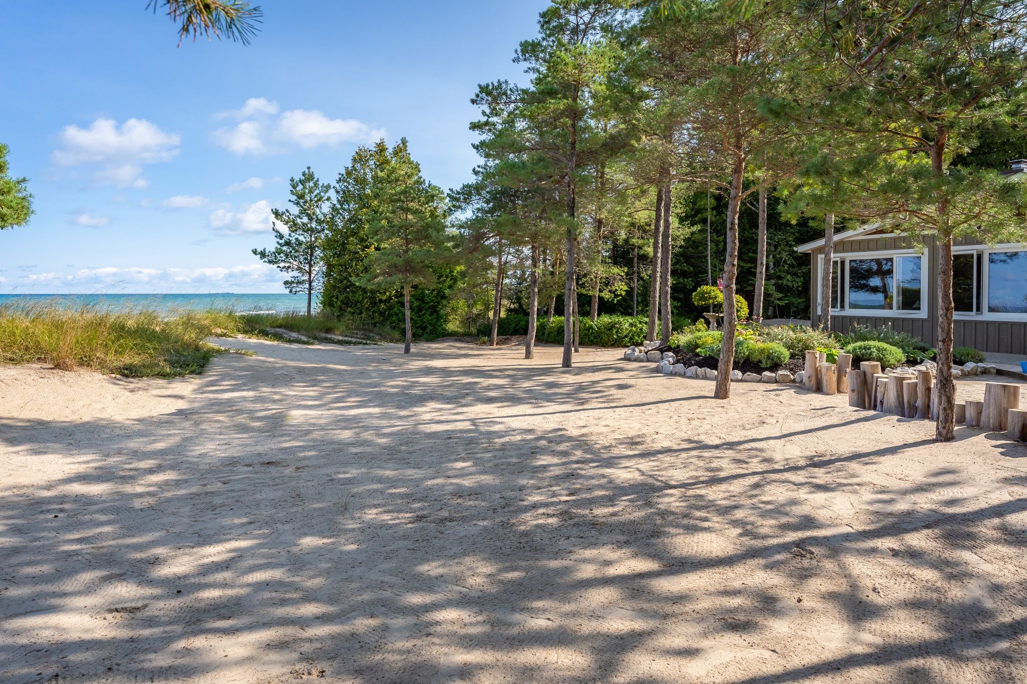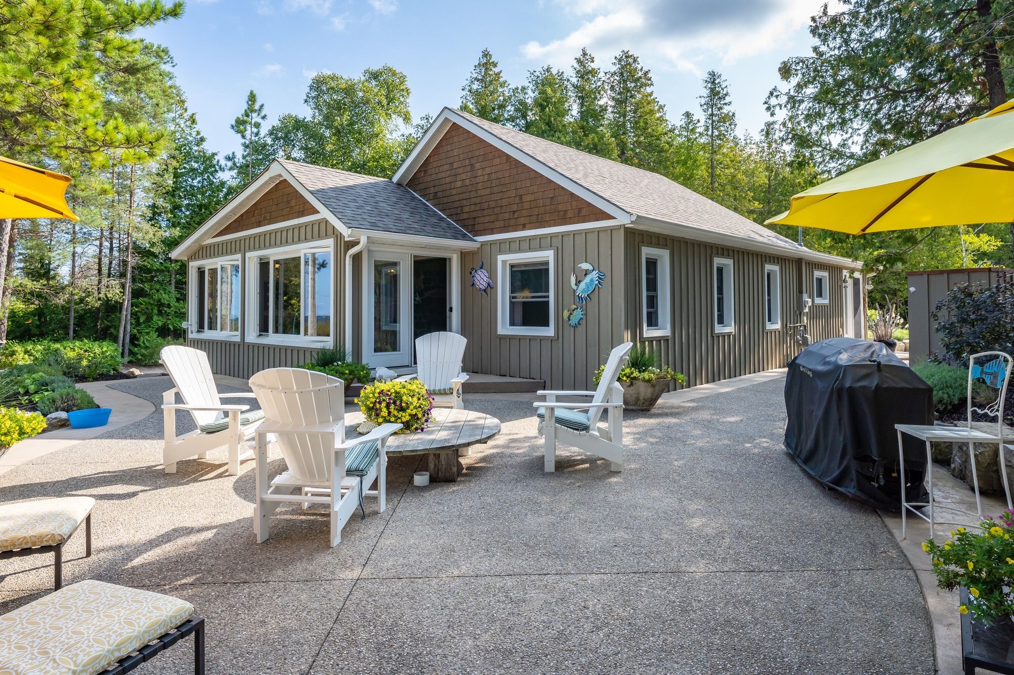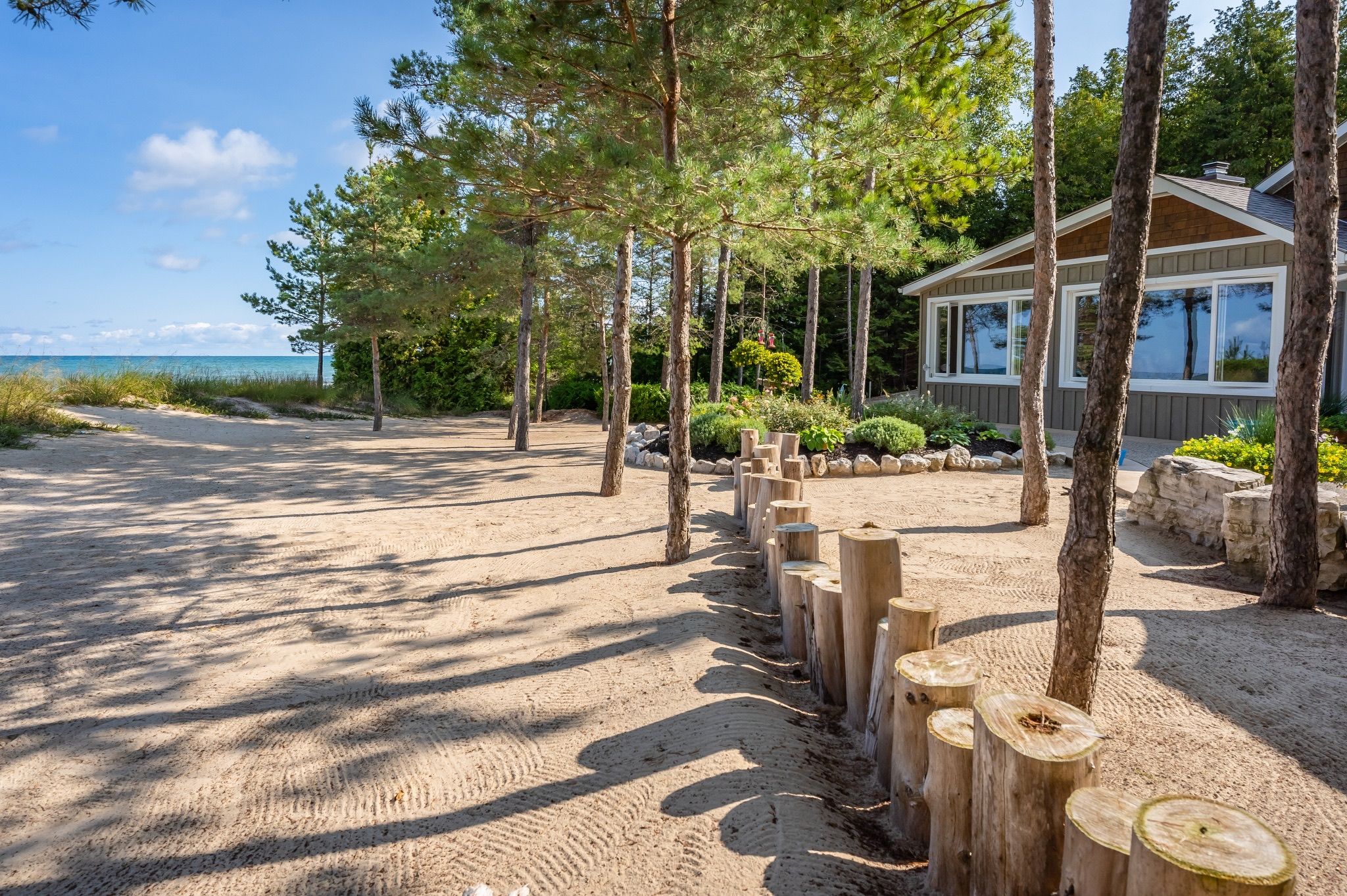 Dream beachfront retreat in port elgin. This is an unparalleled opportunity to own a piece of saugeen beach road's coveted shoreline, nestled in the trees along the enclave known locally as eidt's grove. This property boasts a generous 111 foot frontage of sandy lake huron shoreline, offering spectacular panoramic views and sunsets. The large, private lot is a natural oasis, featuring a charming babbling stream that meanders through the property. The fully renovated 1,800 square foot year-round home or vacation hideaway (fully updated in 2010) is designed for comfort and style. Inside, the home is anchored by a rustic stone fireplace in the main living area, complemented by engineered hickory wood floors and a bright, functional kitchen featuring whitewashed poplar cabinetry, a large island, and stainless steel appliances. With three bedrooms, a large entrance foyer, and a main-floor laundry room, this home is as practical as it is beautiful. Step outside to exceptional outdoor living spaces, including stunning exposed aggregate concrete walkways and patios that lead directly to the white sand beach. The property is complete with an oversized, detached 24 x 30 foot insulated garage/workshop, a woodshed, a 7 x 11 foot bunkie, and a refreshing outdoor shower, making this a truly turn-key lakefront gem.