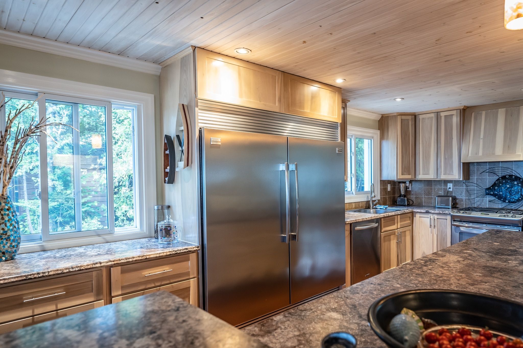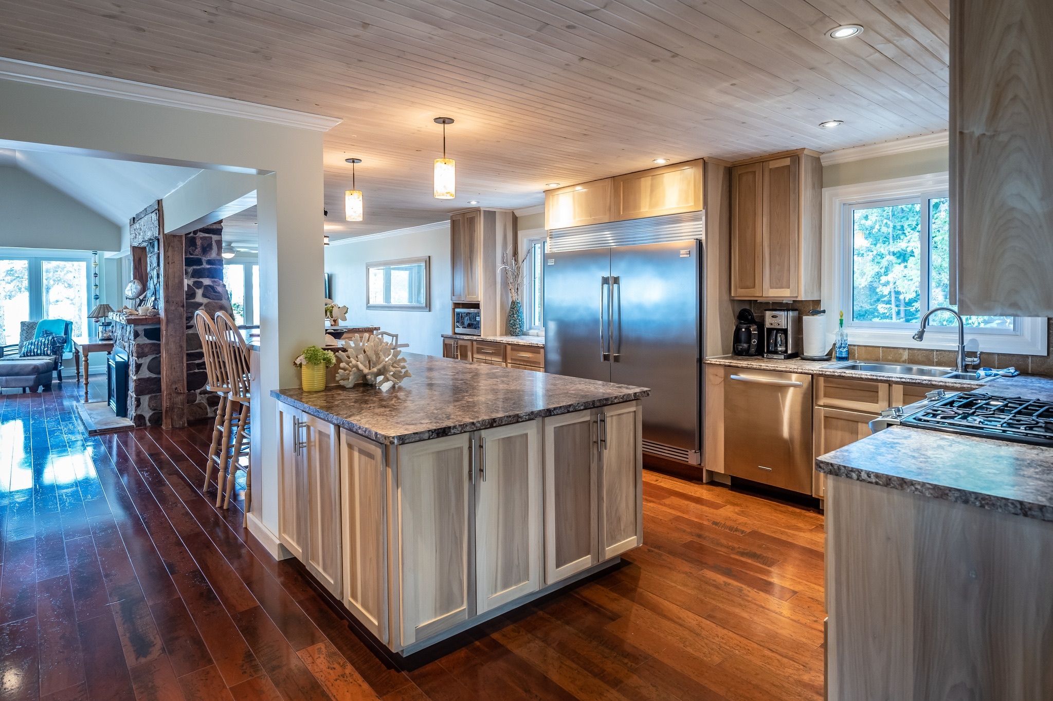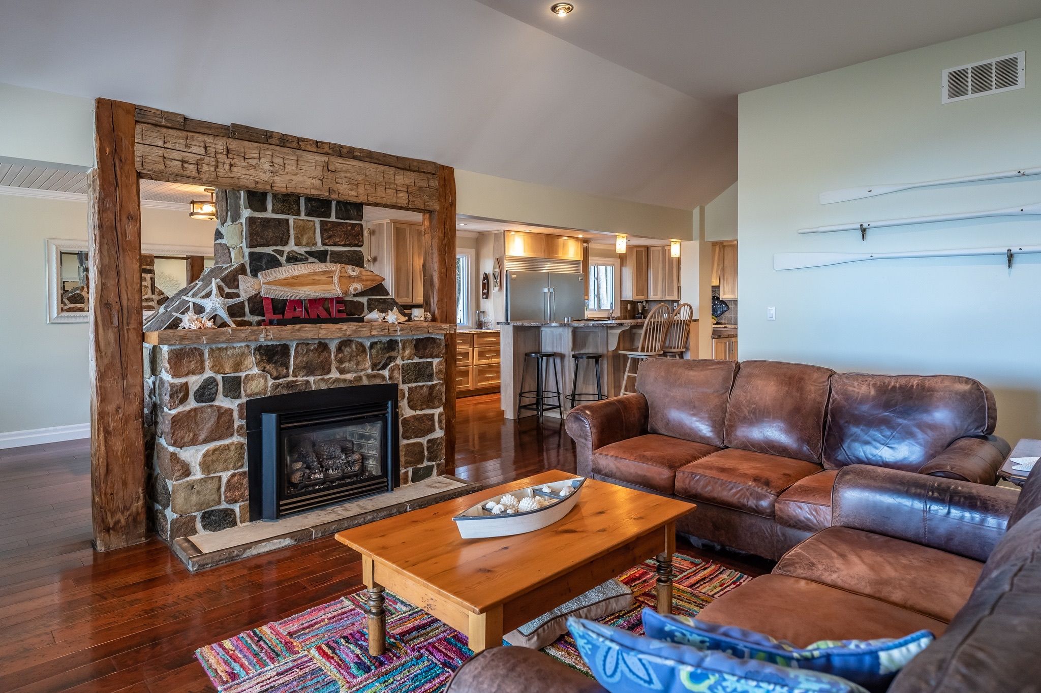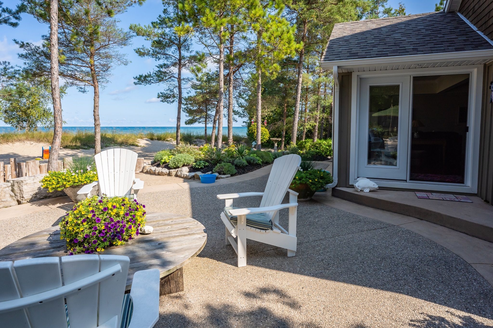 Dream beachfront retreat in port elgin. This is an unparalleled opportunity to own a piece of saugeen beach road's coveted shoreline, nestled in the trees along the enclave known locally as eidt's grove. This property boasts a generous 111 foot frontage of sandy lake huron shoreline, offering spectacular panoramic views and sunsets. The large, private lot is a natural oasis, featuring a charming babbling stream that meanders through the property. The fully renovated 1,800 square foot year-round home or vacation hideaway (fully updated in 2010) is designed for comfort and style. Inside, the home is anchored by a rustic stone fireplace in the main living area, complemented by engineered hickory wood floors and a bright, functional kitchen featuring whitewashed poplar cabinetry, a large island, and stainless steel appliances. With three bedrooms, a large entrance foyer, and a main-floor laundry room, this home is as practical as it is beautiful. Step outside to exceptional outdoor living spaces, including stunning exposed aggregate concrete walkways and patios that lead directly to the white sand beach. The property is complete with an oversized, detached 24 x 30 foot insulated garage/workshop, a woodshed, a 7 x 11 foot bunkie, and a refreshing outdoor shower, making this a truly turn-key lakefront gem.