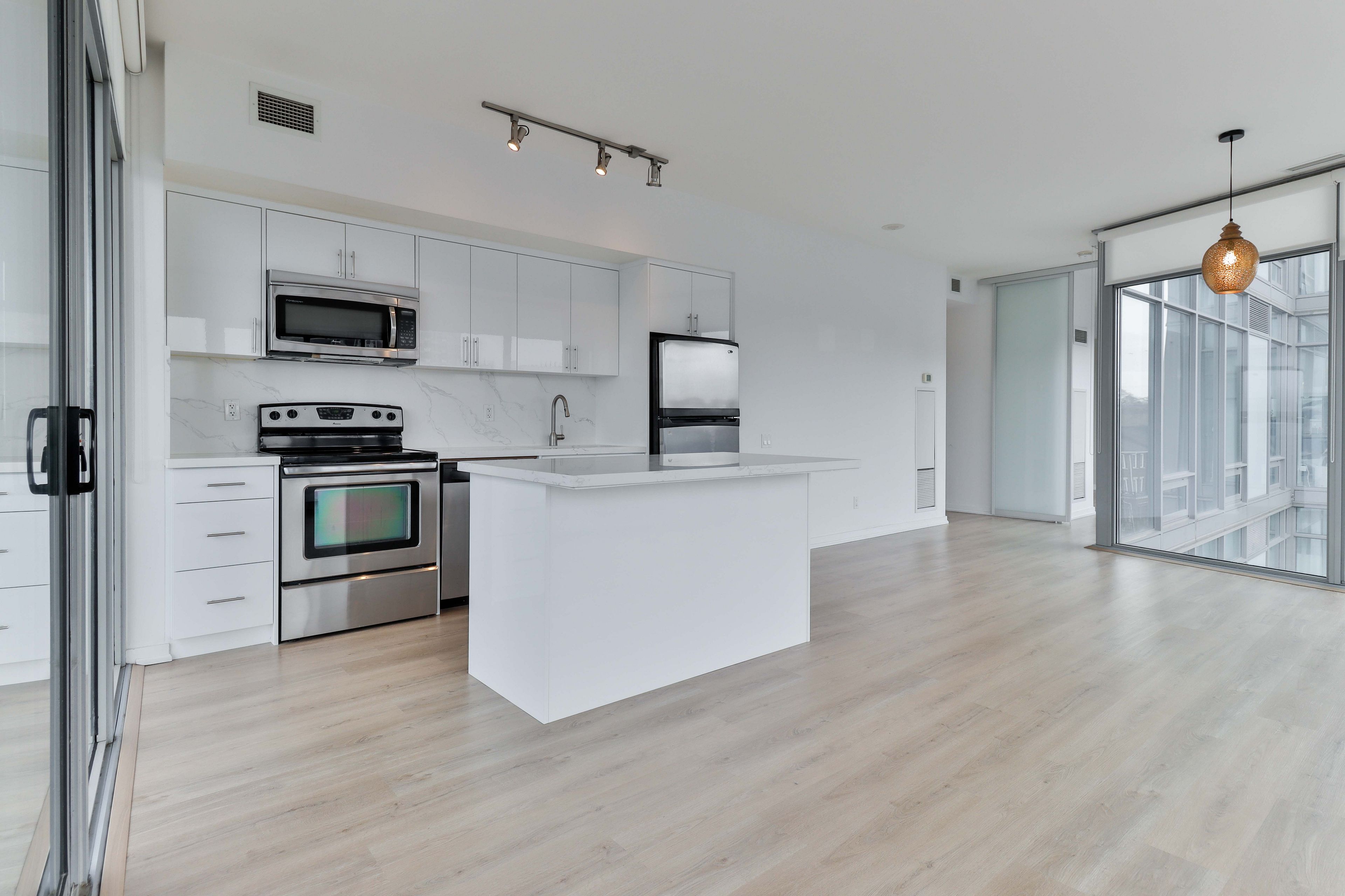 Welcome to nxt condos - the perfect rental opportunity for those seeking style, space, and an unbeatable west-end location. This bright and upgraded 2-bedroom, 2-bath suite offers a functional split-bedroom layout-ideal for roommates, professionals working from home, or anyone who values privacy. With both east and west exposures, you'll enjoy beautiful natural light throughout the day, enhanced by brand new light brown flooring that gives the space a warm, modern feel. The renovated kitchen is designed for everyday living and entertaining alike, featuring quartz countertops, updated cabinetry, and a generous island that flows seamlessly into the open-concept living and dining areas. Floor-to-ceiling windows showcase unobstructed lake ontario views, creating a stunning backdrop whether you're starting your morning or winding down at night. Both bedrooms include custom blinds, with blackout blinds for added comfort and restful sleep. The primary bedroom also features a custom-built walk-in closet, offering exceptional storage rarely found in rental suites. Step outside to your expansive wrap-around balcony with three separate sliding door walkouts-perfect for morning coffee, evening sunsets, or simply enjoying the fresh lakeside air. This lease includes 1 parking space and 1 locker, adding everyday convenience and extra storage space. Residents enjoy full access to resort-style amenities including indoor and outdoor pools, fitness centre, tennis court, party and meeting rooms, and 24-hour concierge service-making it easy to stay active, social, and secure without leaving home. Steps from high park, bloor west village, the waterfront, and with quick access to downtown toronto, this address offers the best of city living and nature at your doorstep. Whether you're commuting to the core, exploring local cafés and shops, or enjoying lakeside trails, everything you need is within reach. Move in and experience elevated rental living in one of toronto's most desirable communities.