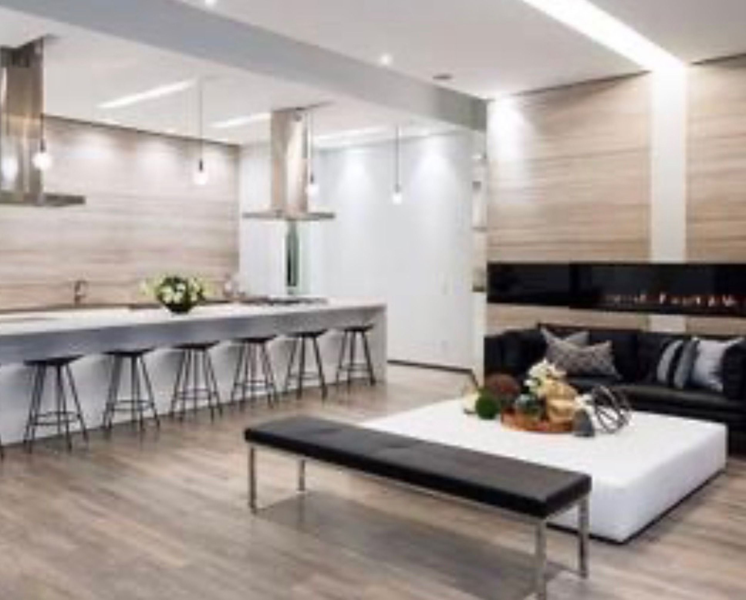 • Modern kitchen with island, stainless steel appliances, and granite countertops.
