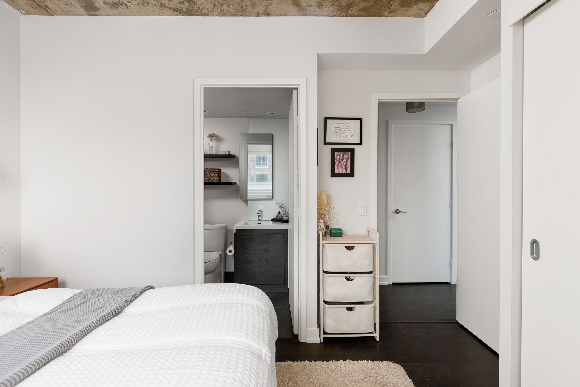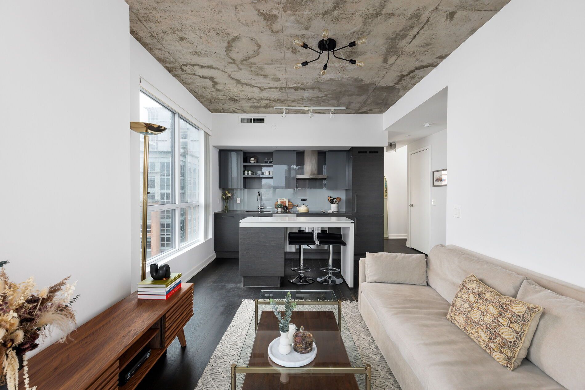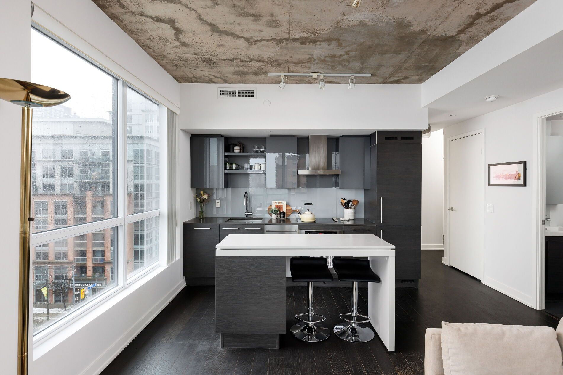 Bright. Airy. Effortlessly cool. This north east corner 2 bedroom, 2 bathroom suite blends modern design with a distinct loft aesthetic and exceptional everyday livability. Featuring 9 foot ceilings, exposed concrete, and expansive windows, the space is flooded with natural light and framed by leafy residential views over queen west, lush and green in the summer, with a subtle skyline in the distance. The open-concept layout is anchored by a sleek kitchen with an island and seating, perfect for morning coffee, casual dinners, or hosting friends before a night out. Thoughtfully designed for everyday ease, the suite offers a functional split-bedroom layout and upgraded closet built-ins that add both style and smart storage. Set within dna3, one of the area's most desirable and well-managed buildings, residents enjoy 24 hour concierge and an impressive suite of amenities including a fully equipped gym, yoga studio, theatre room, party room, and beautifully designed outdoor lounge areas. Pet friendly and community oriented, the building has become a standout choice for those who value design, convenience, and connection. Located directly on the king streetcar line, access to the financial and entertainment districts is effortless, while queen west, ossington, trinity bellwoods, stanley park, and garrison common are all within walking distance. A grocery store right in the building adds everyday convenience to an already exceptional lifestyle. With a 96 walk score and 91 transit score, this is urban living without compromise. For those who want downtown energy, green space for weekend coffee walks, and a refined space to come home to, this is the one.