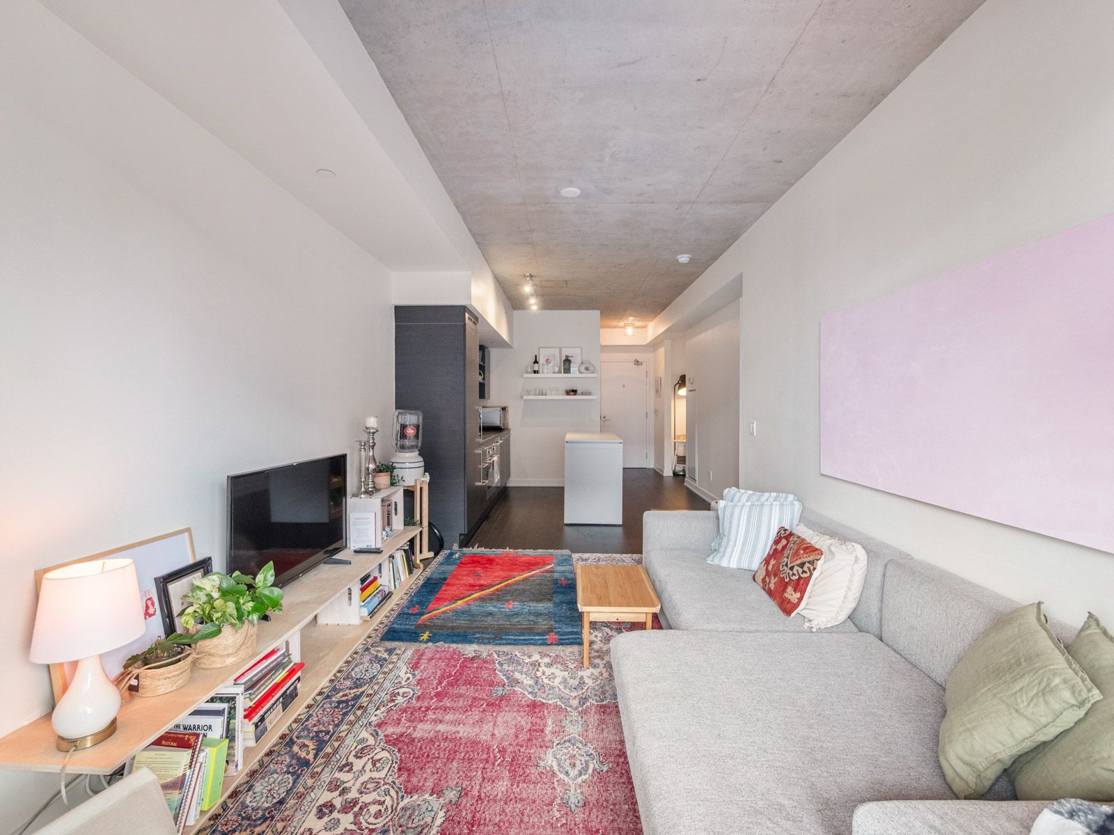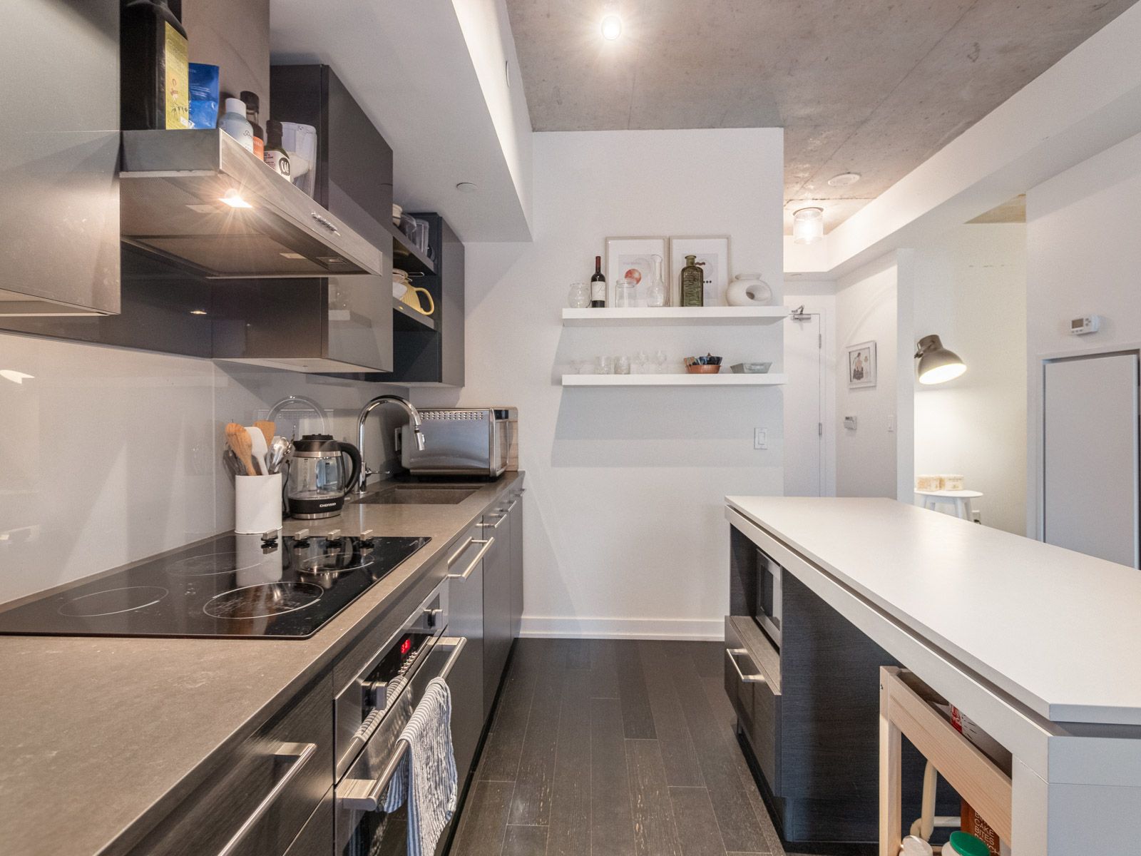• Bright open-concept layout with modern kitchen and private balcony.