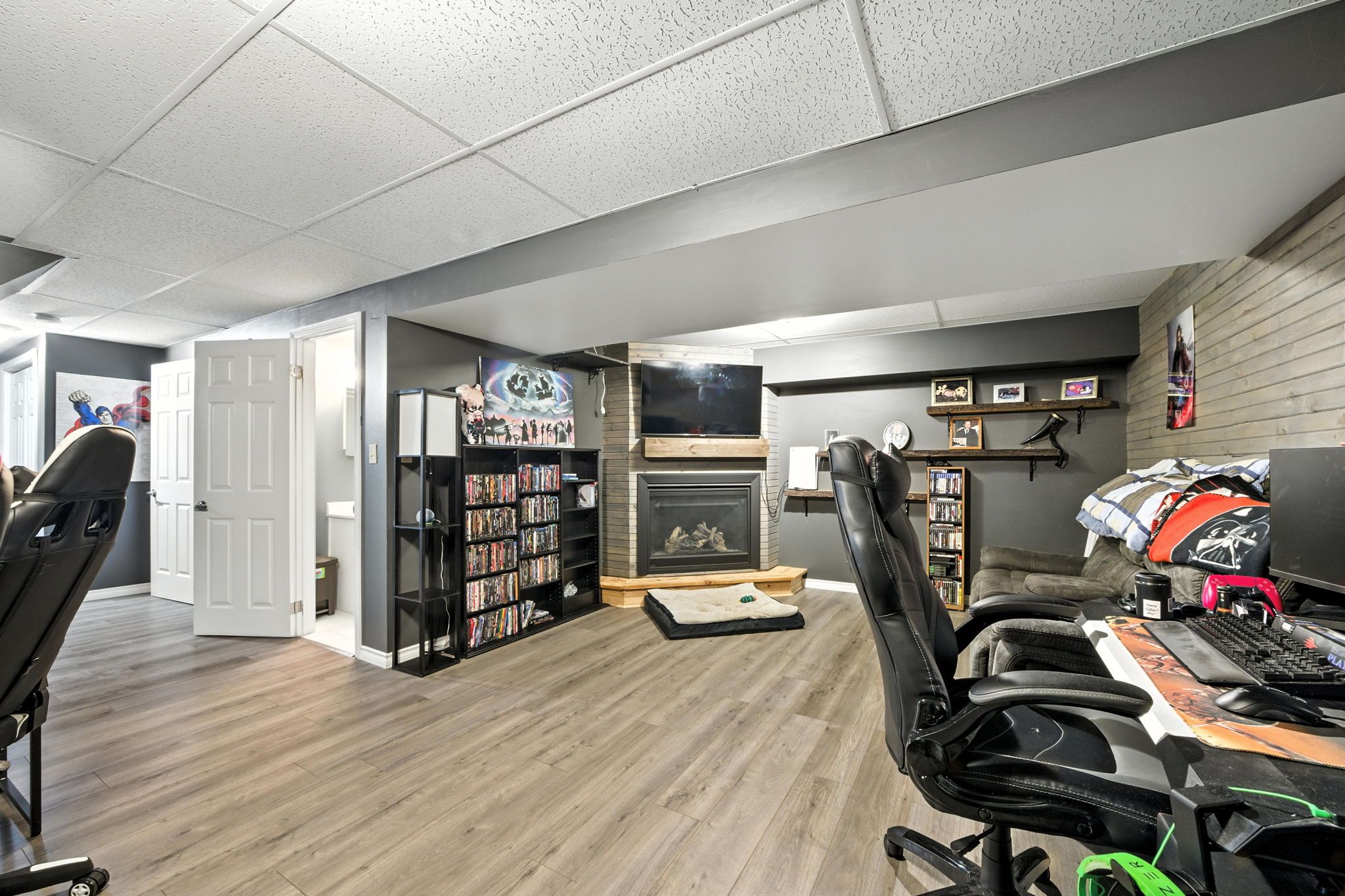 • Finished lower level with a cozy rec-room, gas fireplace, and wet bar.