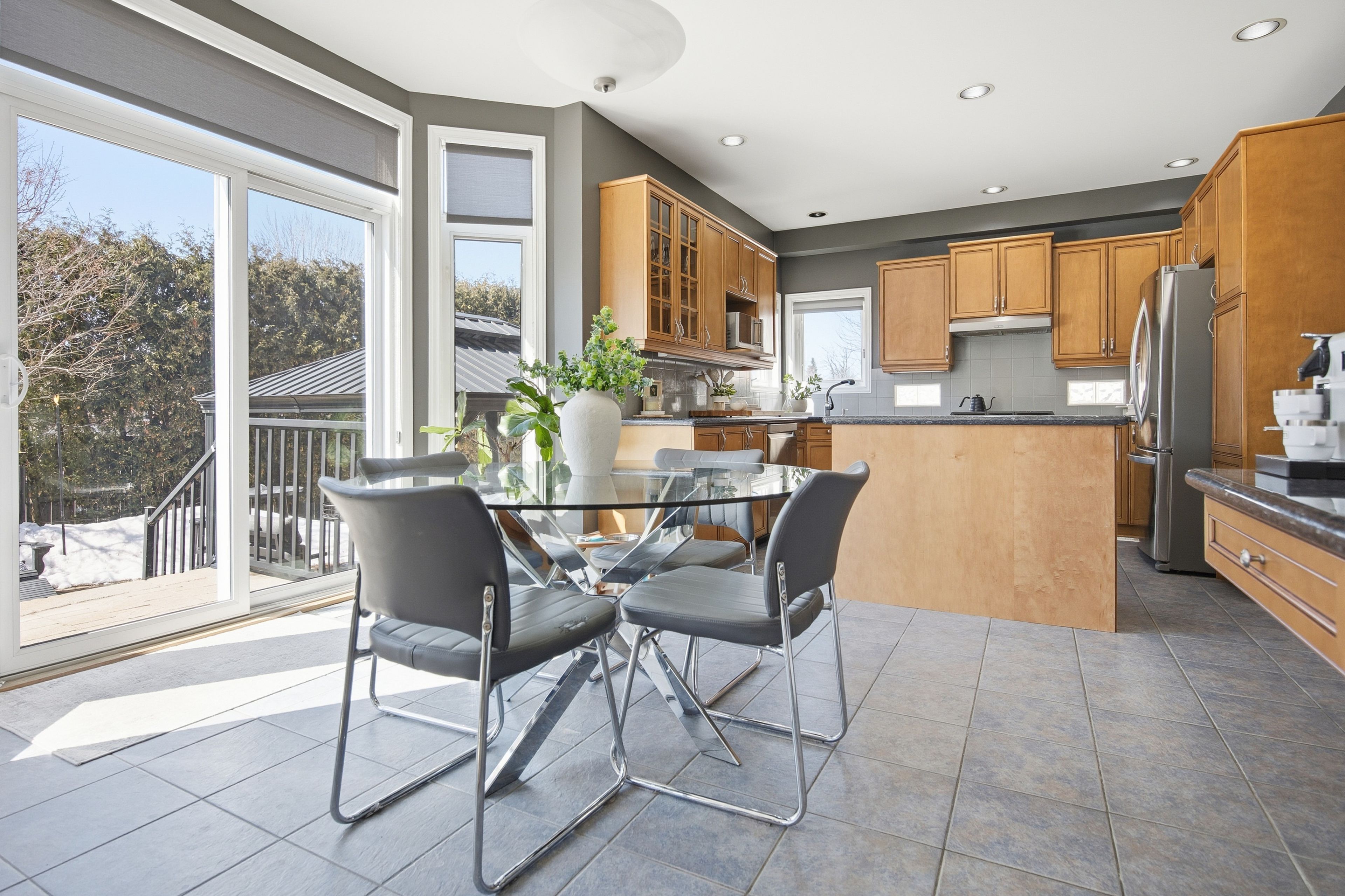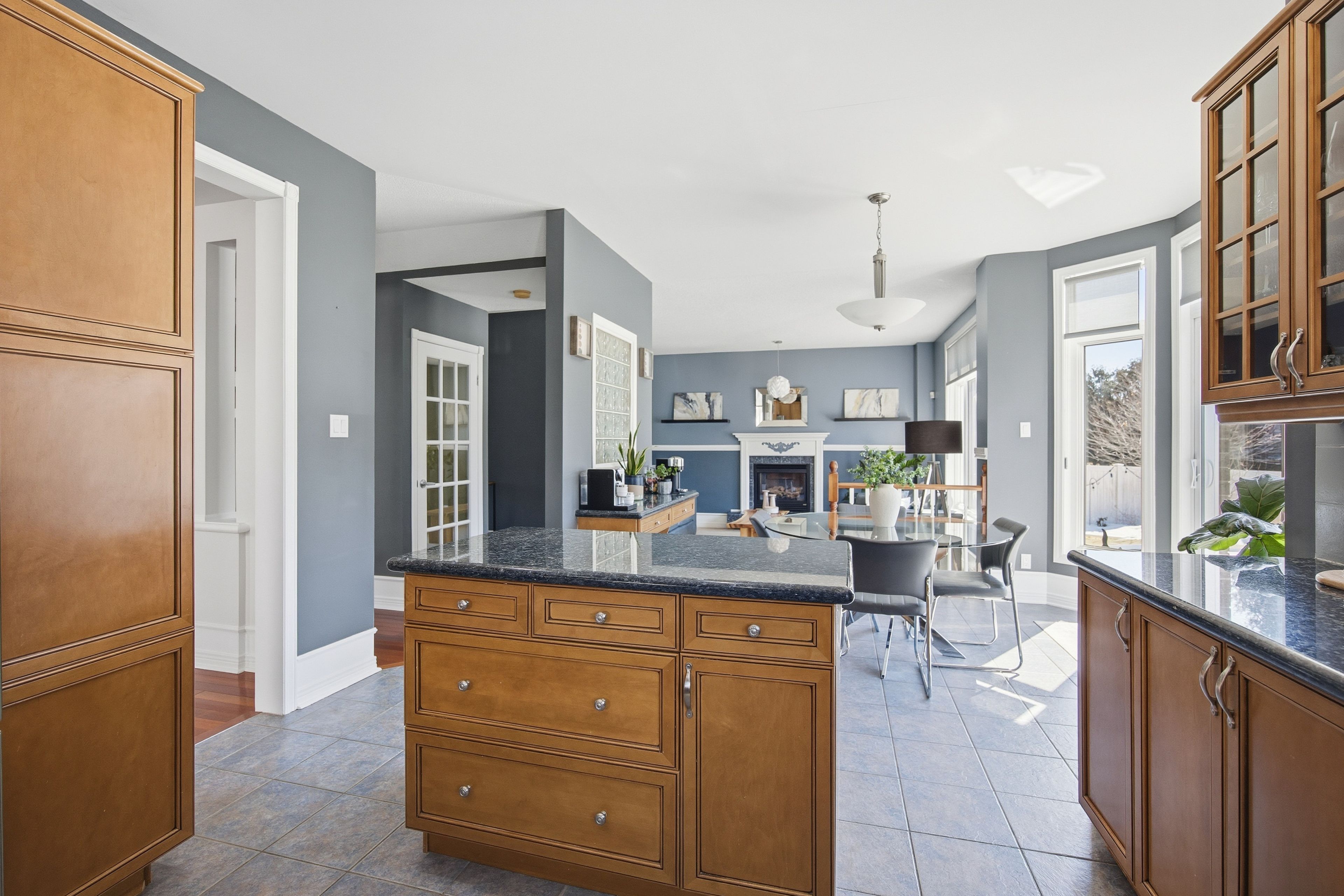• Open-concept kitchen overlooking a bright family room with a gas fireplace.