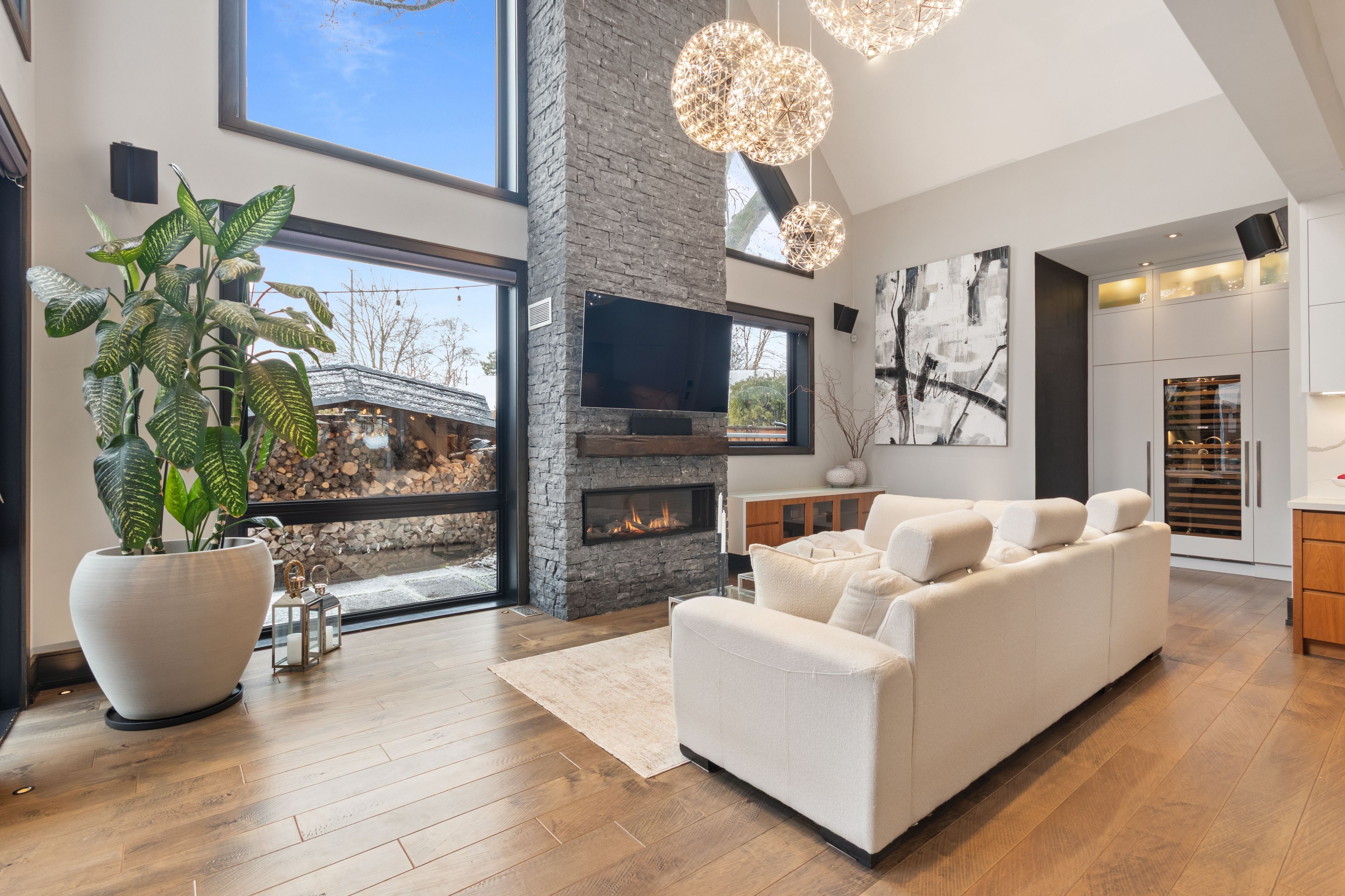 Set in the sought-after clarkson community of south mississauga, this striking custom residence offers over 5,500 sf of luxurious living space with architectural elements and lifestyle amenities designed for the discerning buyer. Thoughtfully designed, the home showcases dramatic ceiling heights, skylights, expansive windows, b/i speakers and rich hand-scraped maple hardwood flooring throughout. Upon entry, the home unfolds into an impressive open living space defined by a soaring double-height ceiling and floor-to-ceiling stone fireplace, creating a stunning focal point filled with natural light. Designed for both everyday living and entertaining, the chef-inspired kitchen features a large calacatta marble waterfall island, premium built-in appliances and a beautifully appointed butler's pantry w/ heated floors and convenient garage access. Above, a sunlit loft w/ custom built-ins overlooks the living space below, offering a quiet retreat for reading or work beneath the skylights. The primary suite is elevated by vaulted ceilings w/ exposed beams, a private sitting area and a two-way fireplace shared w/ the spa-inspired ensuite featuring a freestanding tub, glass shower and walk-in dressing room. Two additional bedrooms on this level offer bright, well-proportioned spaces with the same attention to details, while a main floor bedroom w/ walk-in closet and ensuite provides the ideal guest suite. The lower level completes the home with spaces tailored for recreation and gathering, including a theatre lounge, games area, custom wet bar, wine cellar and full bath, all wrapped in warm textures of brick, stone and wood. Outdoors, the private backyard extends the entertaining experience w/ a covered lounge, outdoor service bar, built-in bbq, hot tub and generous deck space designed for relaxed evenings and summer gatherings. Situated minutes from lake ontario waterfront parks, rattray marsh trails, clarkson go, clarkson village shops and dining, and top-ranked schools.