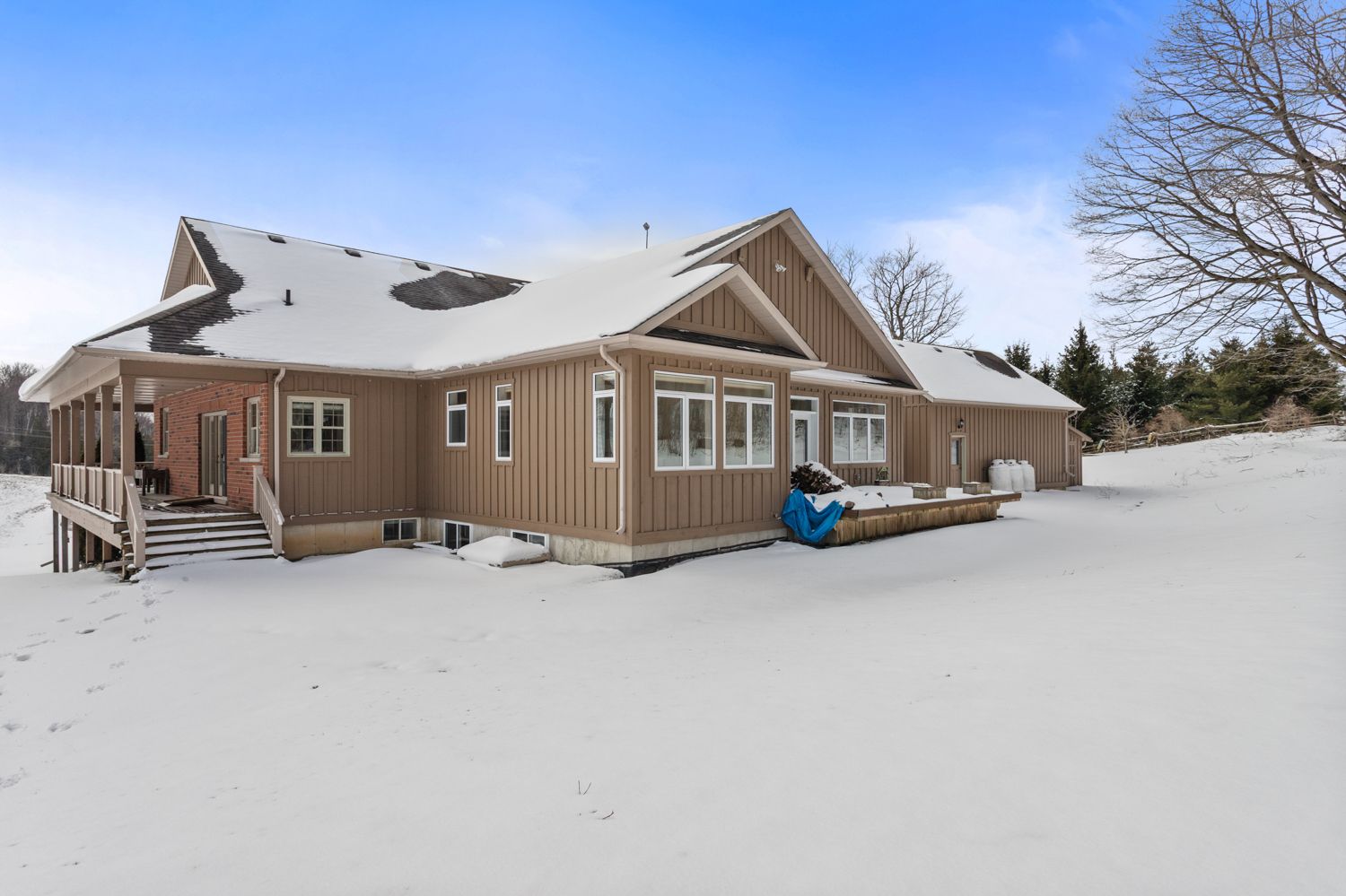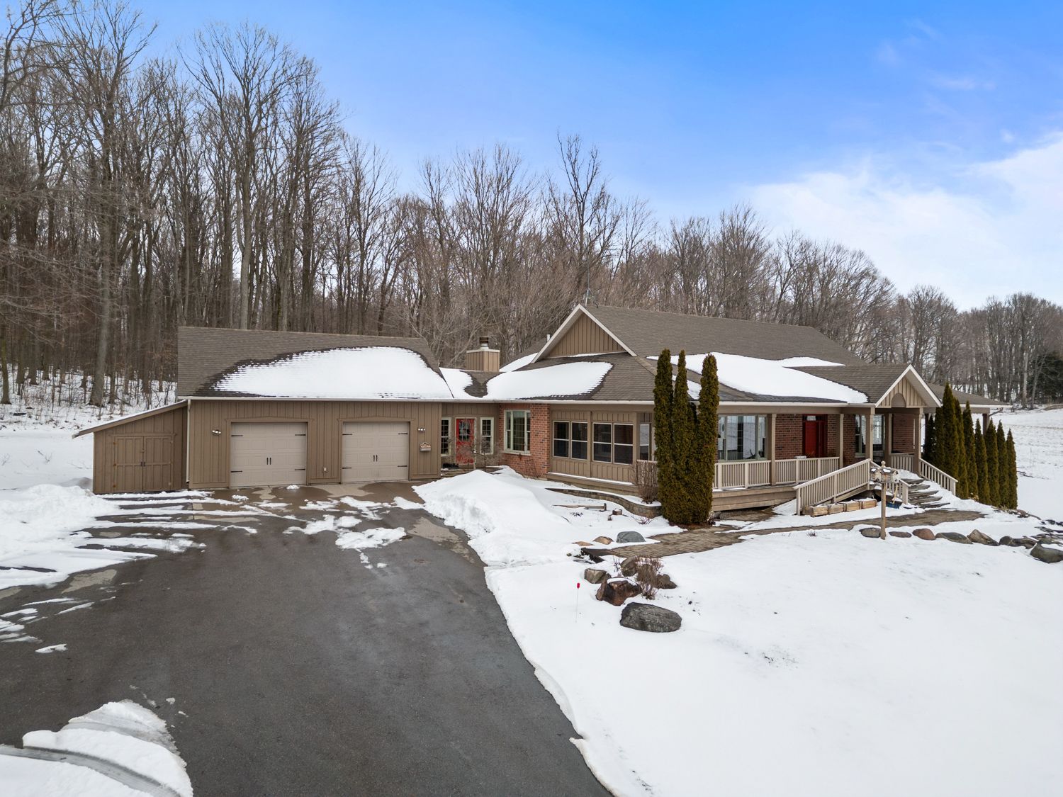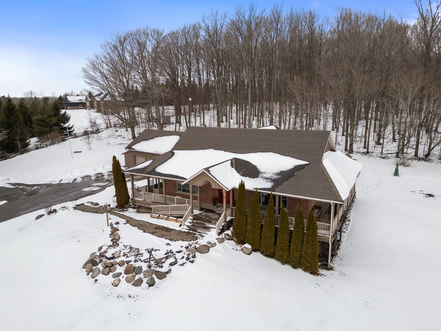 This stunning, elegant country estate sits on over 100+ acres, featuring scenic landscapes, natural rolling hills, dense forest, and over 48 acres of farmland, panoramic views from every area on this picturesque property. A slightly winding driveway, traditionally designed with a wraparound porch, greets you, creating an immediate sense of belonging. This bright bungalow provides the perfect backdrop for country living, suiting many buyers' personal needs or desire for privacy. Enter through the main doors into a foyer with views to the family room, dining room and the oversized custom kitchen, which opens into the vaulted addition on the north side of the house. This well-designed 5-bedroom, 5-bathroom home features extensive custom modifications and updates. For those requiring mobility assistance, the addition of an elevator and accessibility modifications creates a beautiful opportunity to age in place or accommodate multi-family or generational living arrangements. The primary suite is equipped with a walk-in shower, access to the east-side porch and elevator. Bright bedrooms, a large entry mudroom, storage with interior access to the garage, main-floor laundry, multiple points of entry, fireplaces with custom mantels and so many other thoughtful attributes. As you walk into the main floor family room, the entire house feels uplifted. You have absolute privacy as you peer out every window, seeing only your own property, which includes an additional bedroom, high-end finishes, and a walkout to the landscaped grounds and pond. A true oasis, the property comprises the perfect mix of hardwood, fields (or pasture if desired). Opportunities are endless if you wish to pursue farming dreams, live in complete peace or accommodate your entire family all under one roof-a true one-of-a-kind property. Just minutes north of cobourg, on the outskirts of baltimore-one of northumberland county's most desirable hamlets-welcome home!