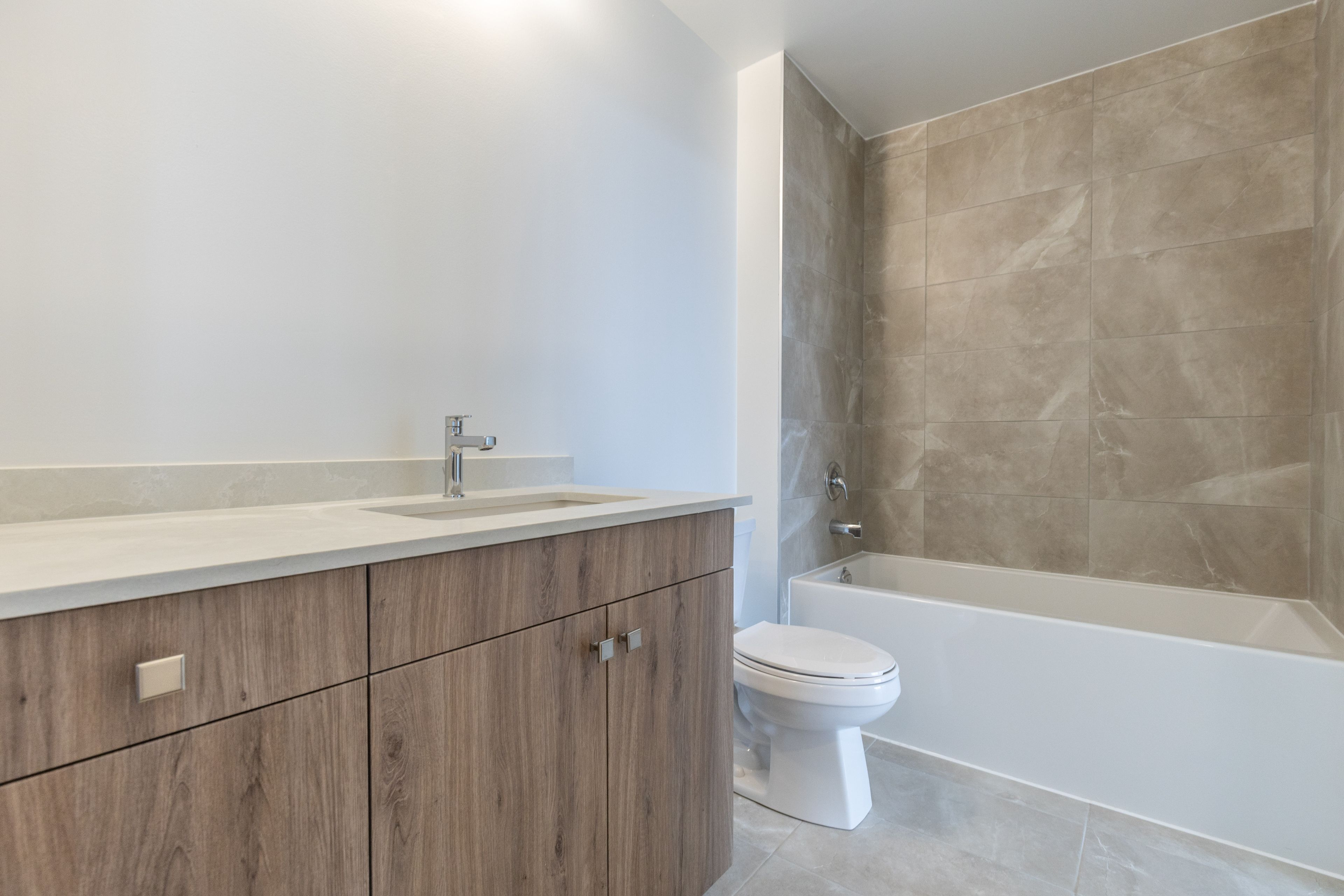 • Modern kitchen with quartz countertops and large island.