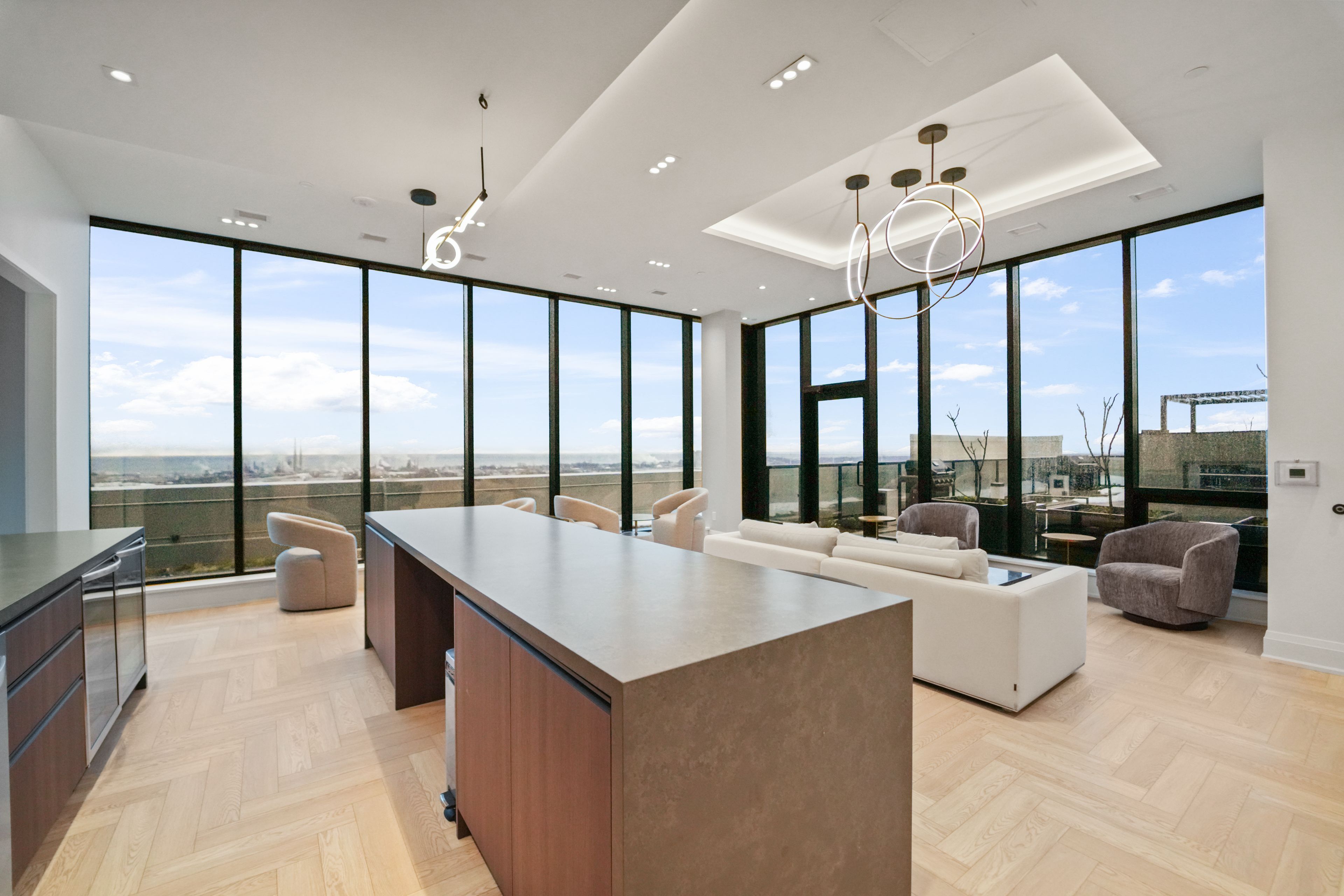 • Bright open-concept living space with floor-to-ceiling windows.