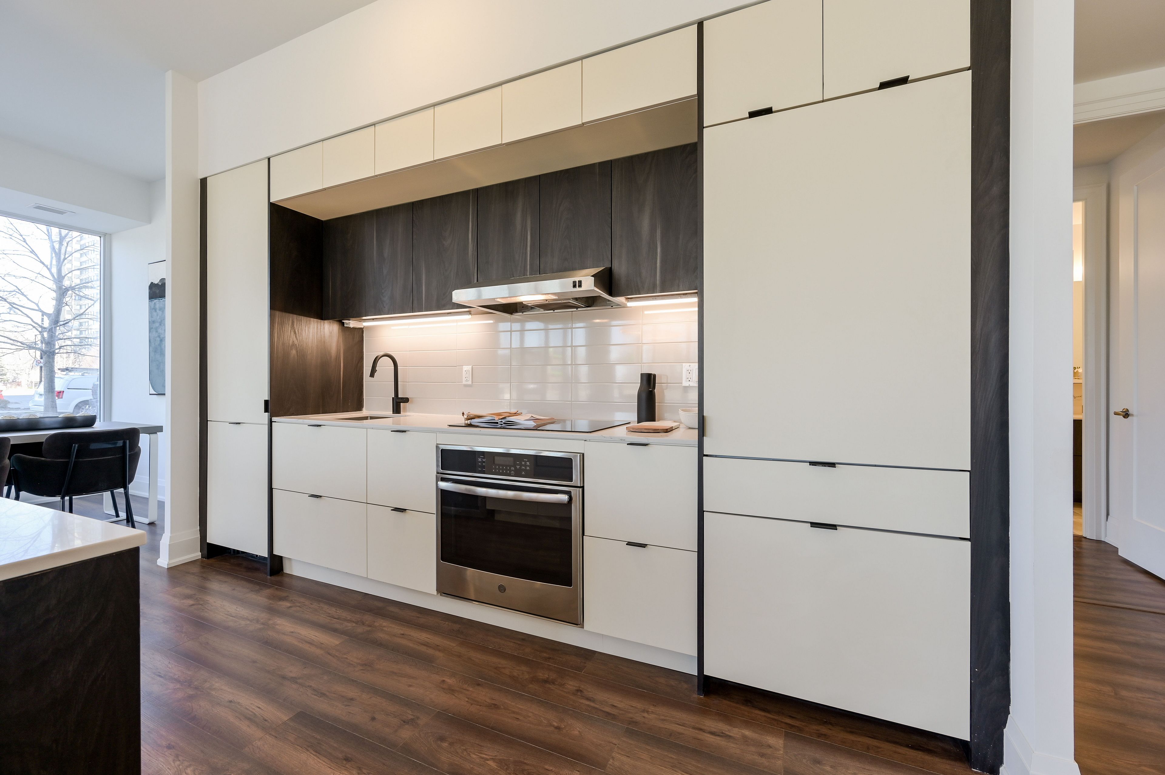 • Contemporary kitchen features stainless steel appliances and sleek quartz countertops.