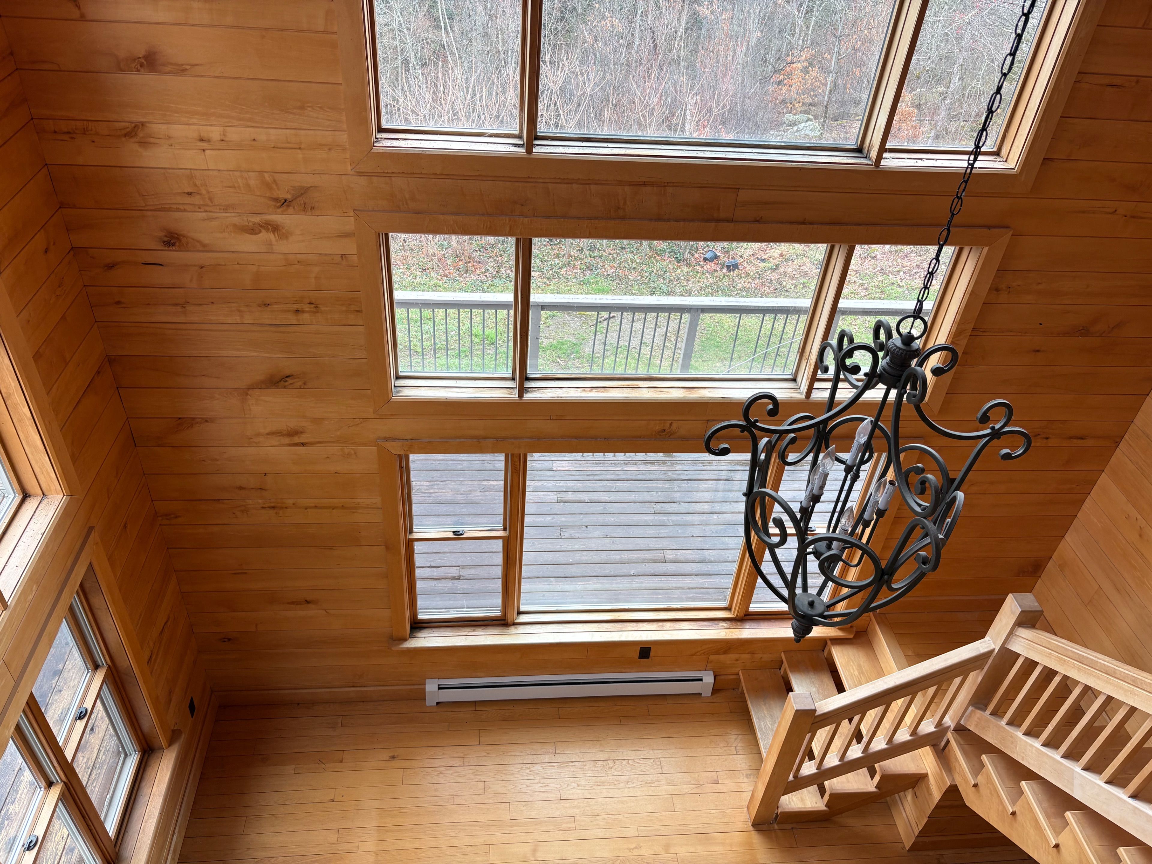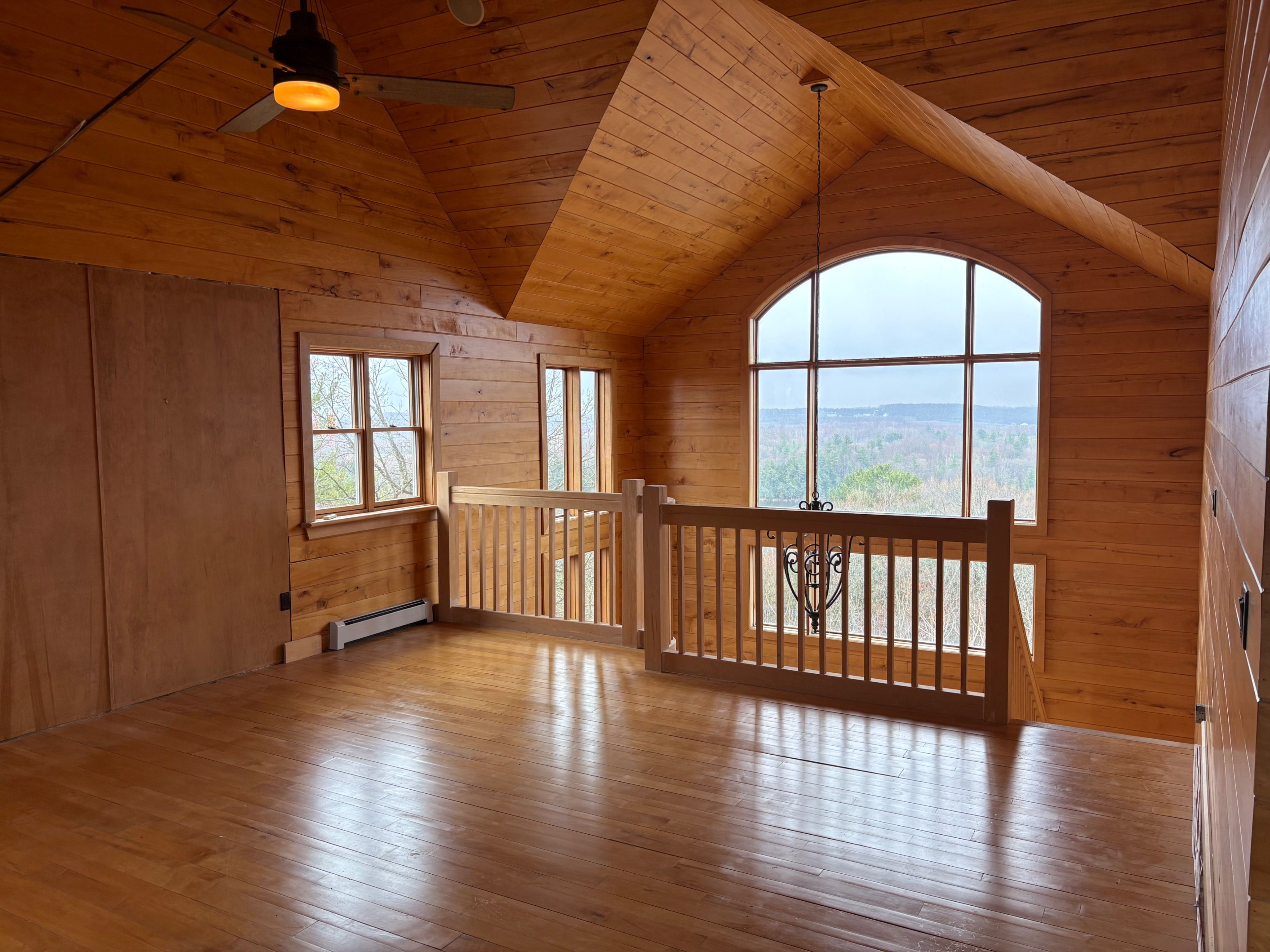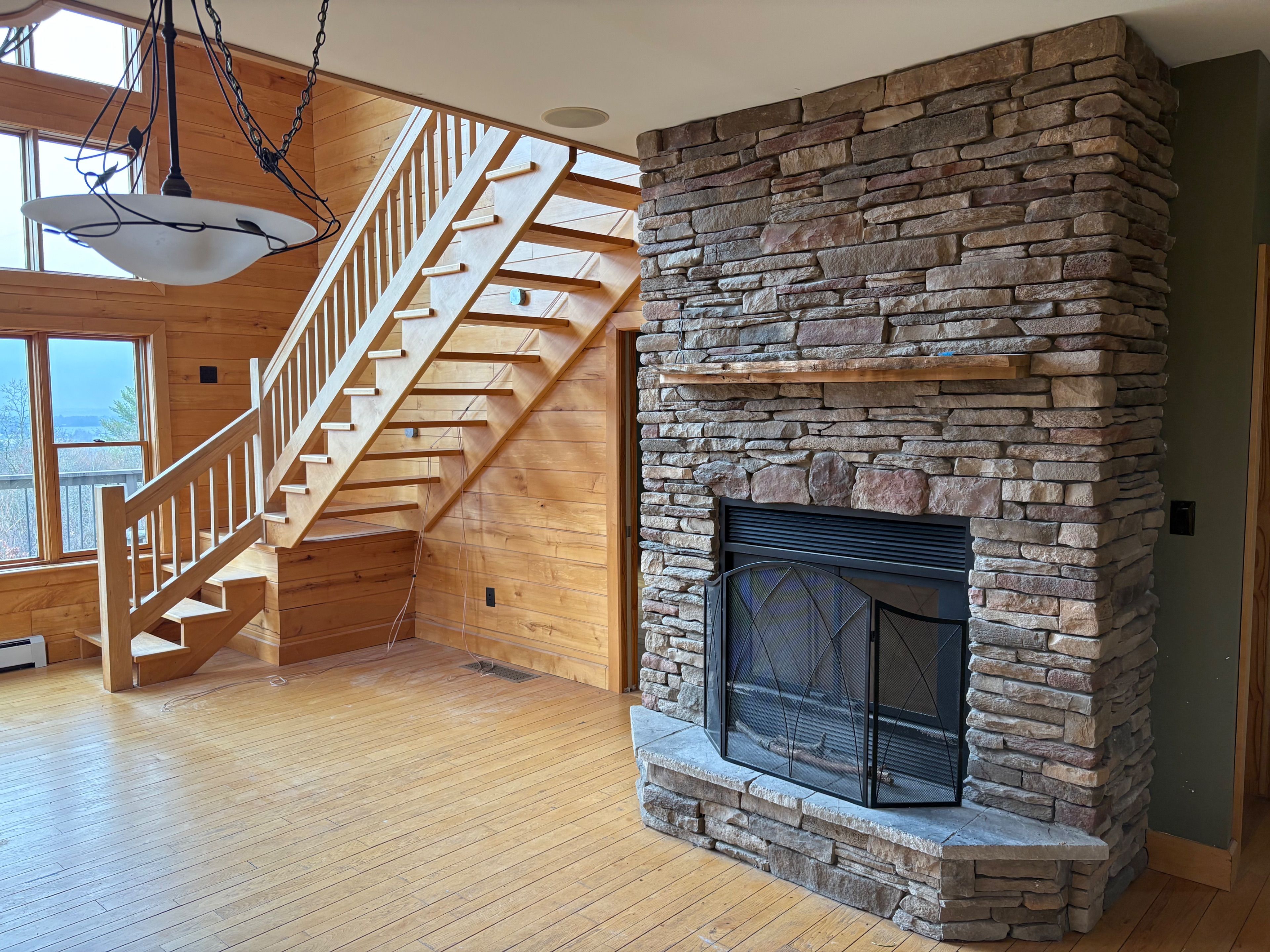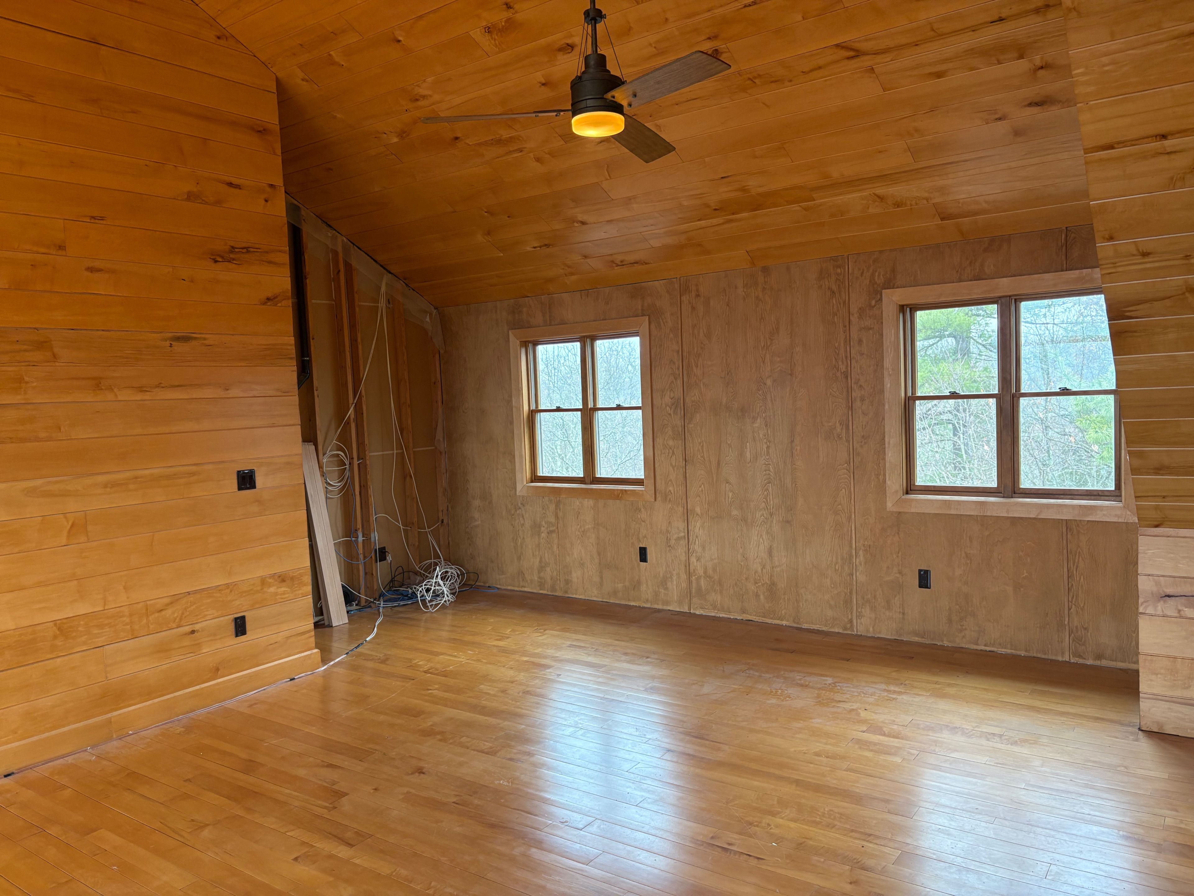 • Chalet-style interior featuring hardwood floors and tongue-and-groove walls.