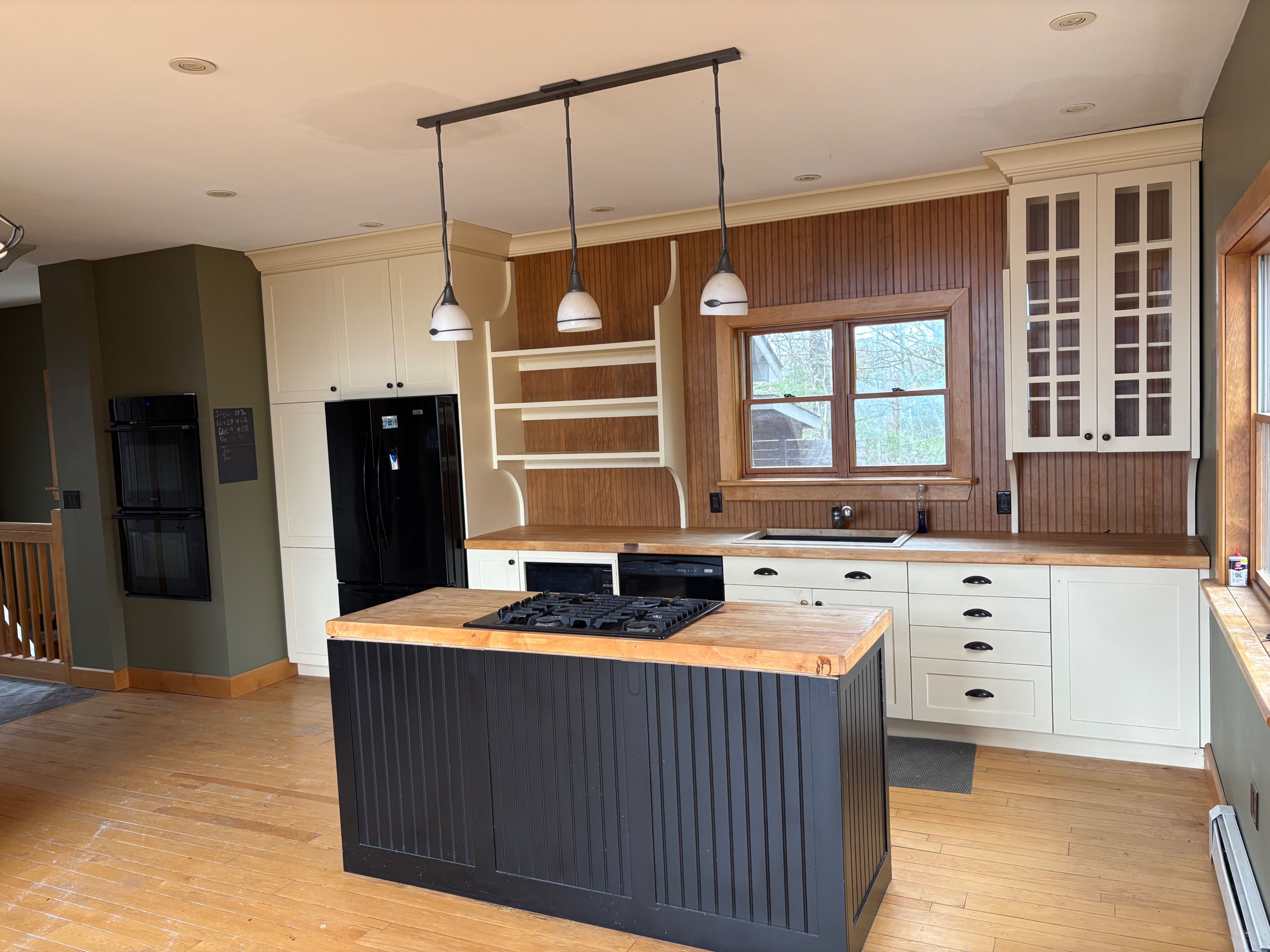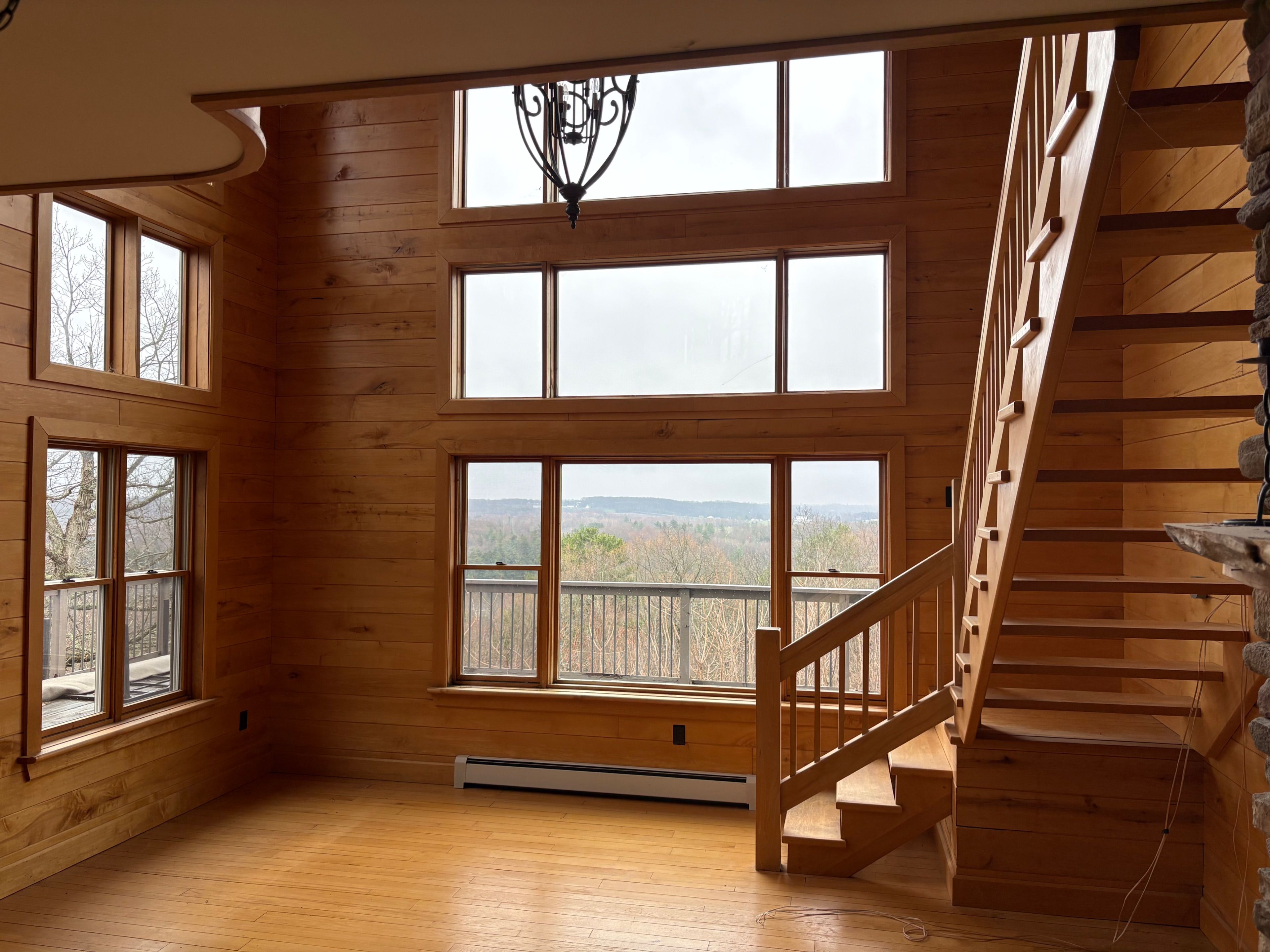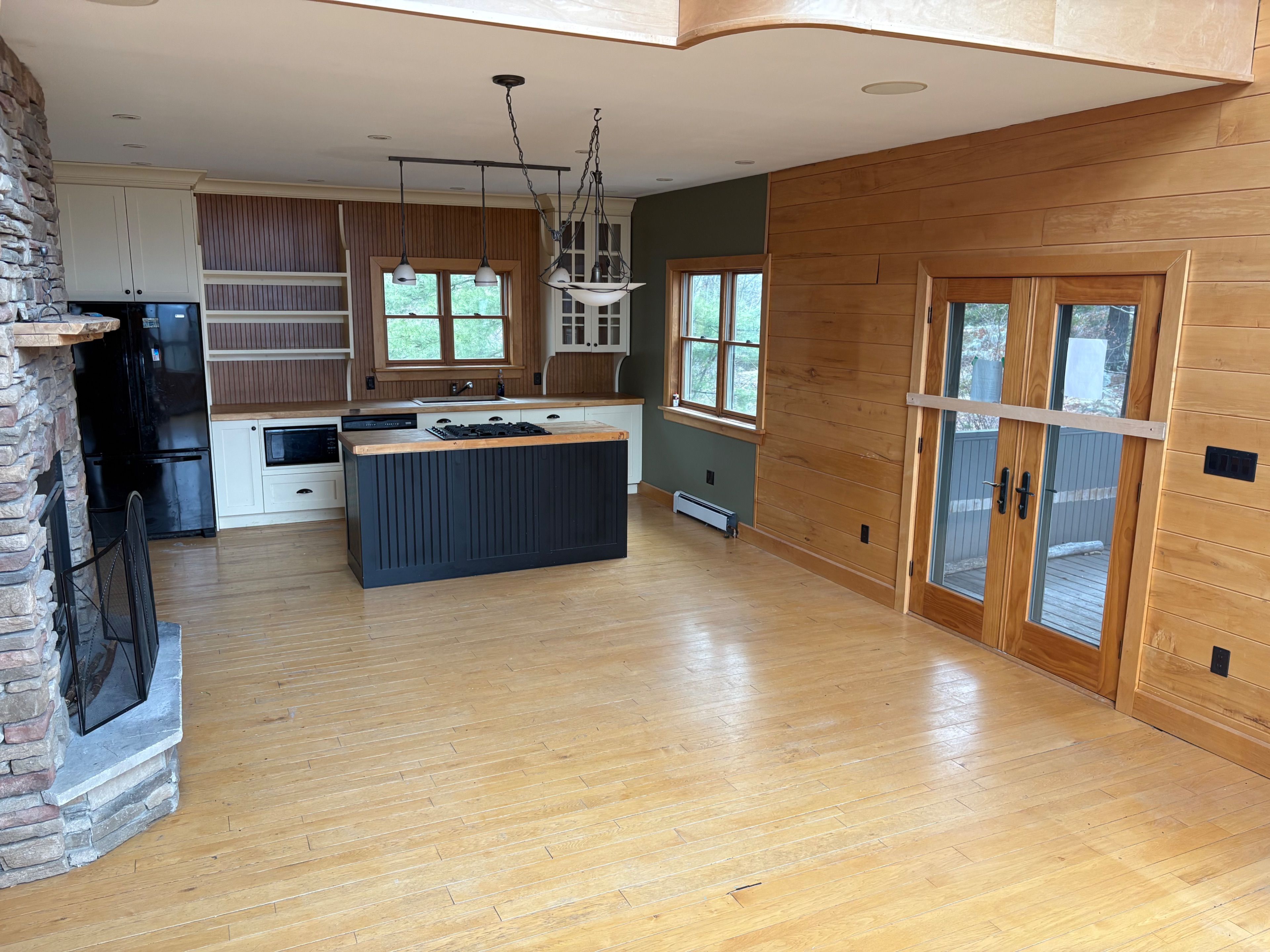 • Chalet-style interior featuring hardwood floors and tongue-and-groove walls.