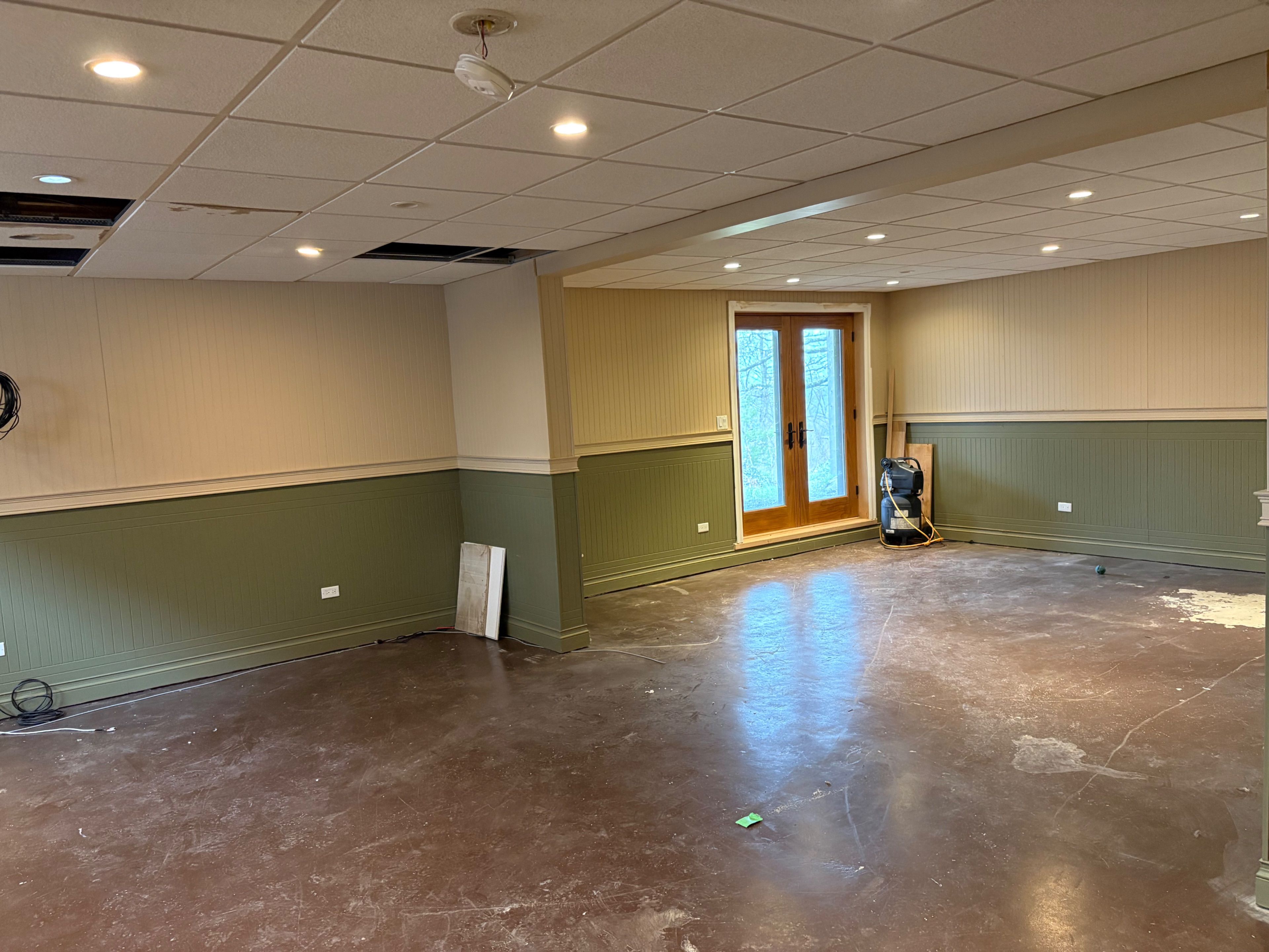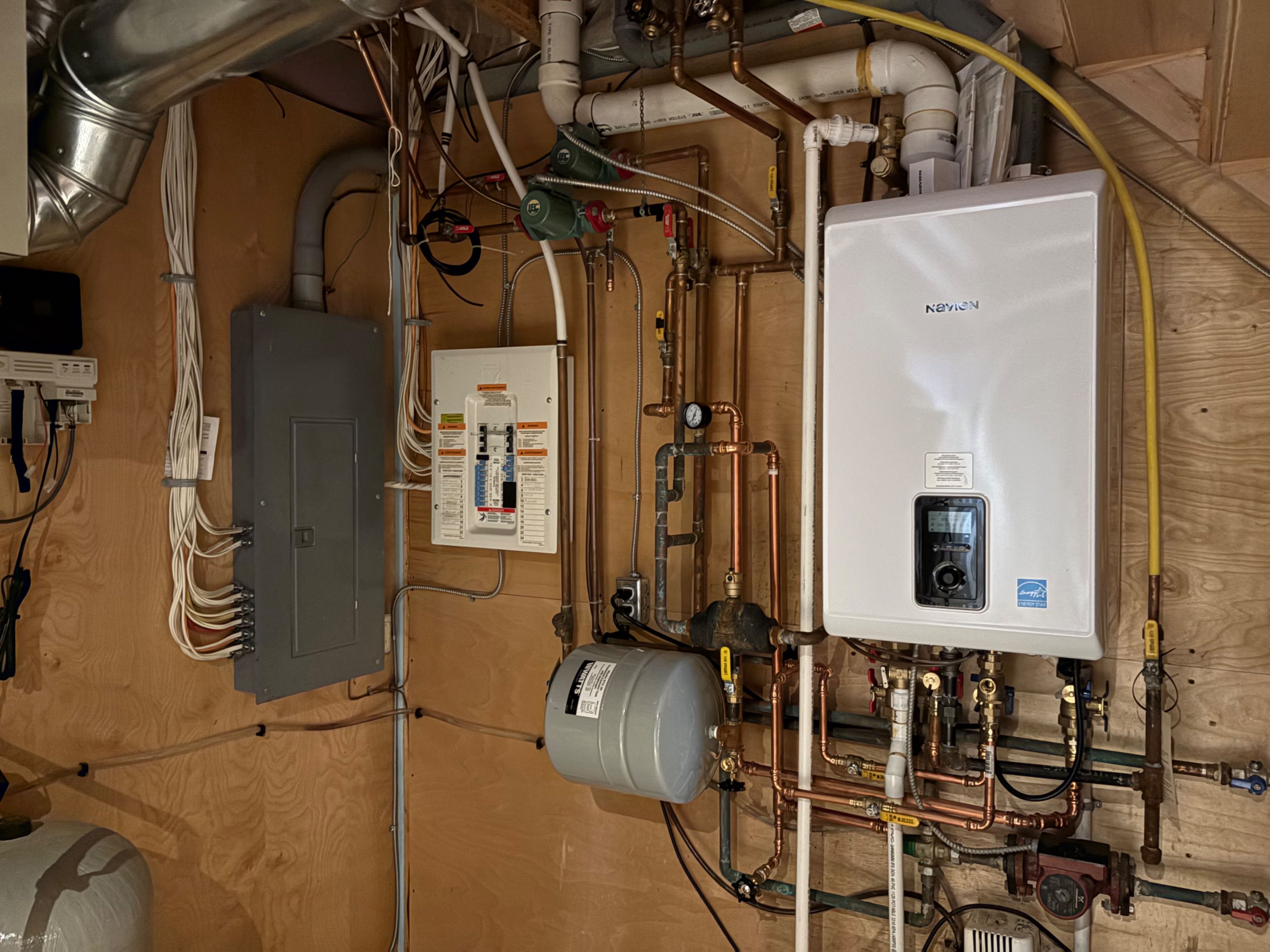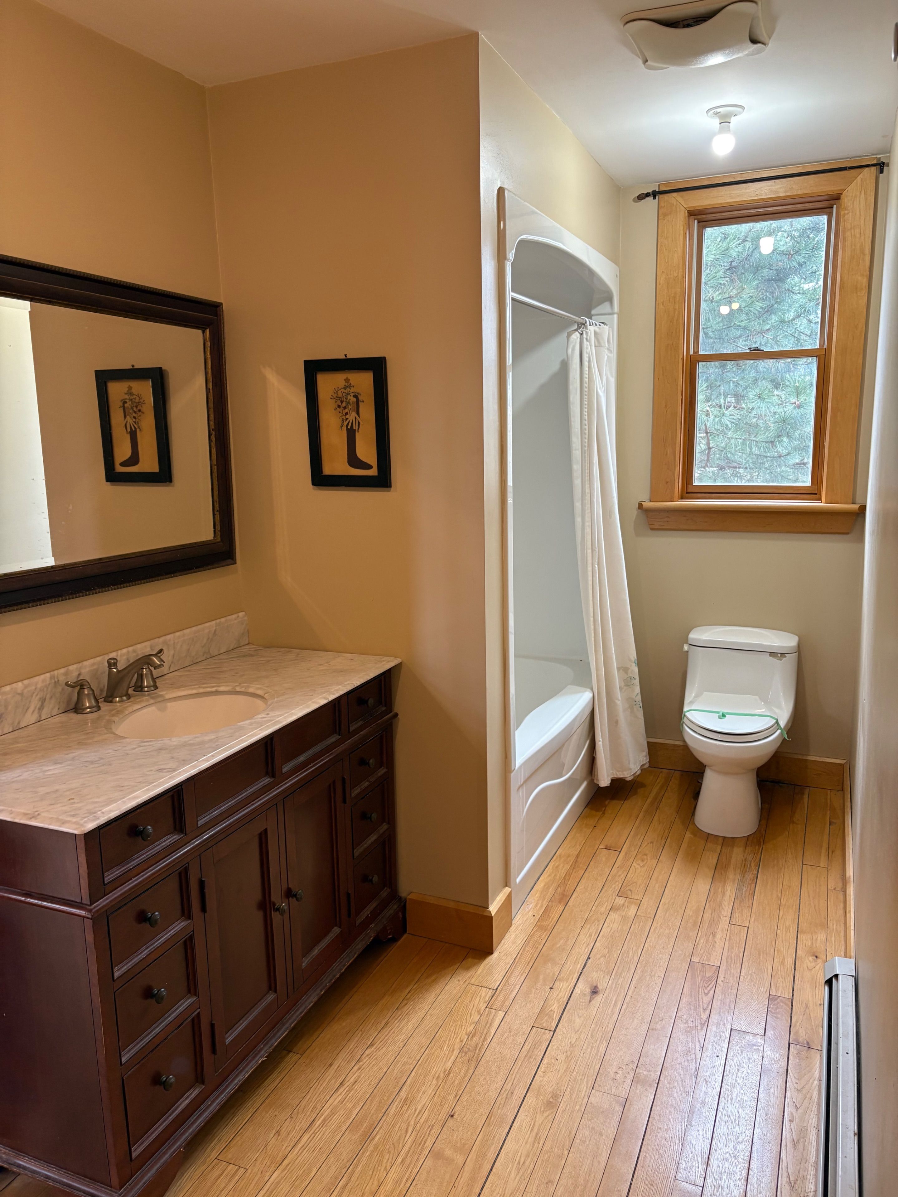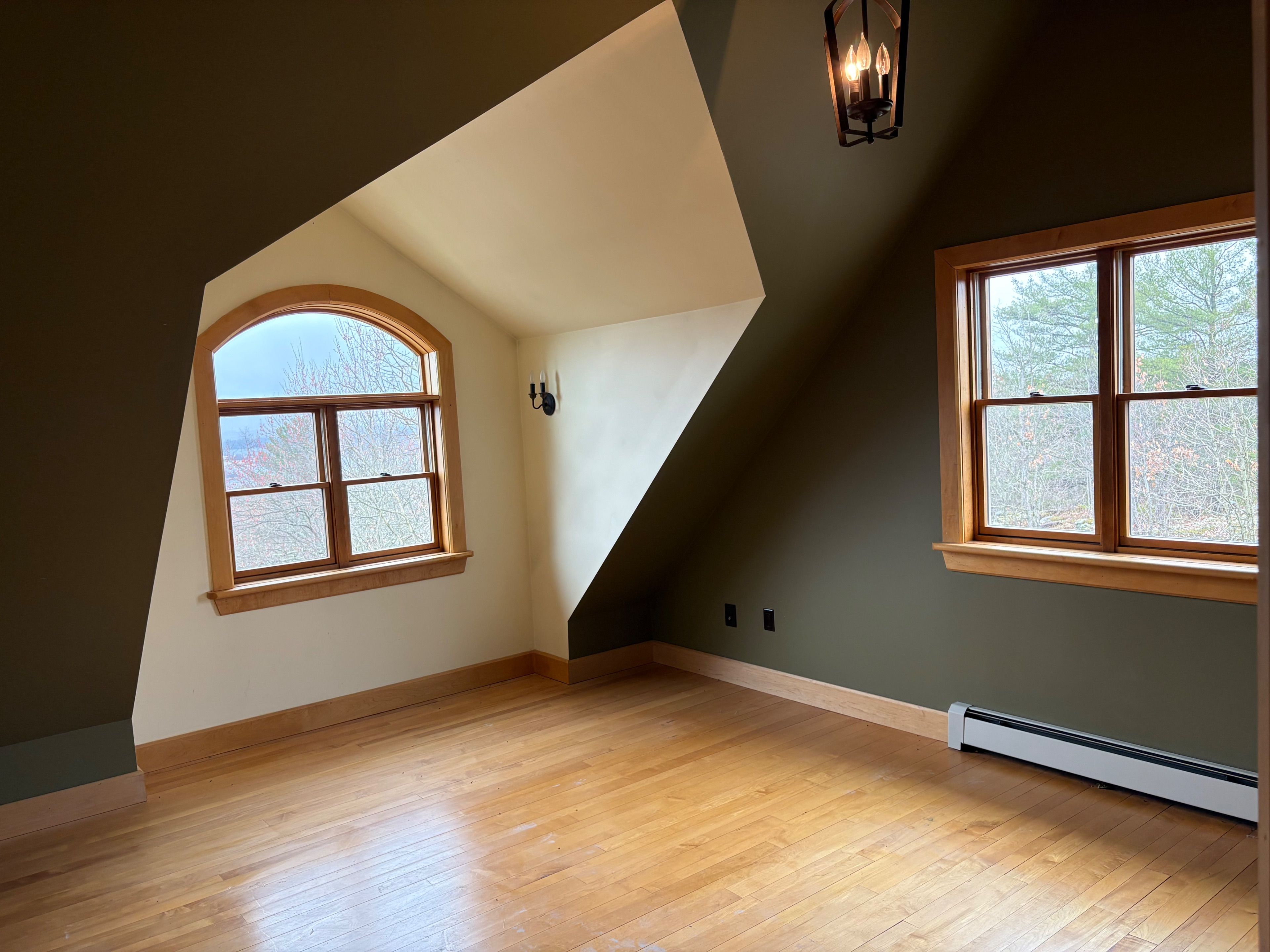 • Chalet-style interior featuring hardwood floors and tongue-and-groove walls.