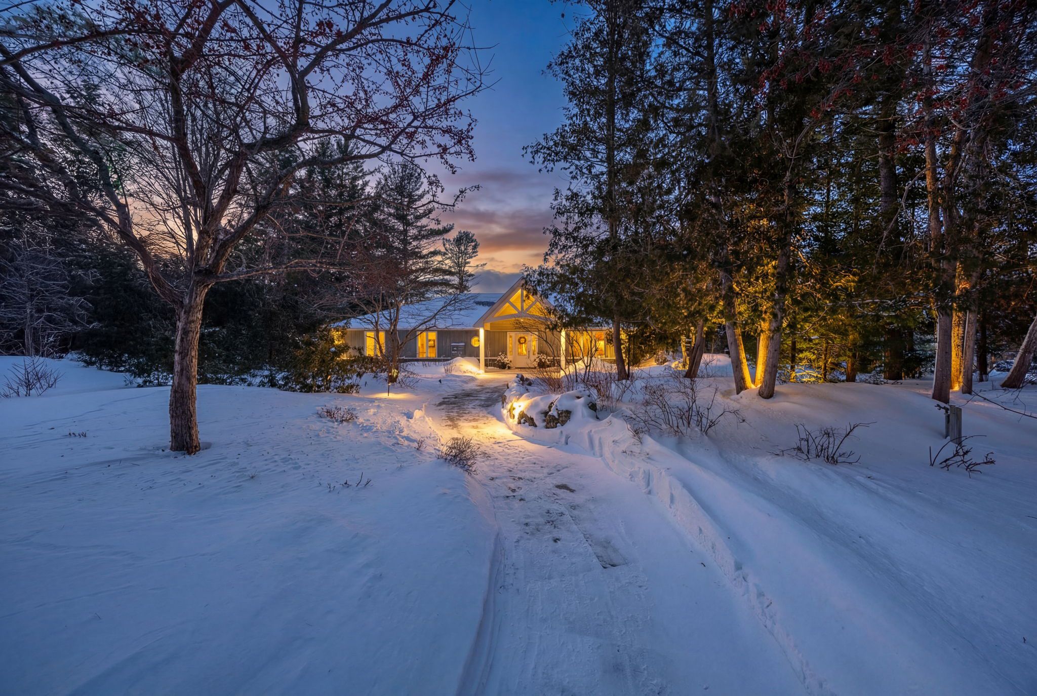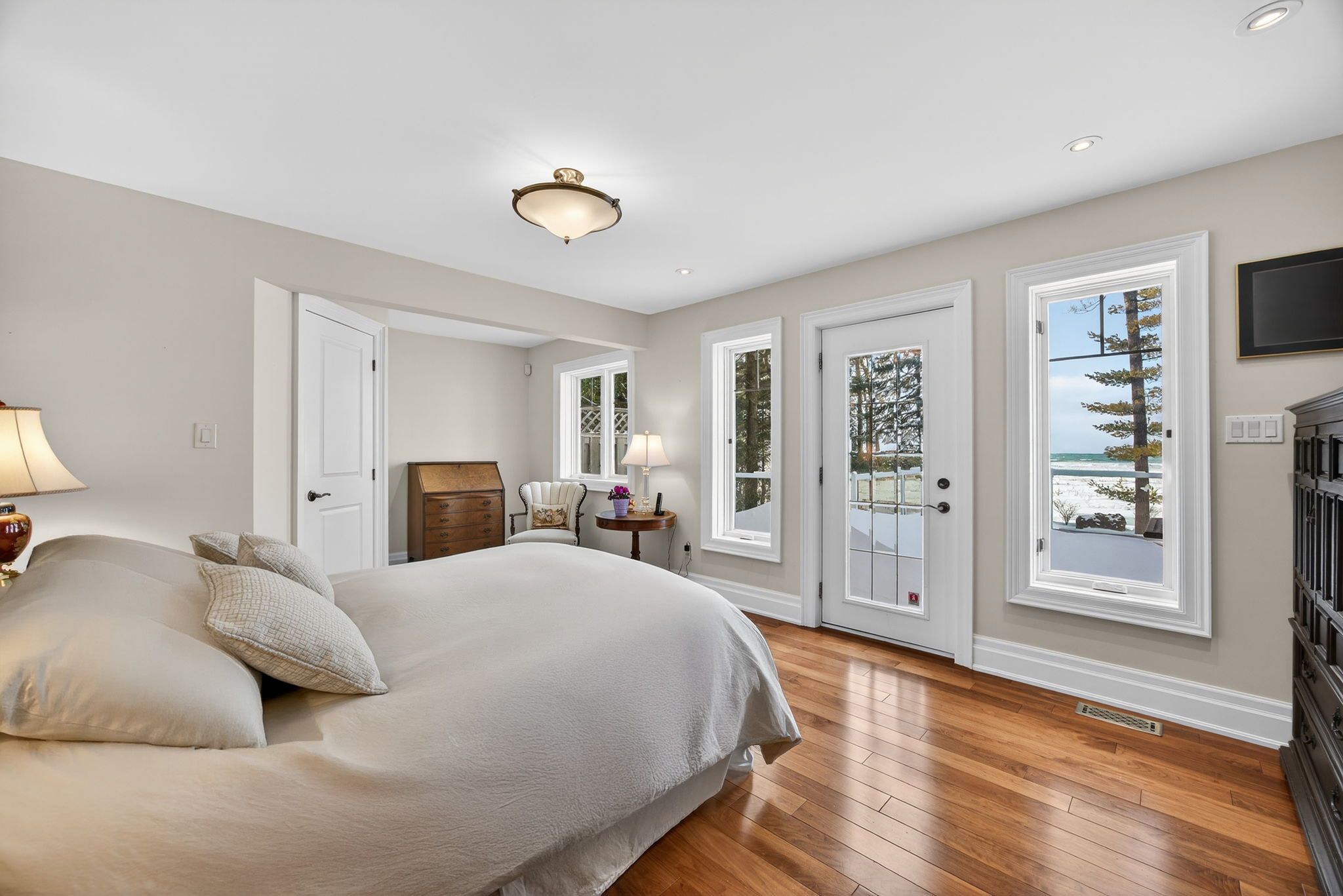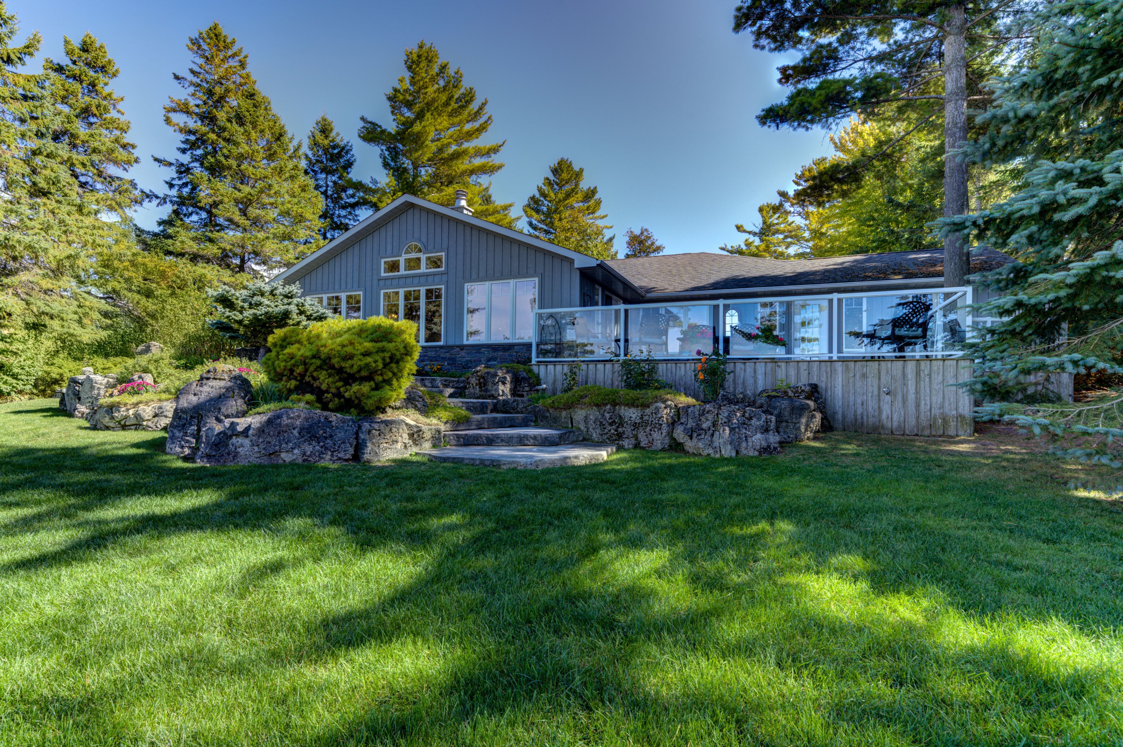 Set along the iconic sandy shoreline of wasaga beach with immediate beach access, enhanced by the privacy of a quiet sandy road, this custom bungalow offers a rare blend of refined craftsmanship and natural beauty with panoramic views across georgian bay to blue mountain. Spectacular sunsets paint the sky creating breathtaking scenes in every season. Professionally landscaped grounds span over 1/2 an acre and are framed by mature trees, impressive limestone boulders and meandering walkways through perennial gardens creating a sanctuary that feels natural but refined. This one-floor residence of over 2,800 square feet is thoughtfully designed for effortless living and entertaining. Throughout the home, sunlight streams through oversized casement windows. The open-concept living and dining areas, enhanced by walnut flooring and a vaulted ceiling, are anchored by a striking dual-aspect marble-clad gas fireplace. The expansive gourmet kitchen features granite countertops, an oversized double sink, full-height cabinetry with under-cabinet lighting, a generous pantry and premium appliances including a bluestar six-burner gas range and miele fridge/freezer. The two-tiered prep/entertainment island provides seating for five or more. The primary suite is a private retreat that features bay views, access to a secluded deck, a walk-in closet with window, a spa-inspired ensuite with heated floors, granite counters and an oversized marble-tiled shower with granite bench, rainfall showerhead and body jets. Three additional large bedrooms and two three-piece bathrooms provide comfort for family or guests. Outdoor living is enhanced by an expansive lounging and dining deck offering breathtaking lake and stunning sunset vistas. An oversized detached two-car garage and large driveway provide ample parking. This beautiful and unique home ensures tranquil and pleasurable living immersed in the beauty of each season.