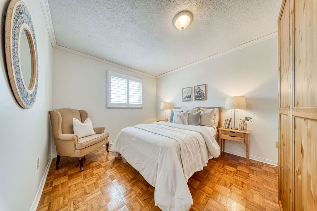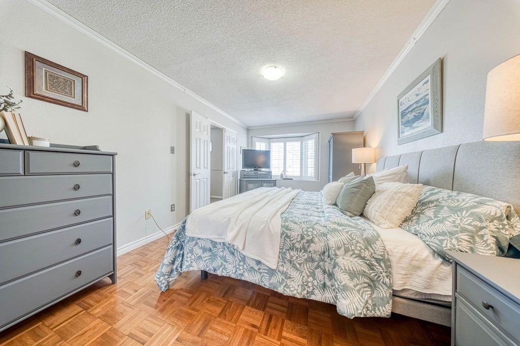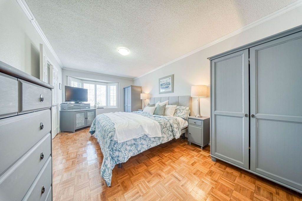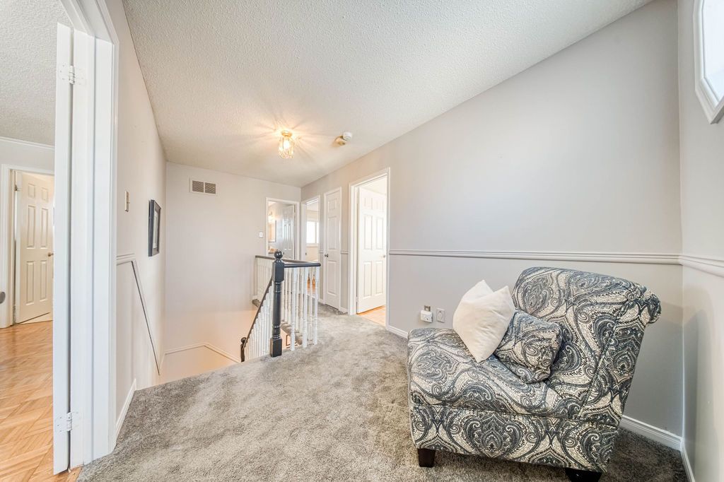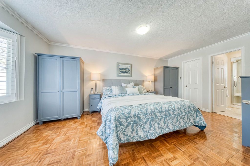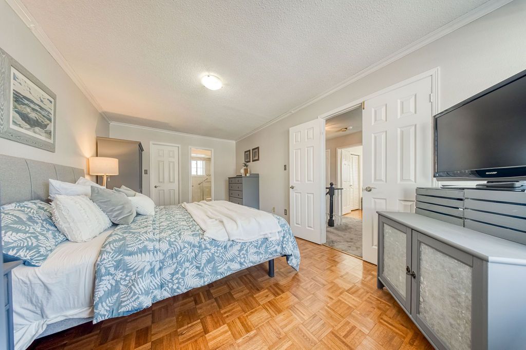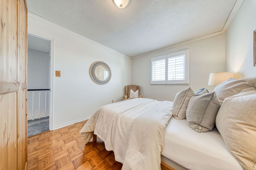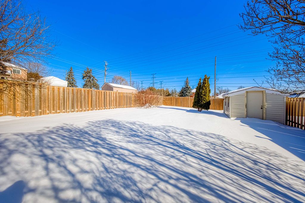 This wonderful three-bedroom home sits on a generous, pool-sized lot (12 meters x 42. 26 meters) and shows true pride of ownership throughout. The kitchen features newer cabinetry, including a pot cupboard and pantry, complemented by corian countertops and a stylish glass-stone backsplash. A sliding glass door leads to a spacious deck that spans the width of the home, the perfect spot for enjoying your morning coffee in the spring and summer. A backyard shed provides additional storage. The living and dining rooms offer hardwood flooring and large windows that fill the space with natural light. The second floor primary bedroom includes walk-in closet and a private 3-piece ensuite. All bedrooms features parquet flooring. All bathrooms in the home have been tastefully update. There are california shutters throughout. Major updates include the roof, eavestroughs, and windows. This home shows beautifully and is move-in ready.