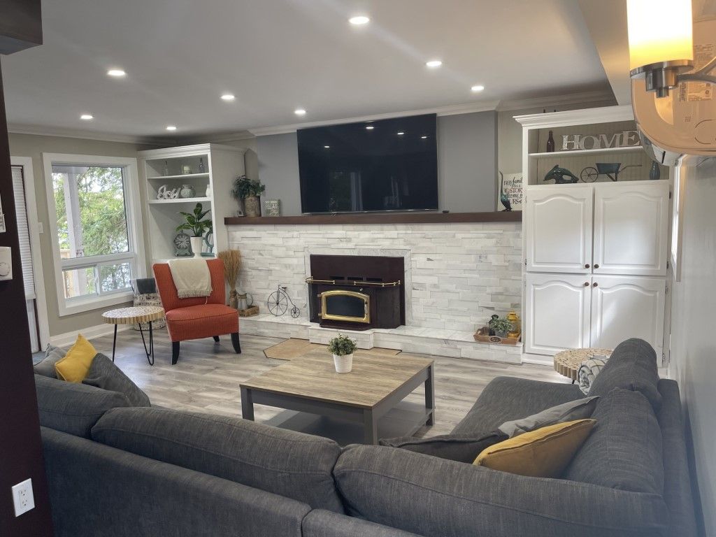 • Open concept living area with a fireplace and lake views.
