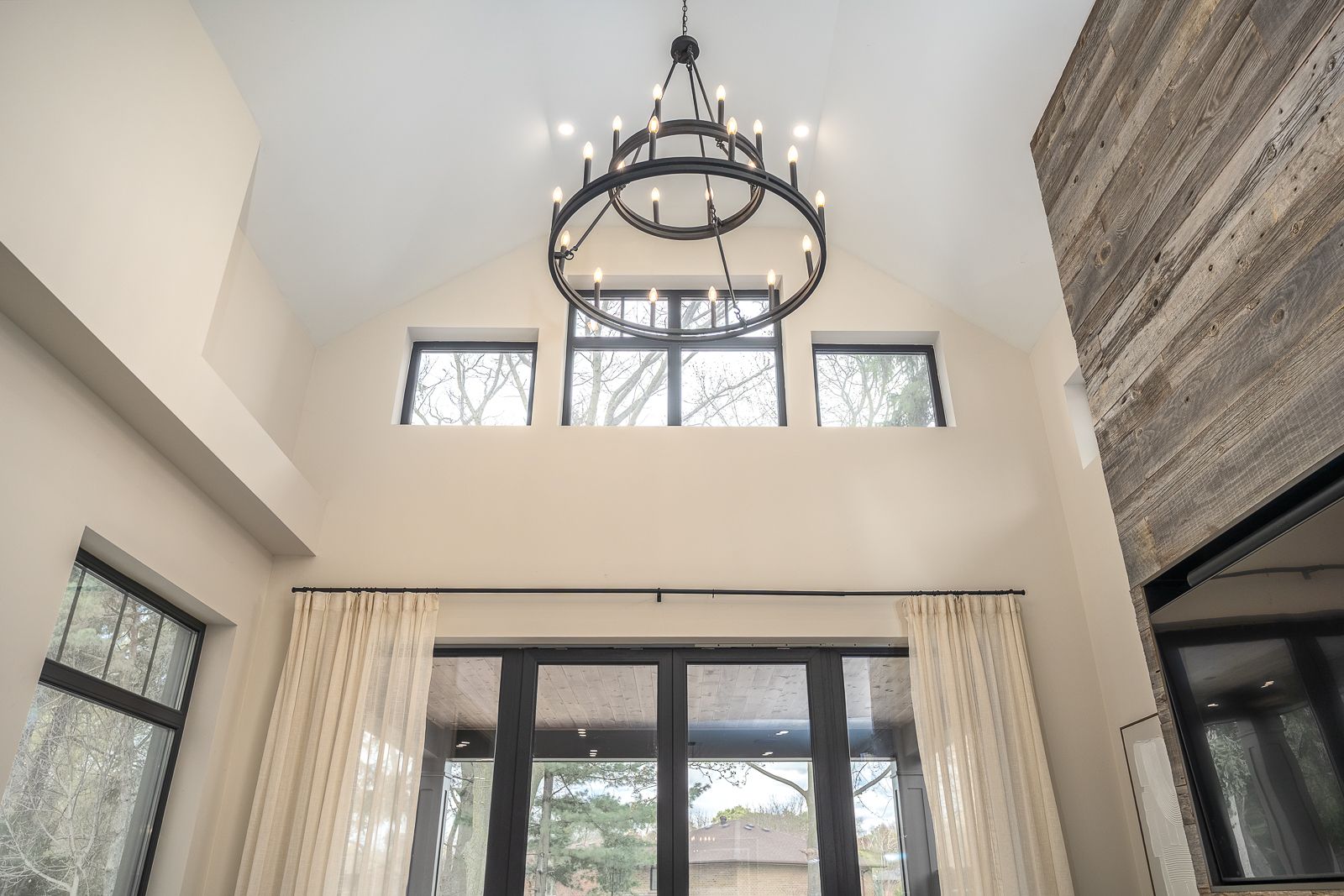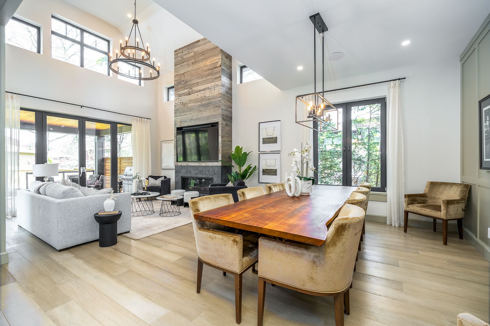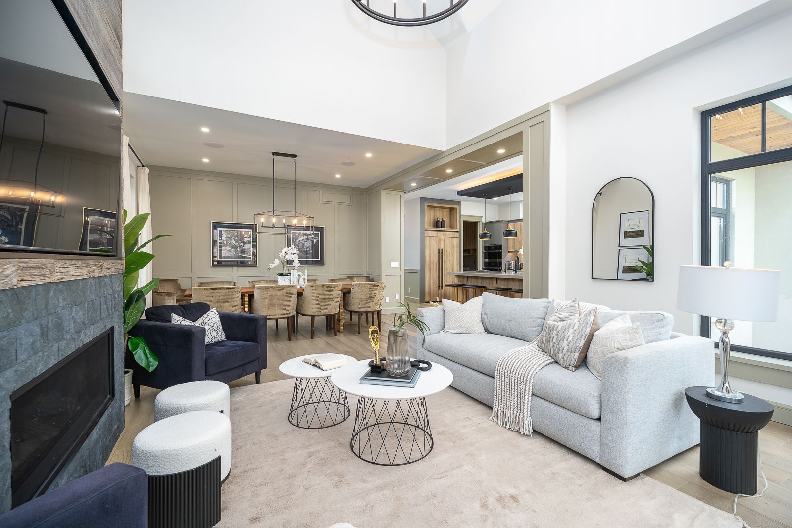 • Spacious open-concept living area with 18-foot ceilings and a large fireplace.