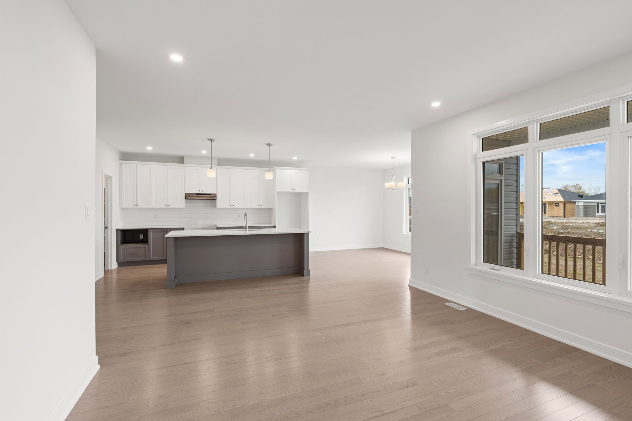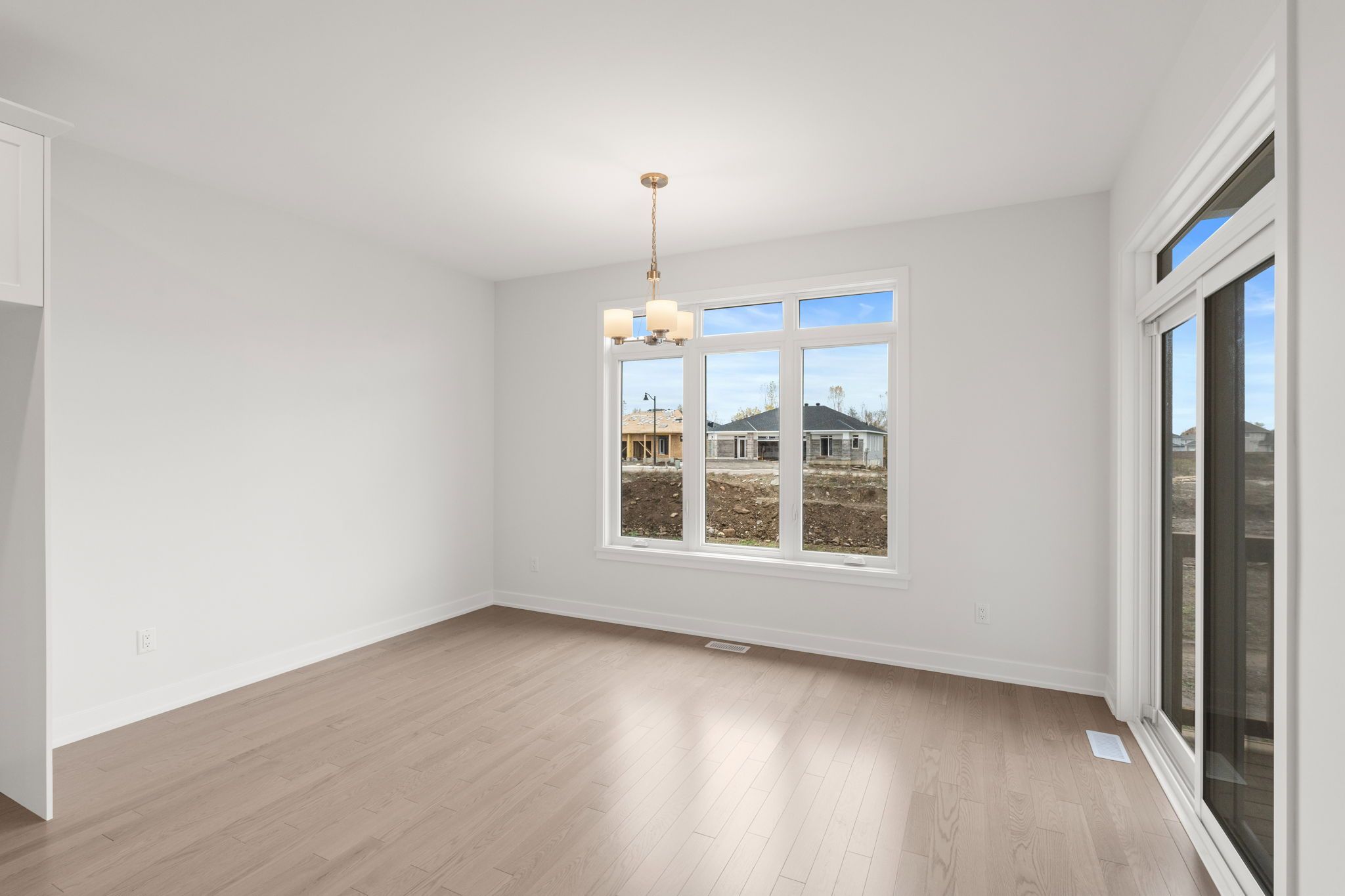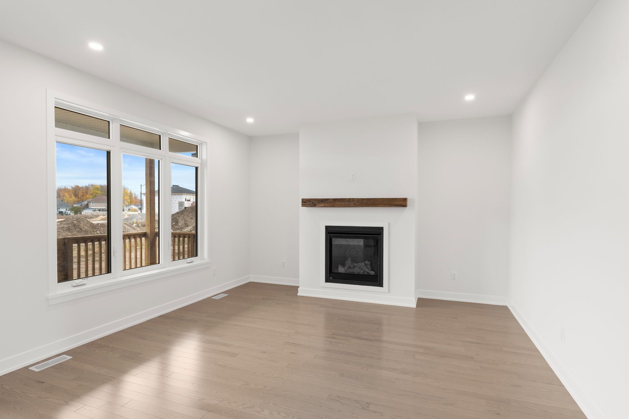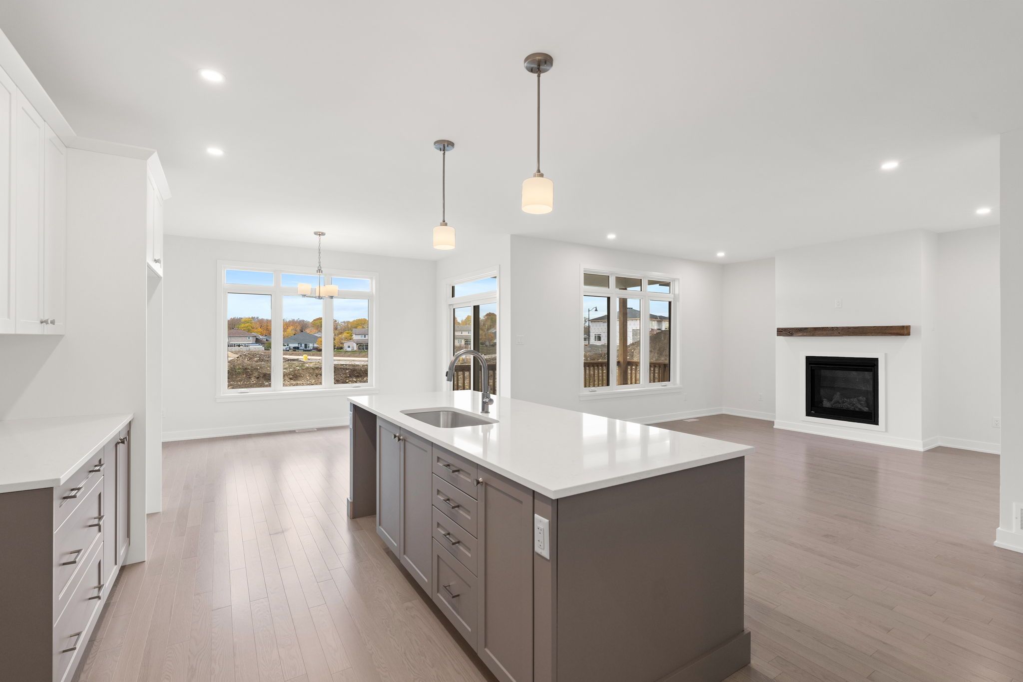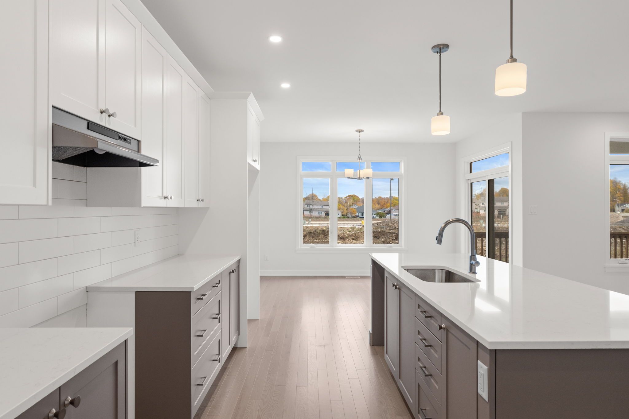 Set in brockville's stirling meadows, this newly completed semi-detached bungalow offers contemporary living with convenient access to highway 401 and nearby amenities, including shopping, dining, and recreation. The leeds model by mackie homes features approximately 1,509 square feet of thoughtfully designed living space, including two bedrooms, two bathrooms, a front-facing office nook, main-level laundry, and a single-car garage. An open-concept layout connects the kitchen, dining area, and living room, creating a bright and functional space ideal for both everyday living and entertaining. The kitchen showcases two-toned cabinetry, quartz countertops, a storage pantry, and a spacious centre island with an undermount sink. The living room features a natural gas fireplace with a mantle. Step outside to the covered porch, providing a seamless indoor-outdoor flow. The primary bedroom includes a walk-in closet and a three-piece ensuite.
