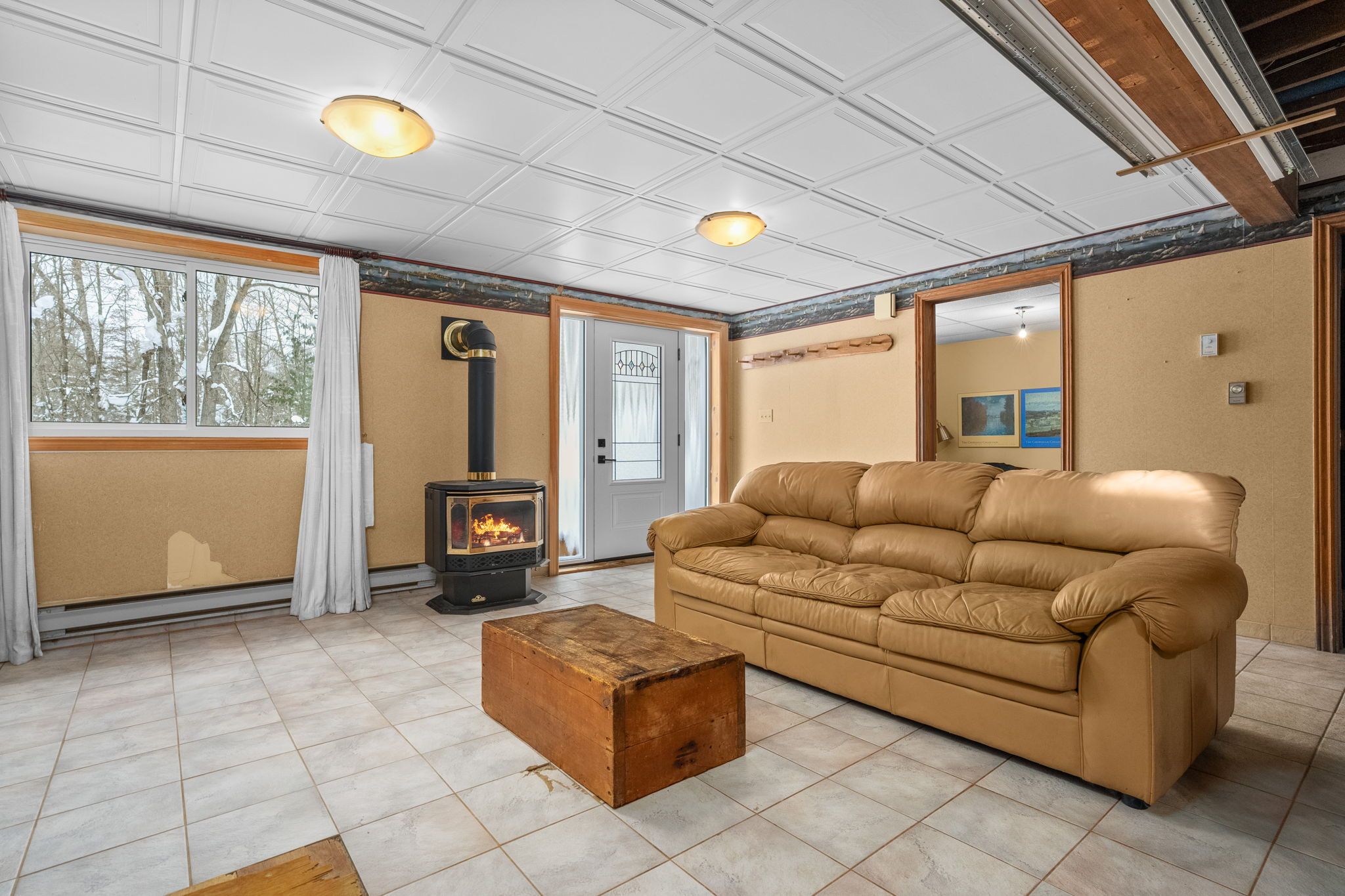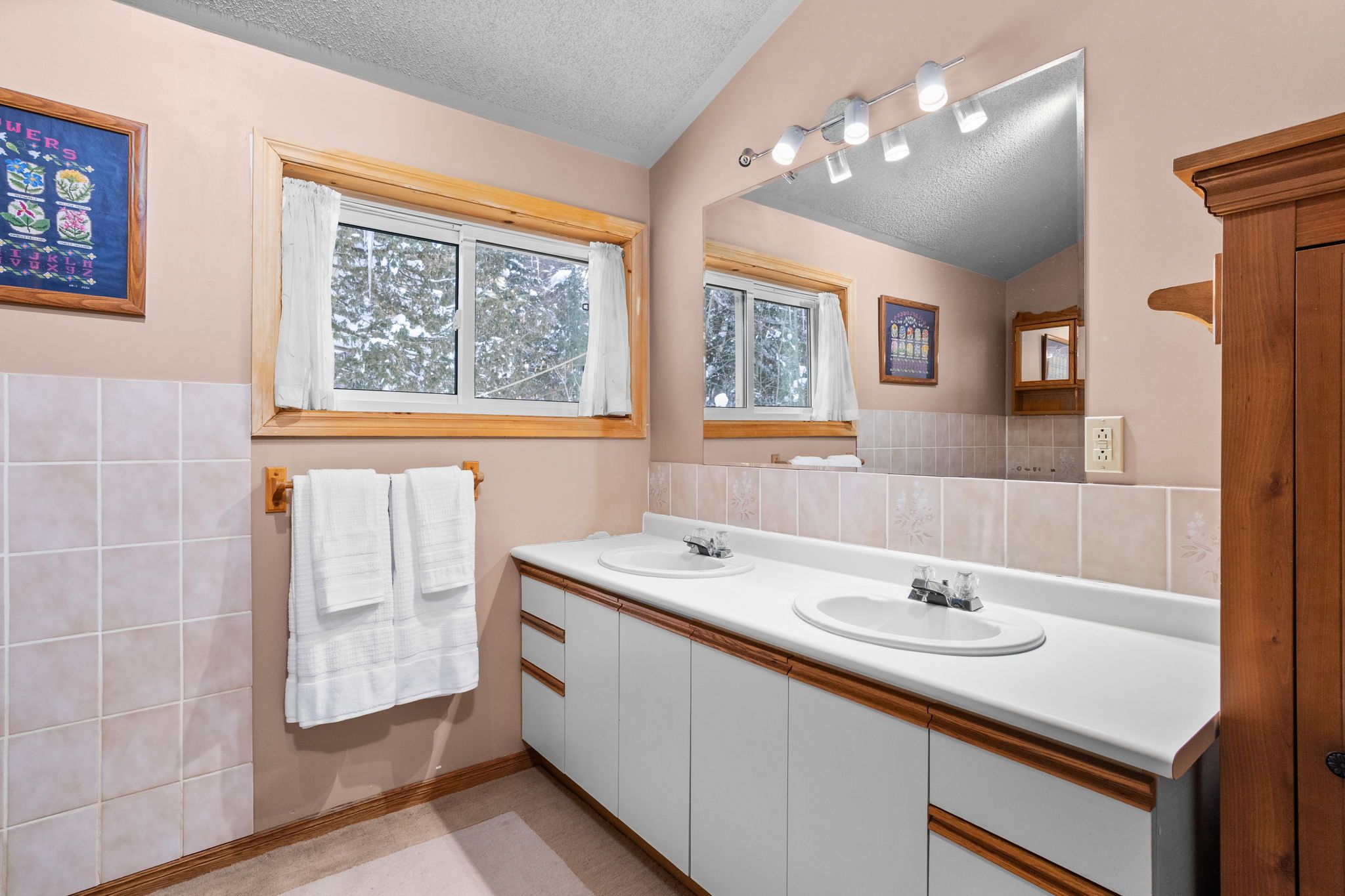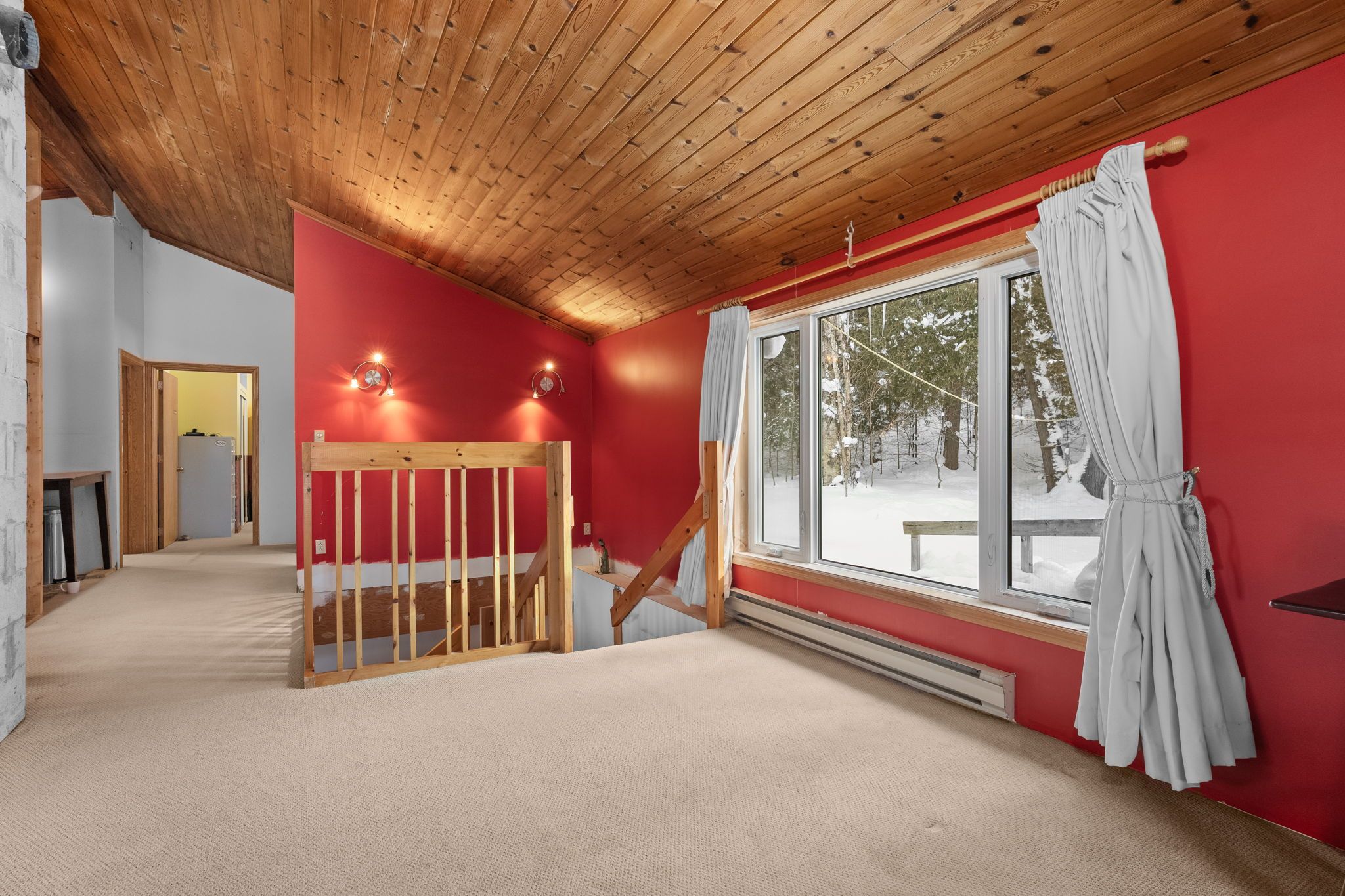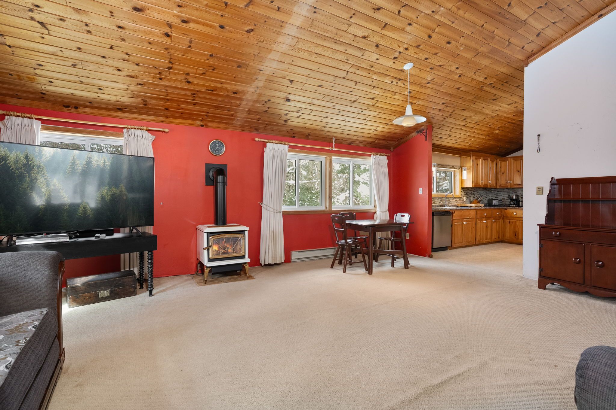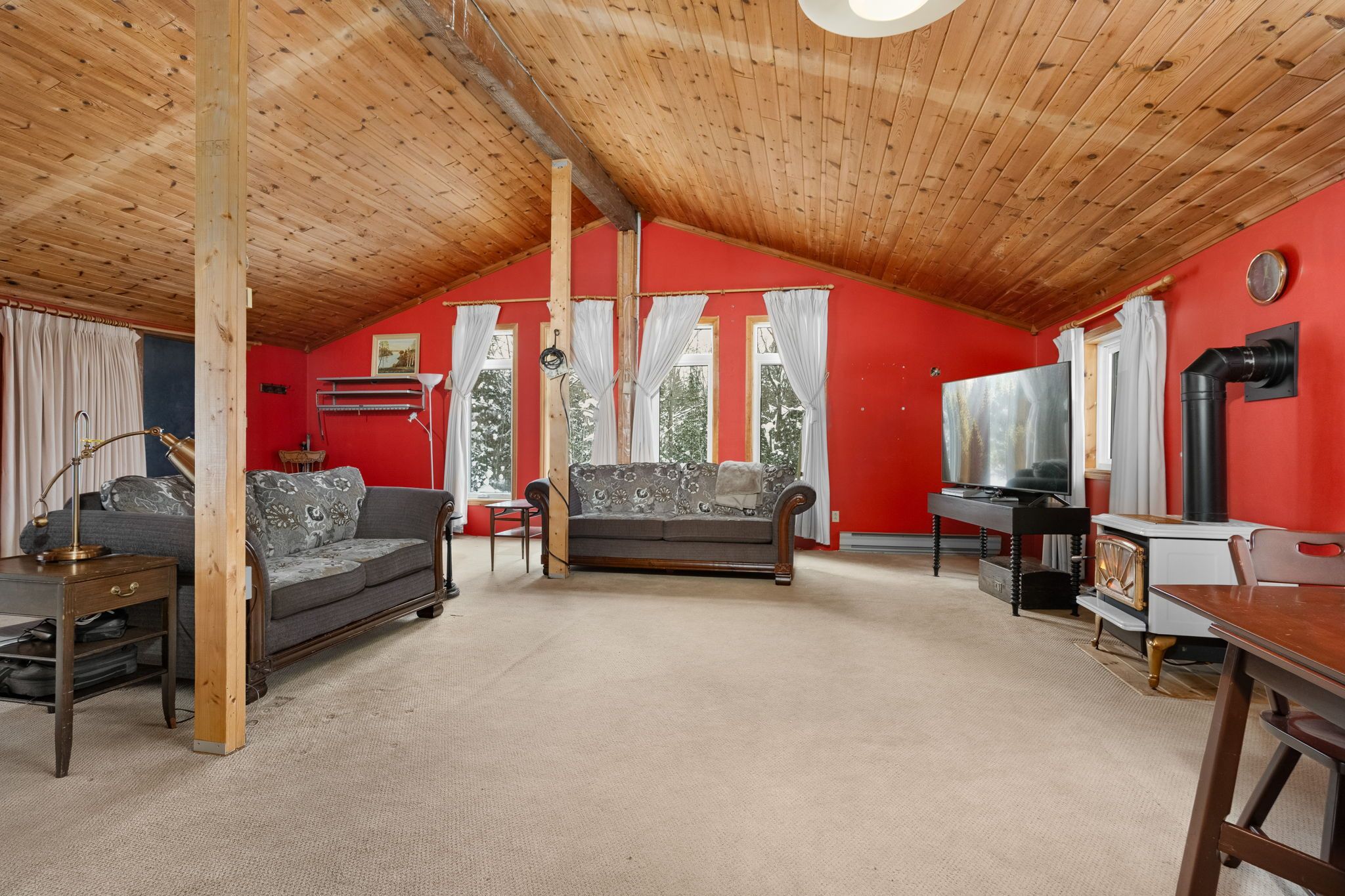• Spacious living area with bright windows and cathedral ceilings.