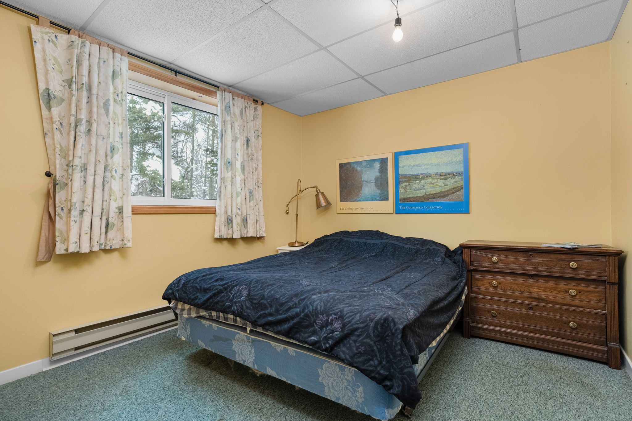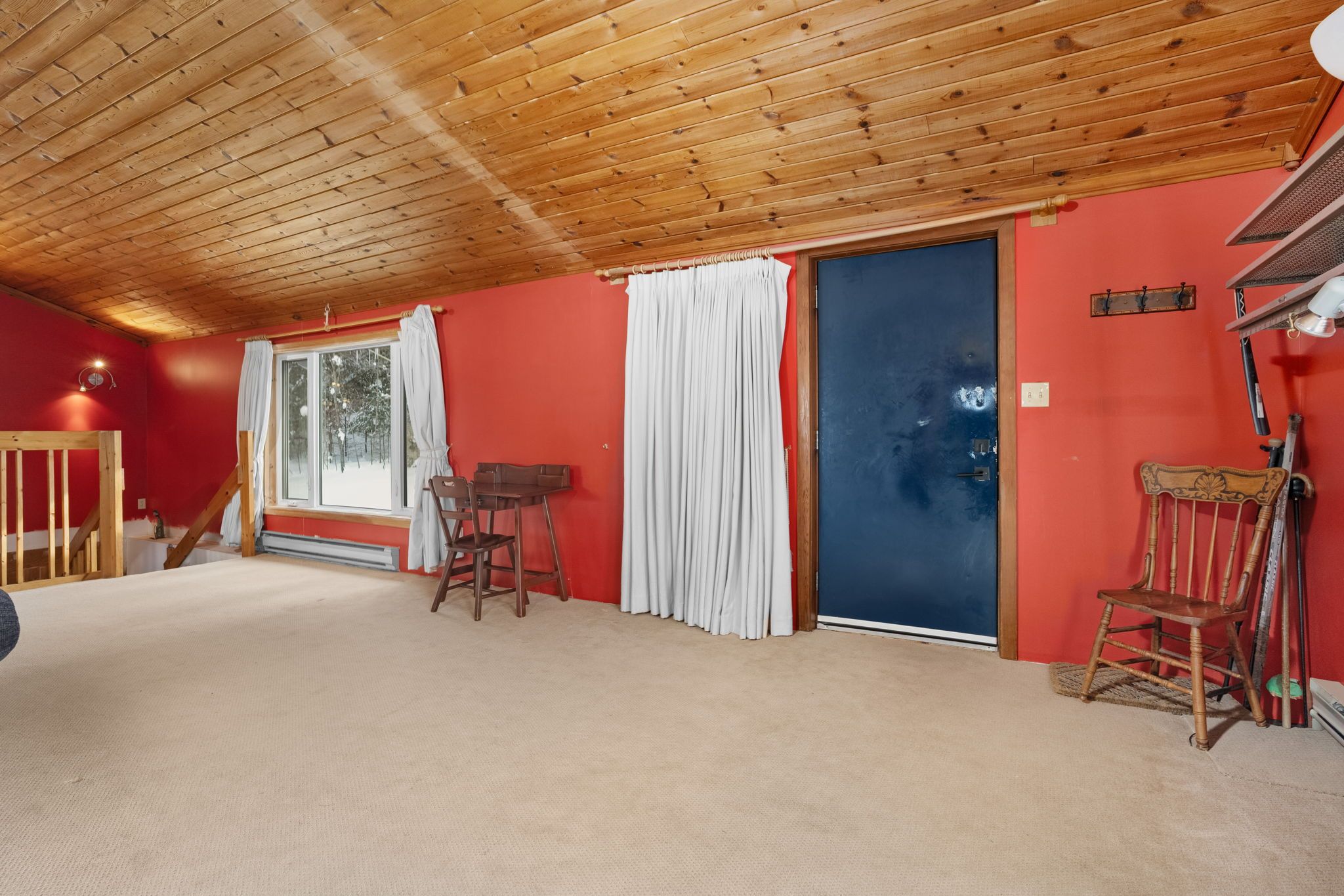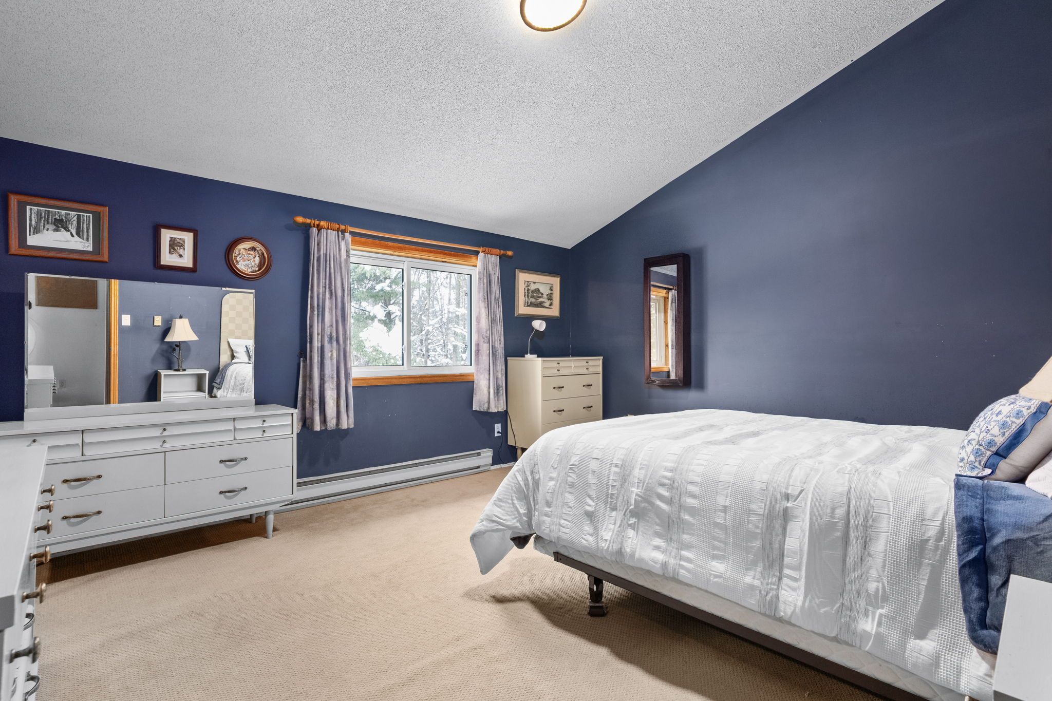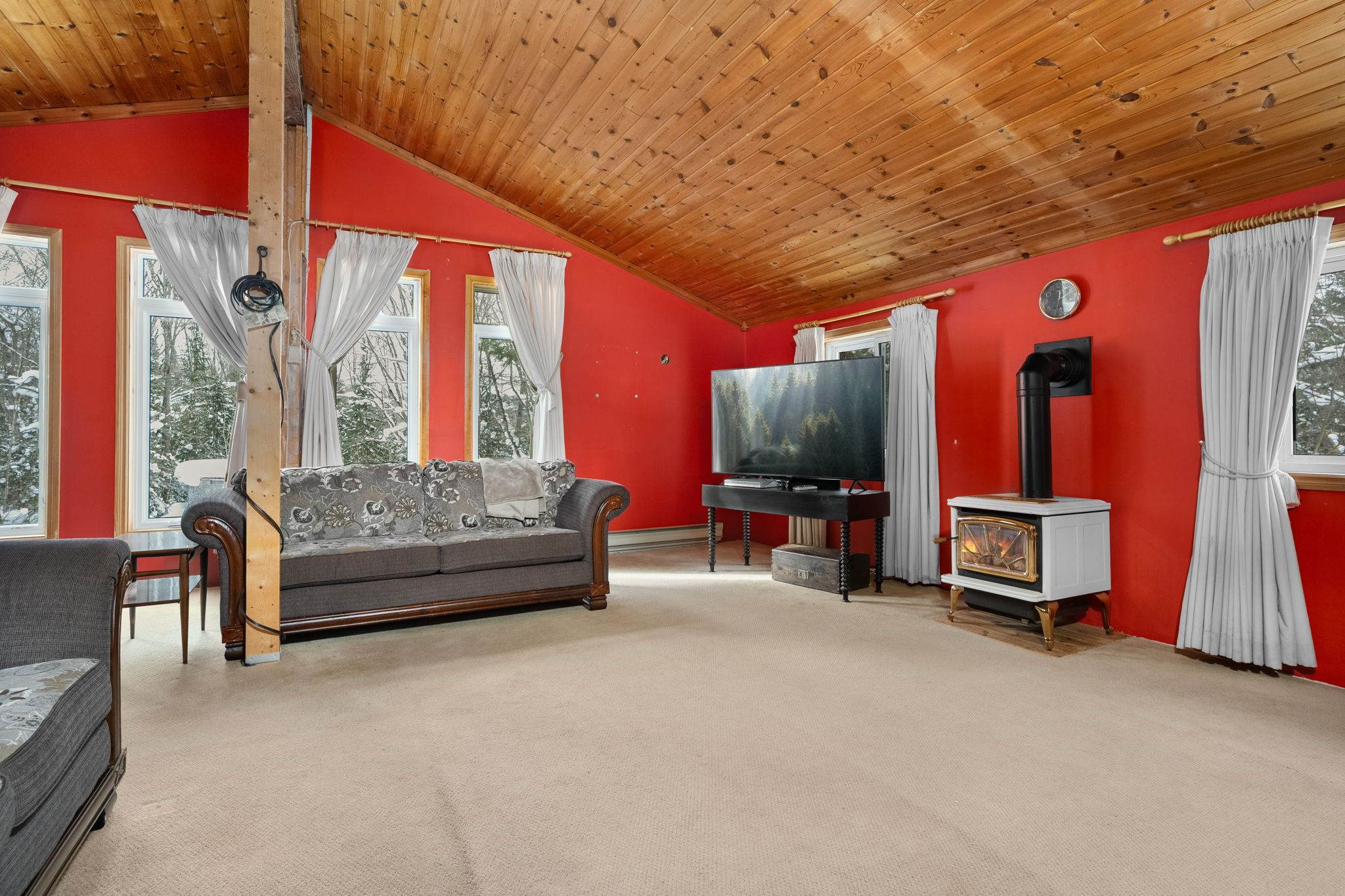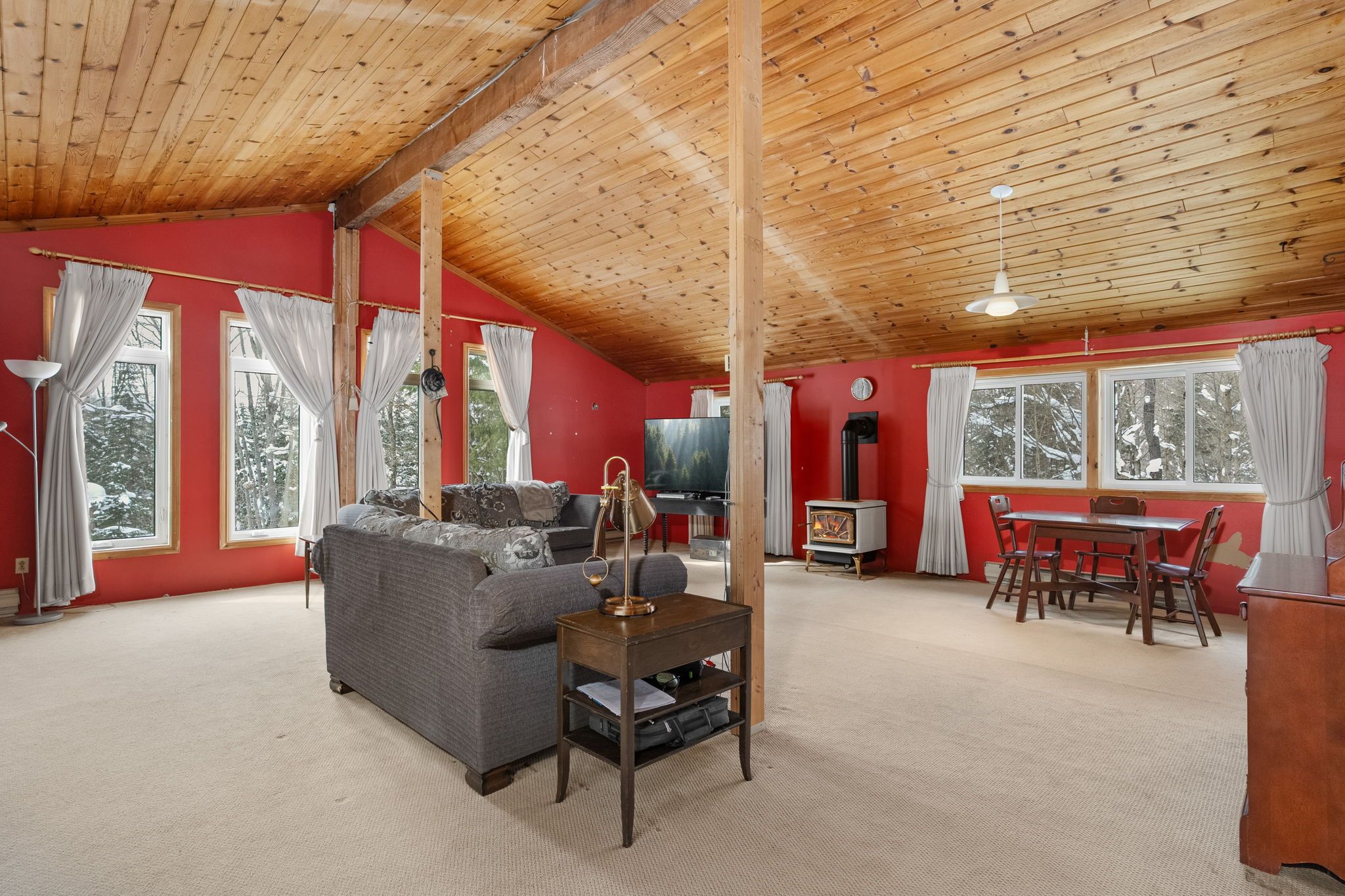 • Bright living area with cathedral ceilings and large windows for natural light.