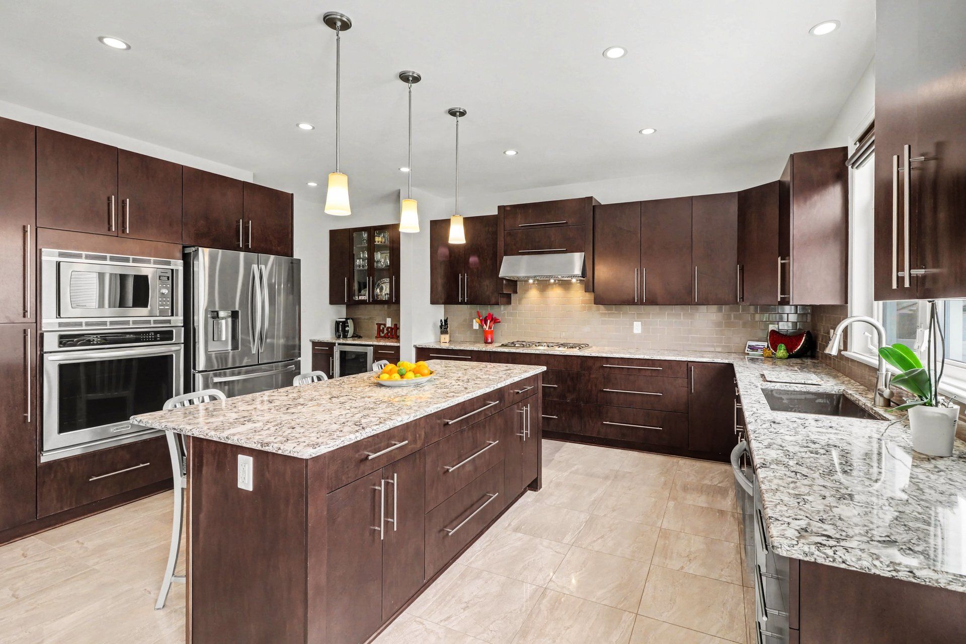 • Upgraded kitchen featuring an oversized island, stainless steel appliances, and abundant cabinetry.