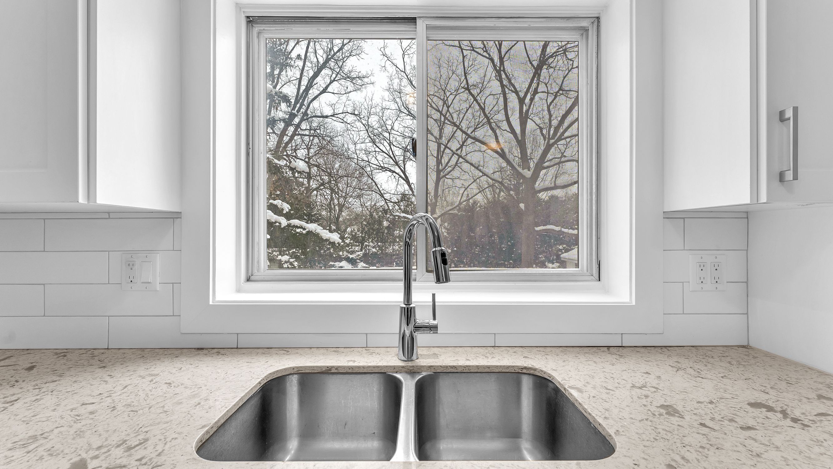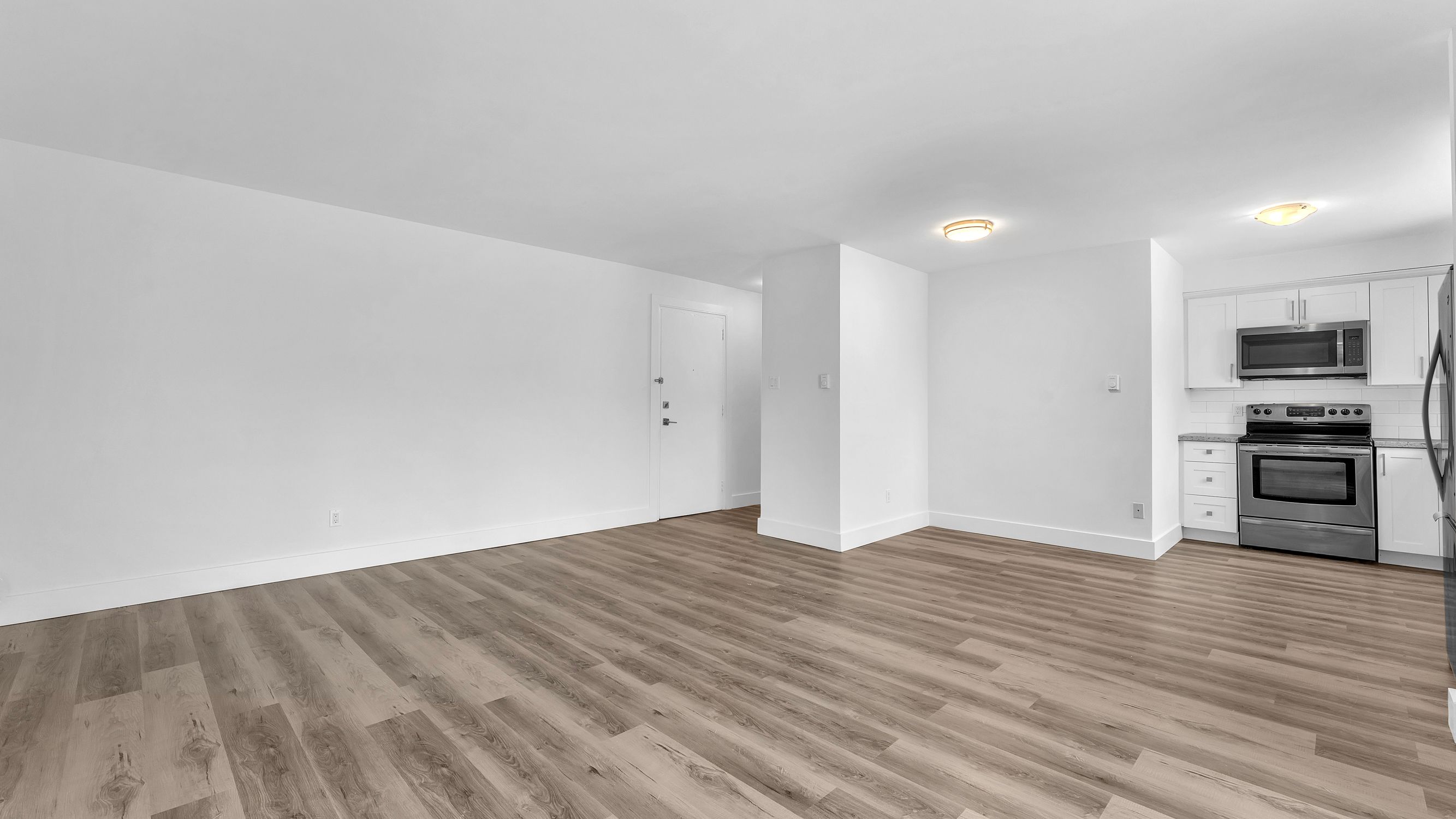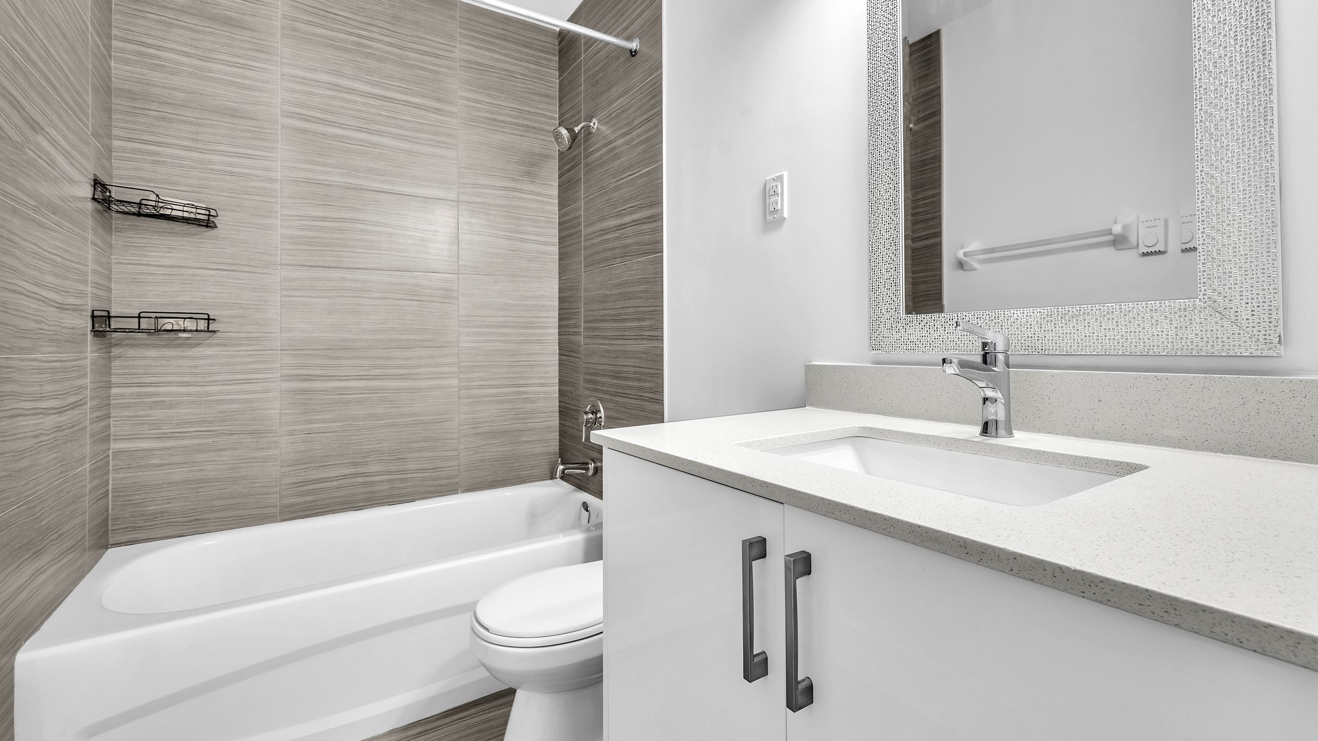 • Modern kitchen with stainless steel appliances and quartz countertops.