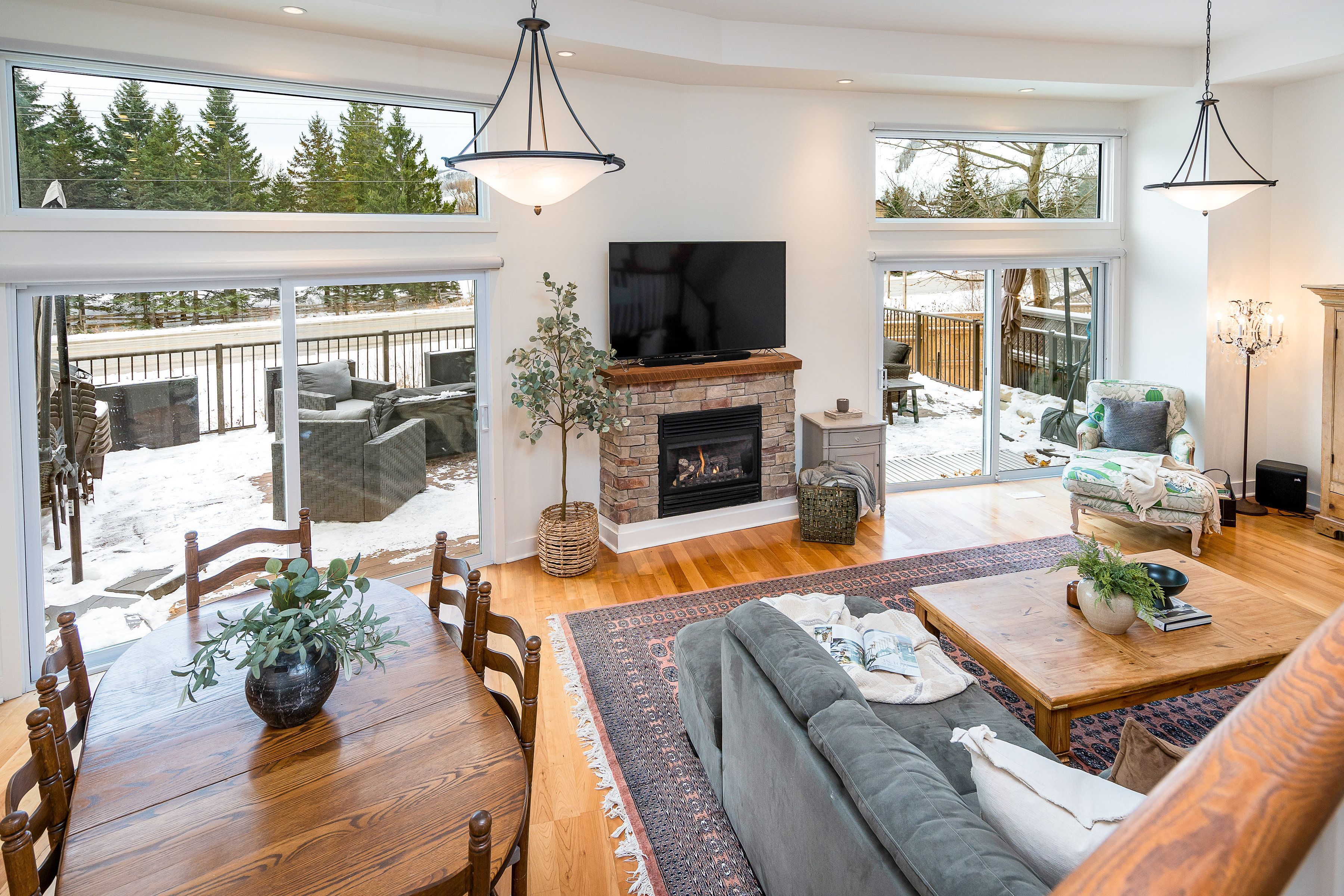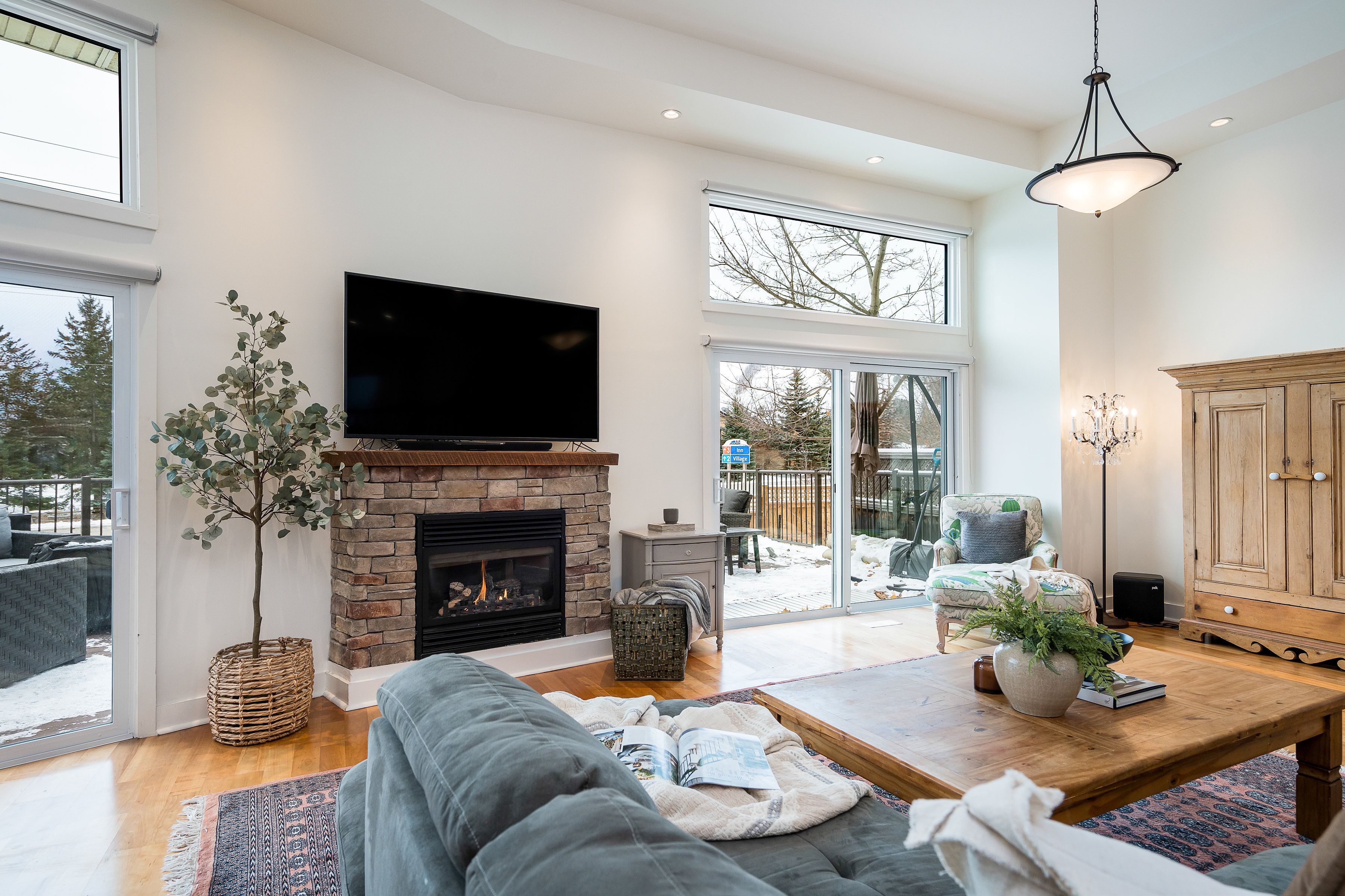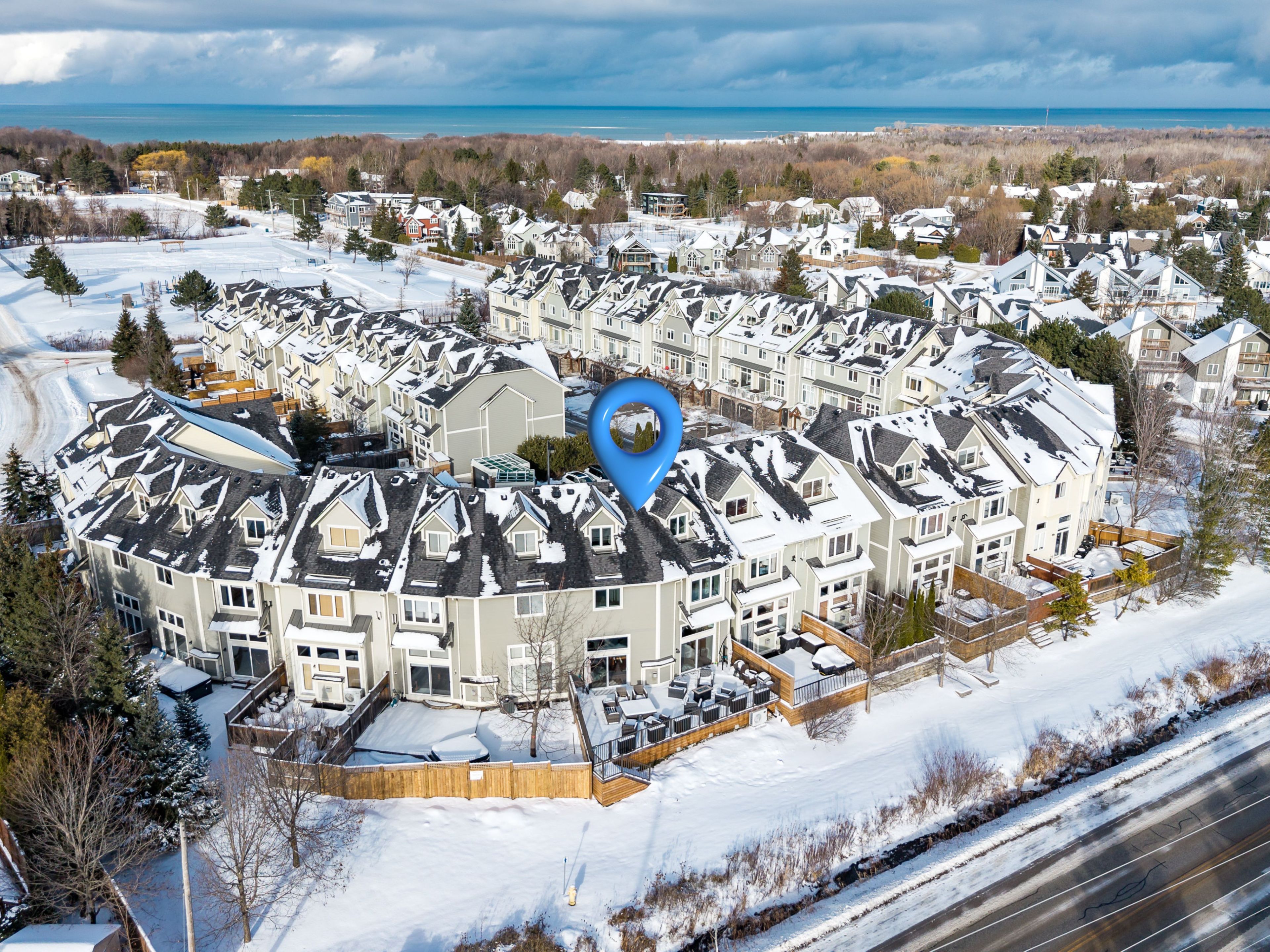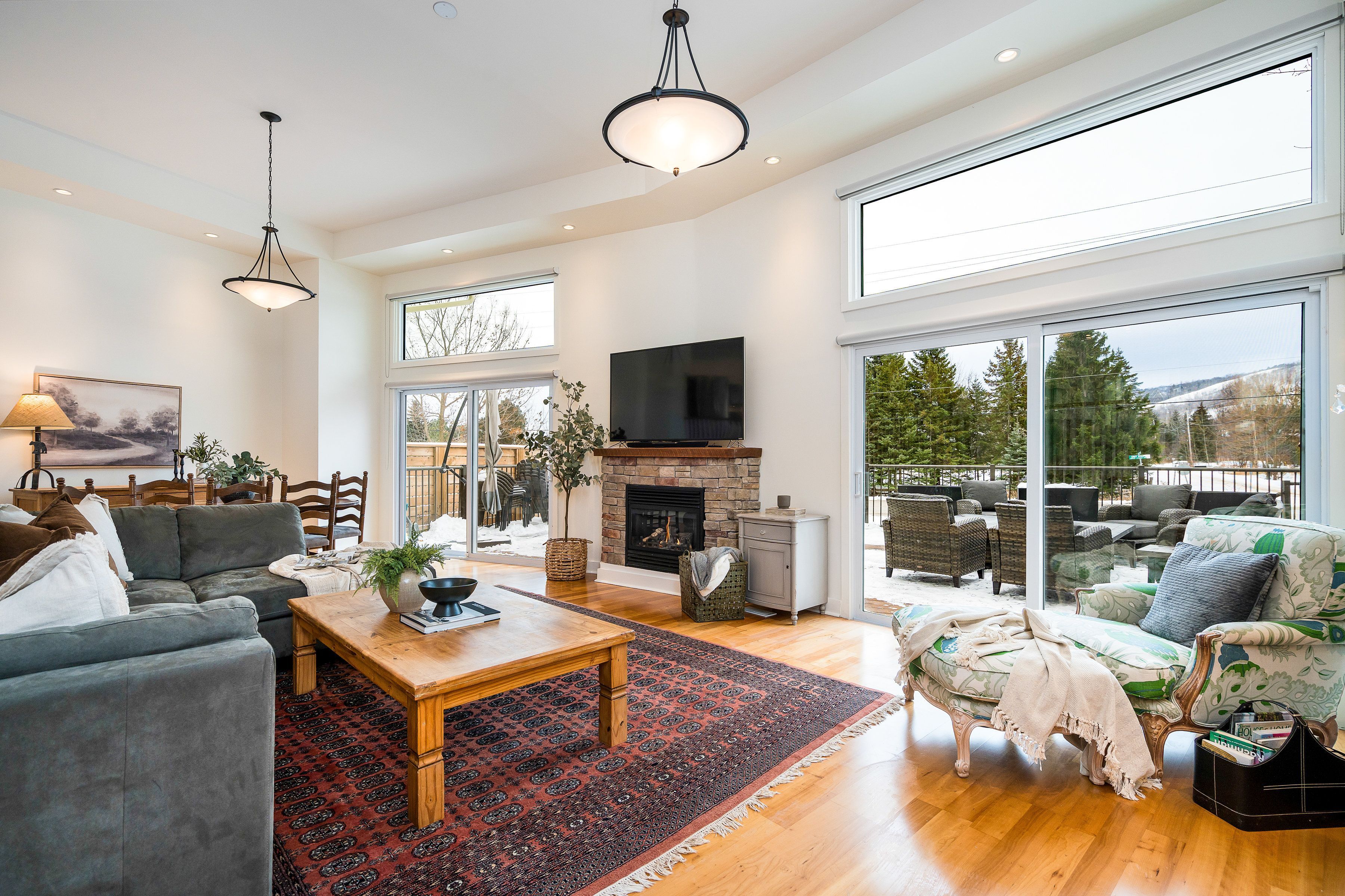 Welcome to arrowhead at blue, a 5-bedroom, 4-bath freehold townhome offering approx. 2,750 sq. Ft. Of finished living space and spectacular views of blue mountain. The open-concept kitchen and great room are filled with natural light and capture ski hill views and sunsets. Step onto the expansive 37' x 27' deck with mountain views, perfect for entertaining, après-ski gatherings, or relaxed summer evenings. A fully finished lower-level recreation room provides flexible additional space for guests, games, or movie nights. This home has been thoughtfully improved, including a steel roof (2023), triple-pane south-facing windows, an additional second patio slider (2024), and a new furnace, heat pump/air conditioner, humidifier, and tankless water heater (2024). Other upgrades include composite decking and railings (2021), deck skirting (2025), led pot lights with dimmers, under-cabinet kitchen lighting, upper-level blinds (2024), comfort-height toilets (2024), updated bedroom fixtures, and fresh interior paint with recent touch-ups. Additional features include a single-car garage with an ev charger, guest parking. Freehold ownership comes with a low monthly common elements fee covering lawn and garden care, snow removal, garbage and recycling removal, visitor parking, and high-speed internet and cable through rogers. Cherished by the current owners for eight years, this home has been the centre of family gatherings in every season-christmas mornings, ski weekends, thanksgiving dinners, and summer adventures and loved for its incredible views, spacious layout, proximity to the georgian trail, dog park, playground, and the shops and restaurants of collingwood and thornbury. A well-maintained, move-in-ready home offering comfort, space, and true four-season living.