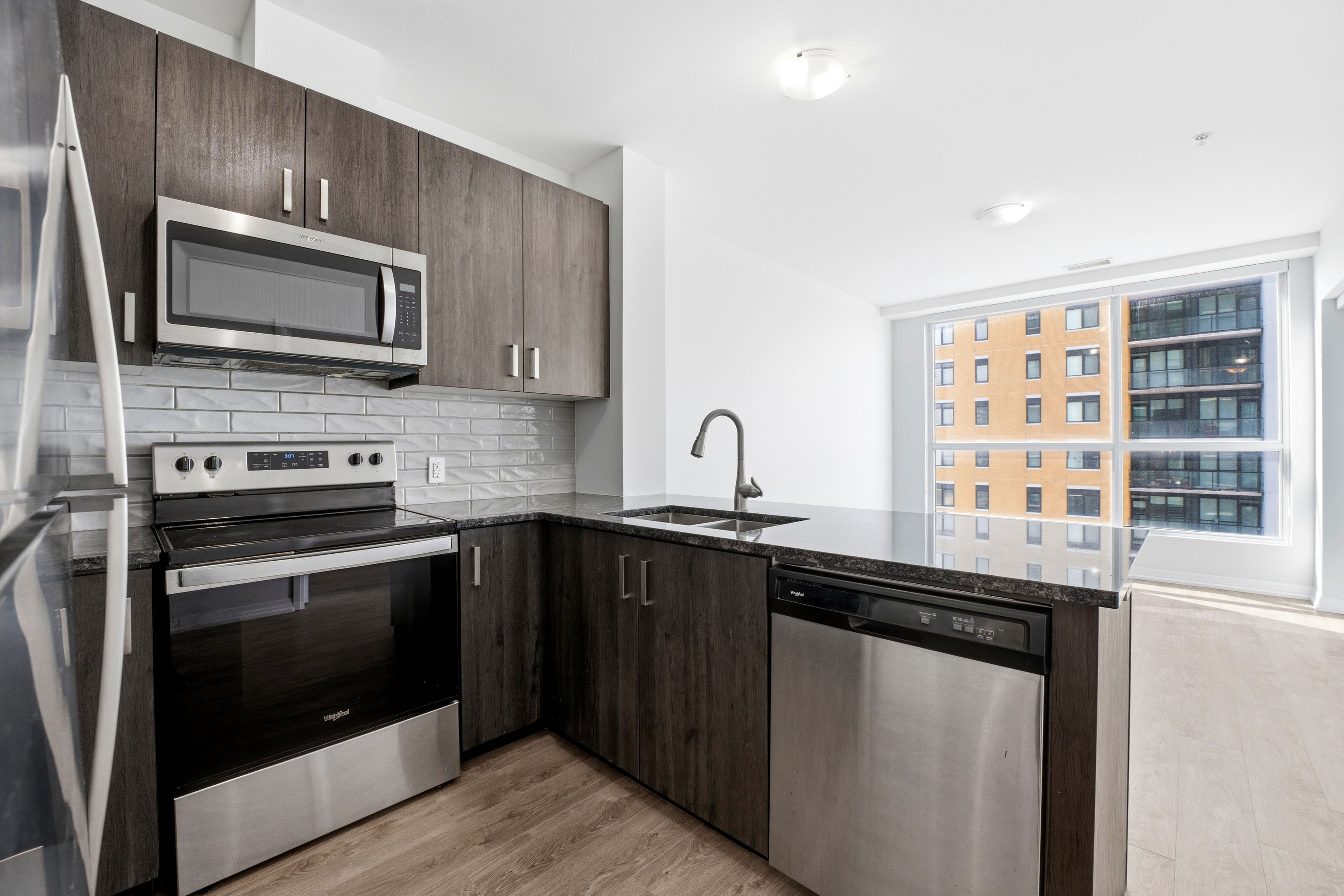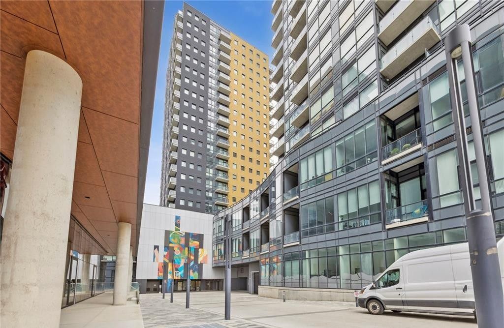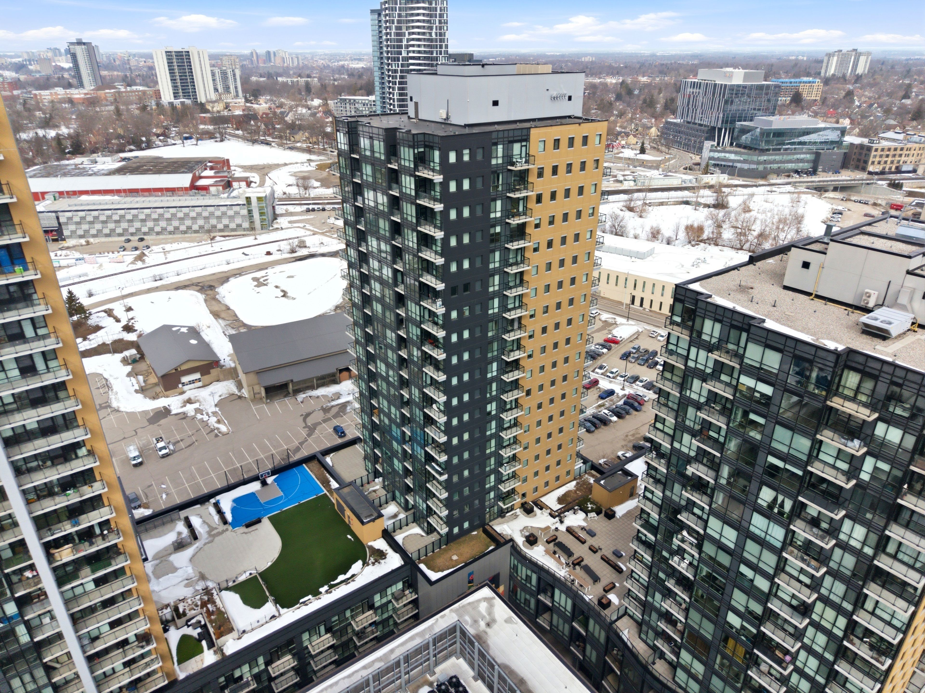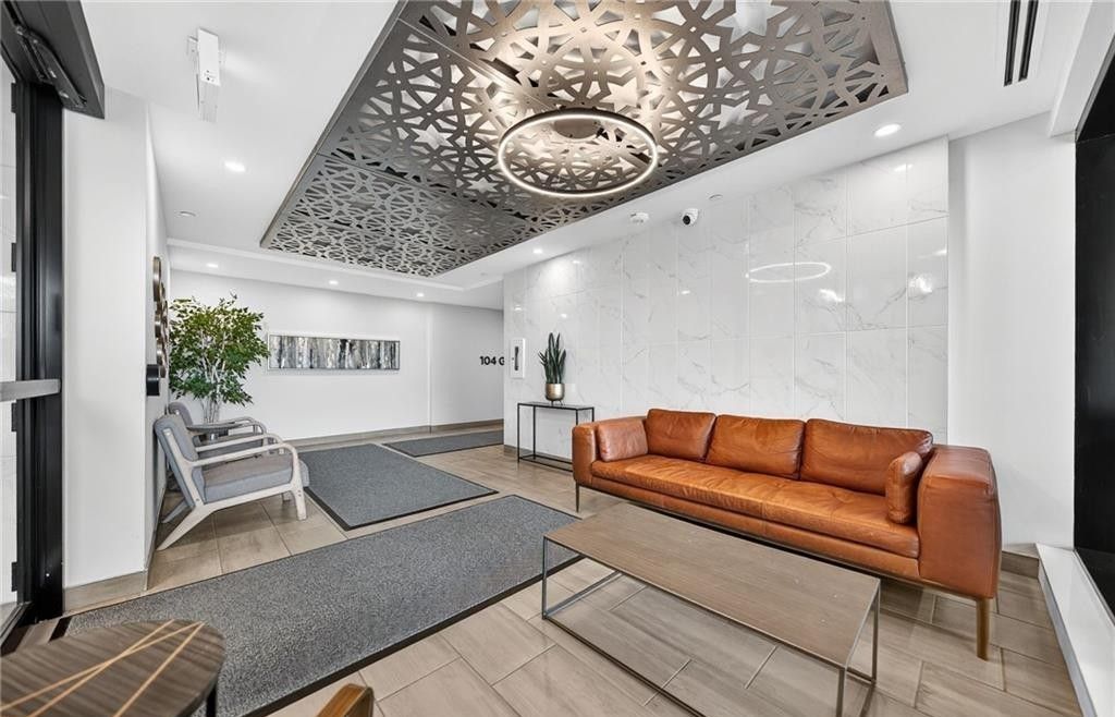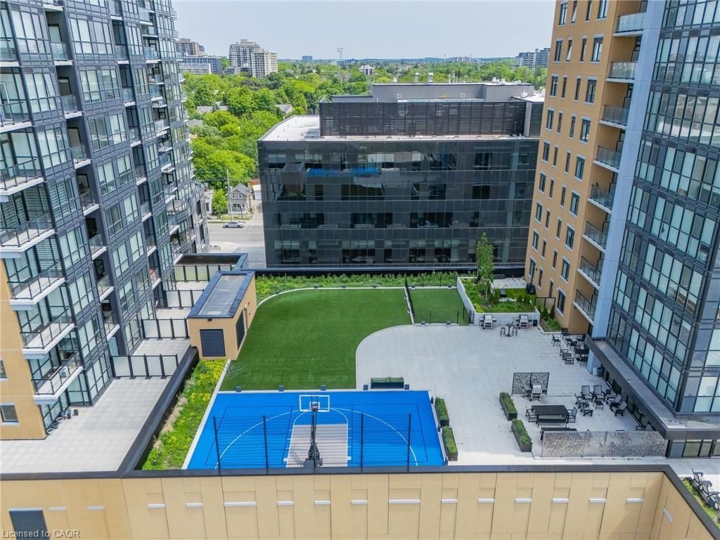 Perched high above the vibrant kitchener skyline, this one-bed + den condo at 104 garment st, unit 1206 offers an exceptional opportunity in downtown kitchener's most sought-after addresses. Bright open-concept layout enhanced by premium flooring and freshly painted neutral tones. The contemporary kitchen offers generous granite countertops, stainless steel appliances, a tasteful tile backsplash, & a breakfast bar that overlooks the main living area. The spacious living room is flooded with natural light from impressive floor-to-ceiling windows and offers direct access to a private balcony overlooking the terrace below. The primary bedroom is both comfortable and functional, featuring a large walk-in closet and a generous window framing elevated city views. A versatile den provides the perfect space for a home office, reading nook, or guest area, also offering a full 4-piece bathroom, convenient in-suite laundry, and additional storage. Residents of this highly desirable building enjoy an impressive array of premium amenities including a rooftop terrace with stunning city views, a fully equipped fitness centre, private theatre room, party room, and a stylish media lounge-perfectly suited for today's dynamic professional lifestyle. The unit also comes complete with one underground parking space for added convenience. Ideally situated in the heart of downtown kitchener's innovation district, this prime location places you just steps from the ion lrt, grand river hospital, victoria park, and an incredible selection of restaurants, cafés, and boutique shops. With major employers such as google and the thriving tech hub nearby, this location is perfectly positioned for professionals seeking both connectivity and lifestyle. Offering the perfect blend of modern design, functional living space, and unbeatable downtown convenience, this impressive condominium is a remarkable opportunity to enjoy the very best of city living.