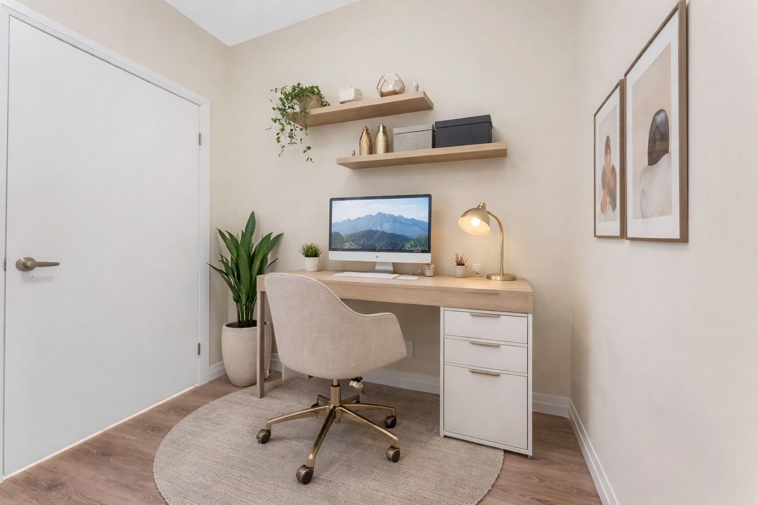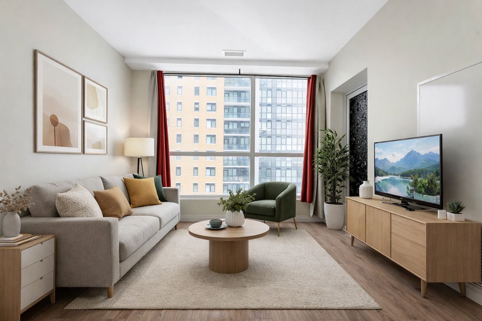• Floor-to-ceiling windows provide natural light and city views.