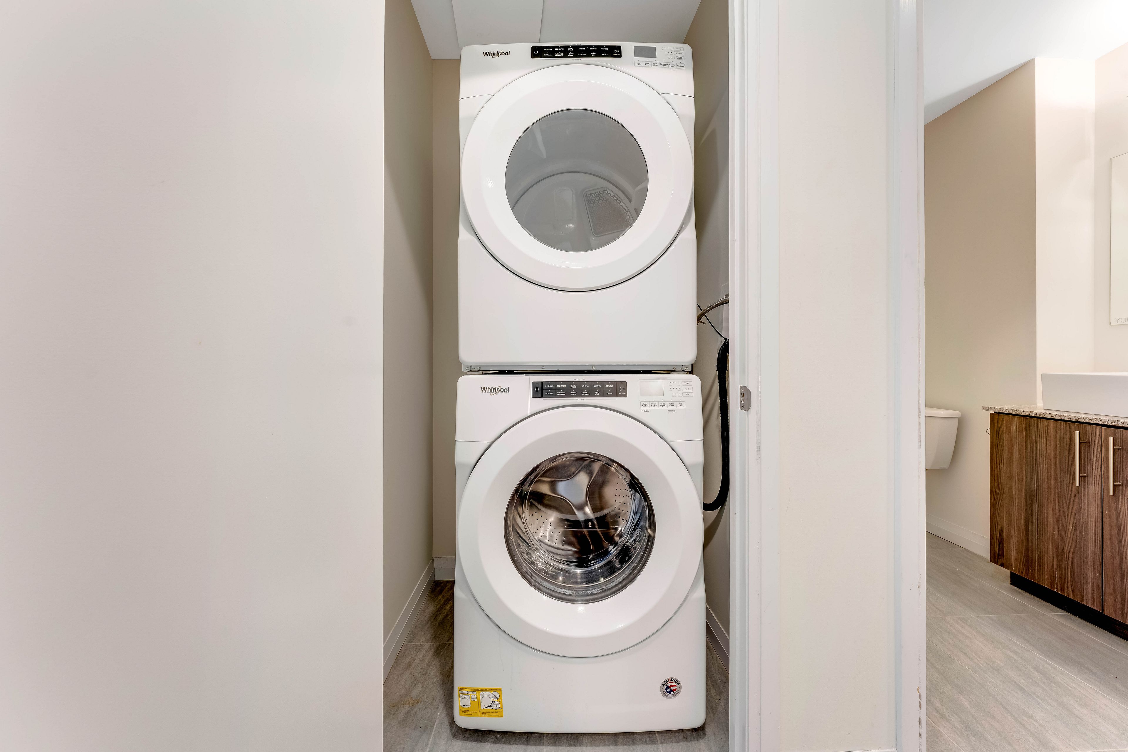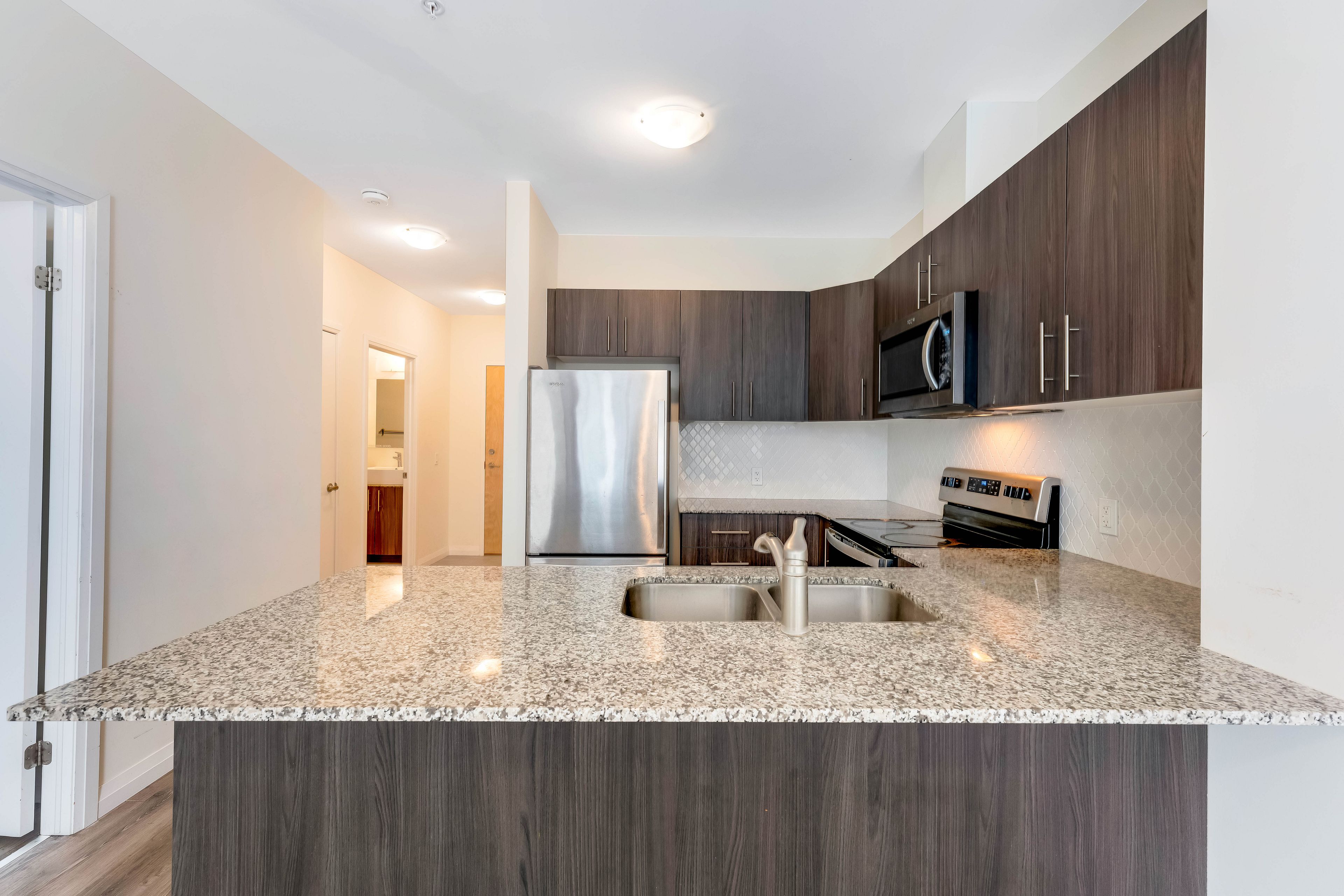 • Modern kitchen with granite countertops and stainless steel appliances.