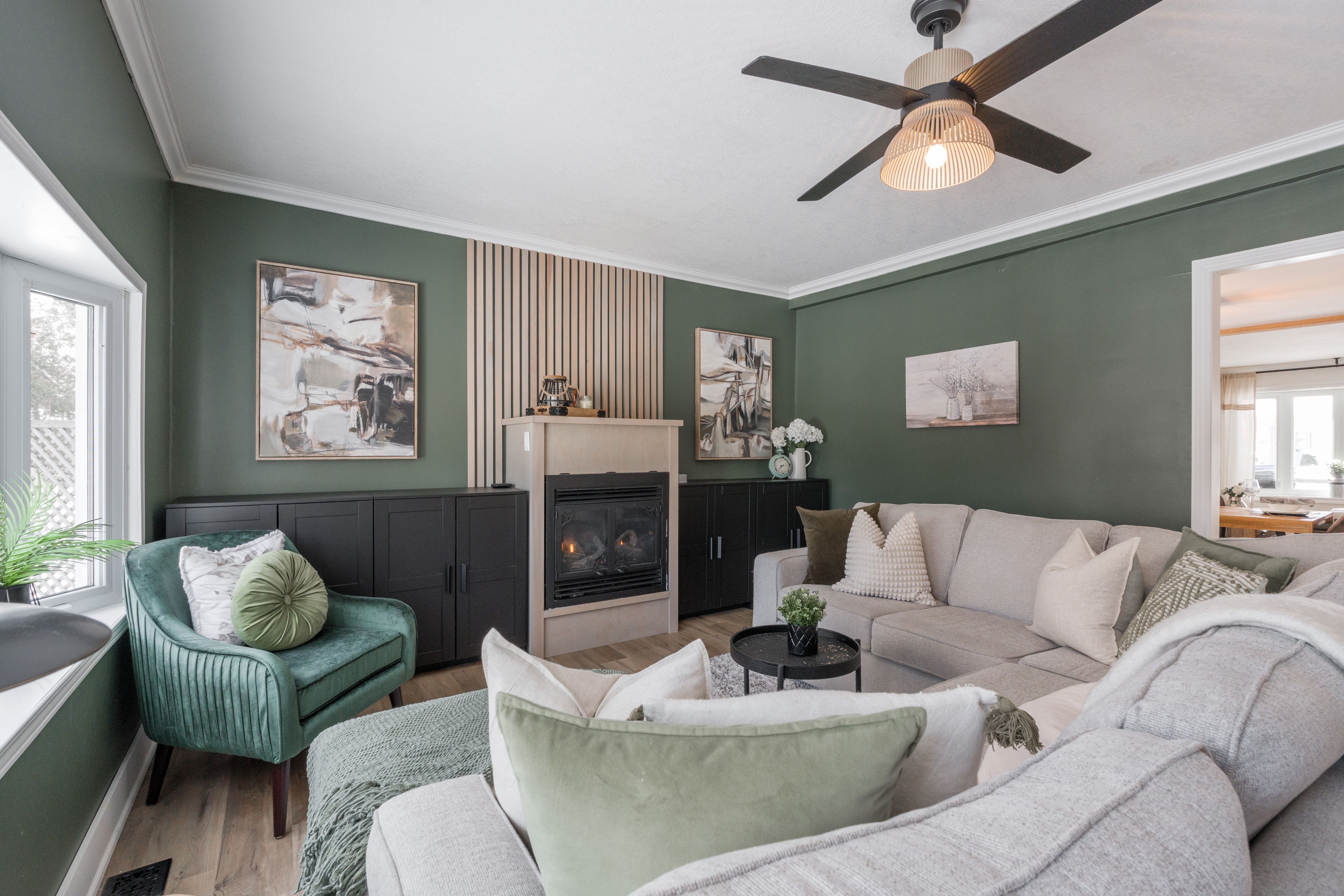 • Bright living room with oversized windows and cozy gas fireplace.