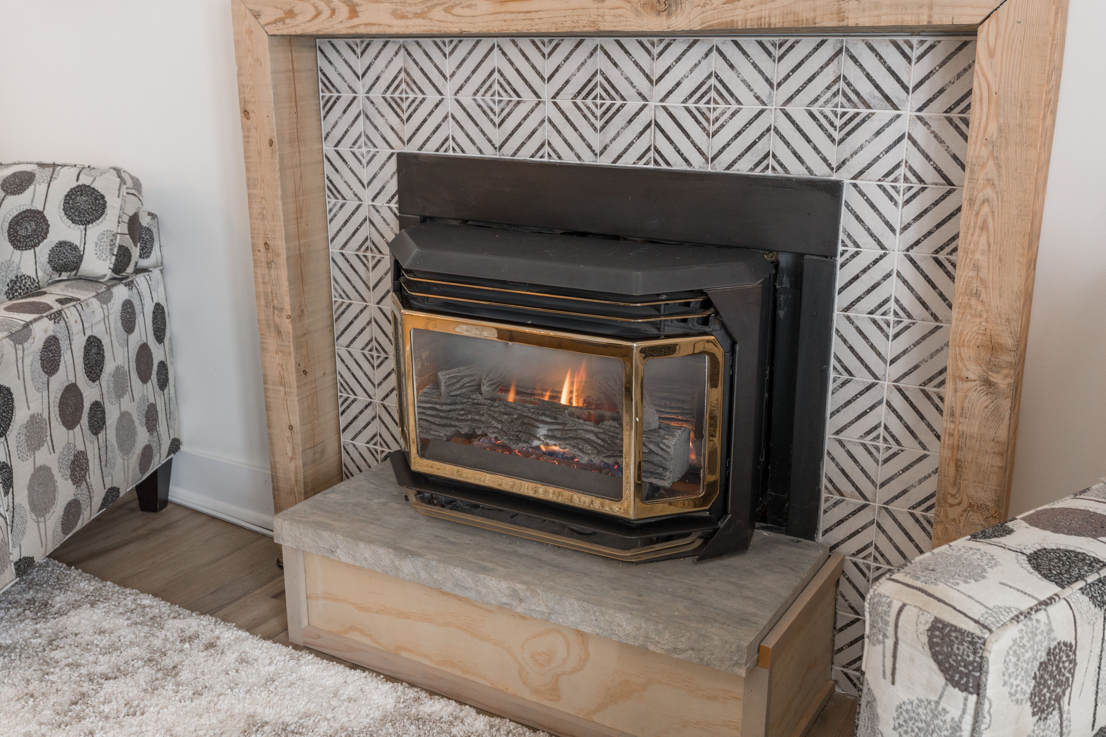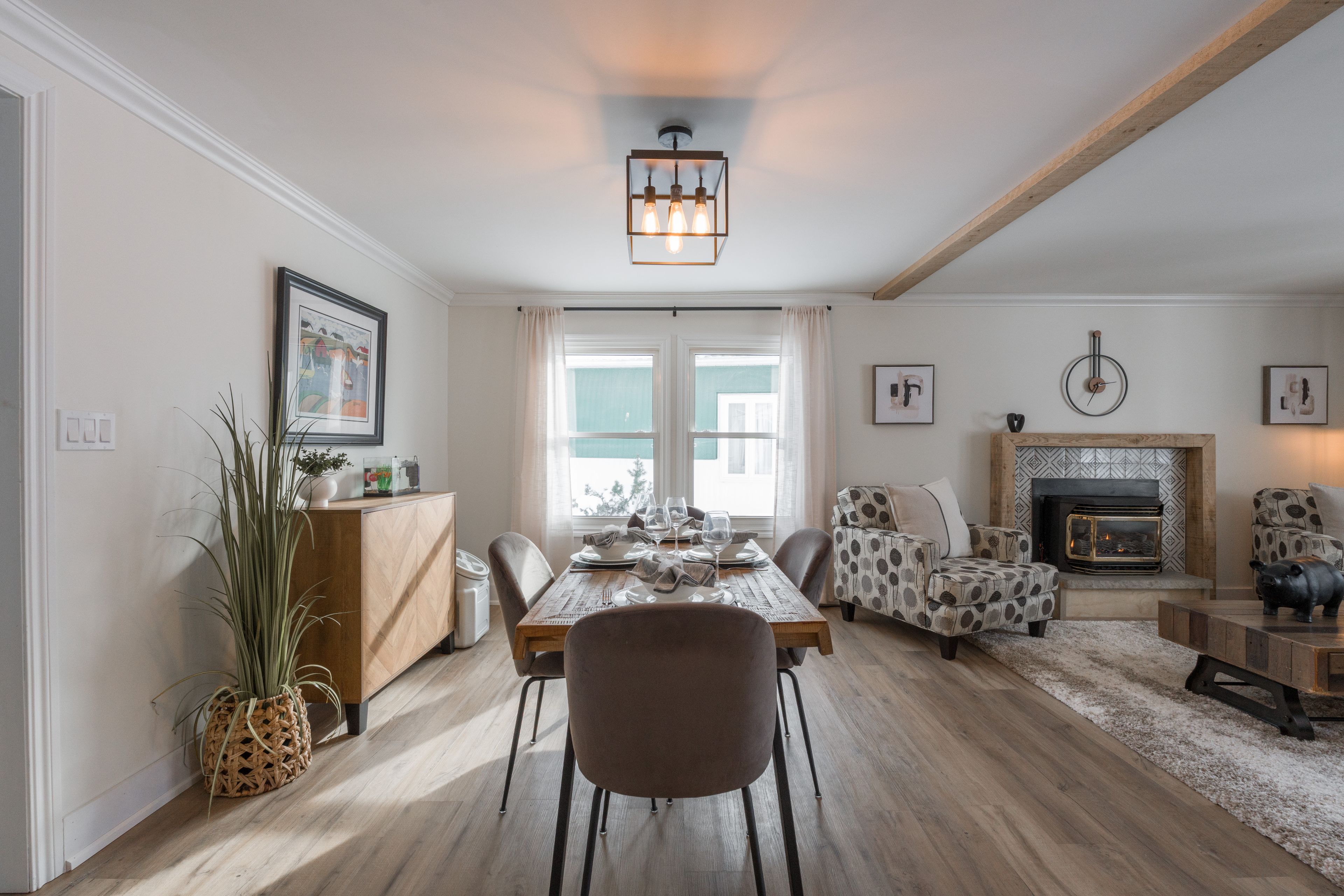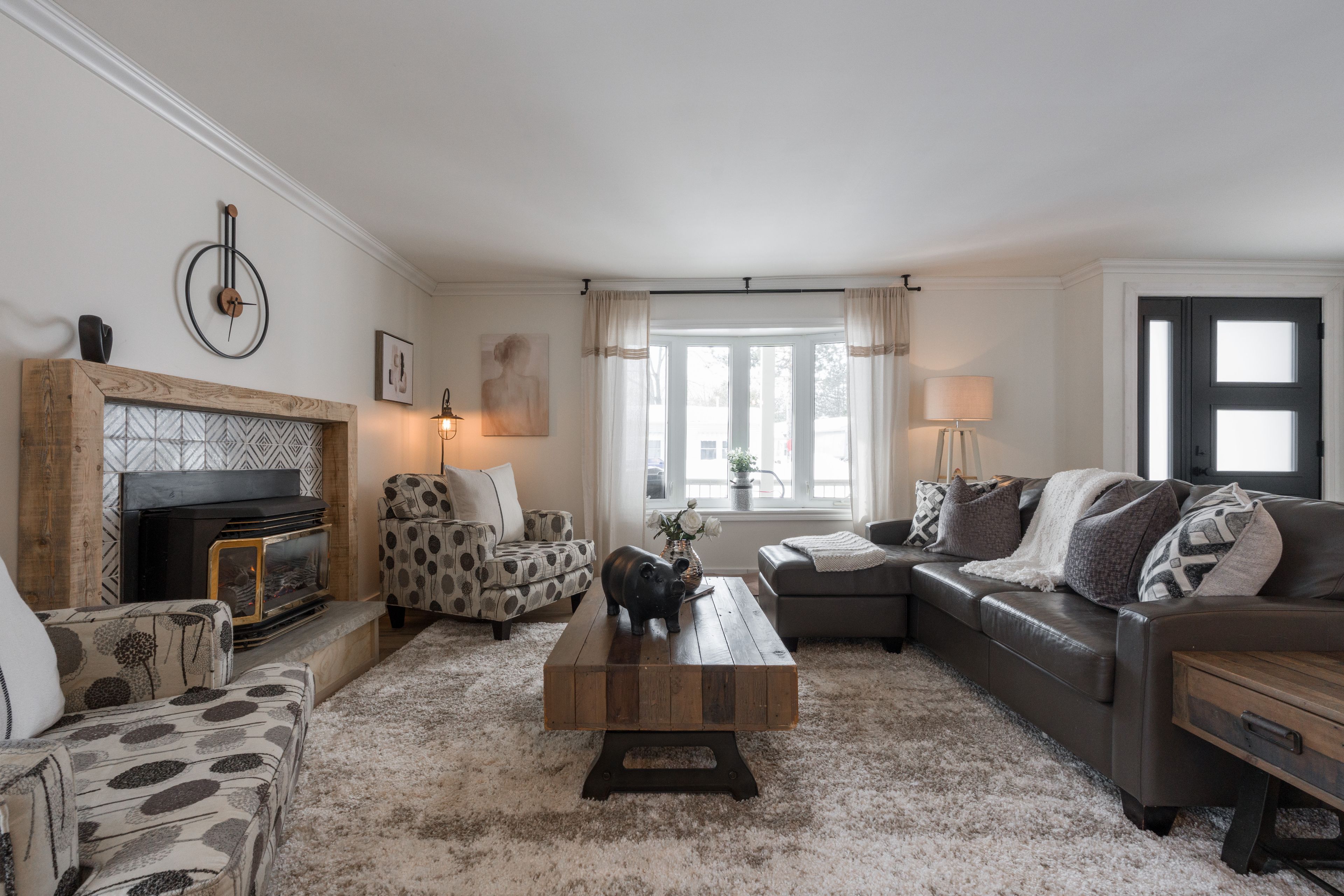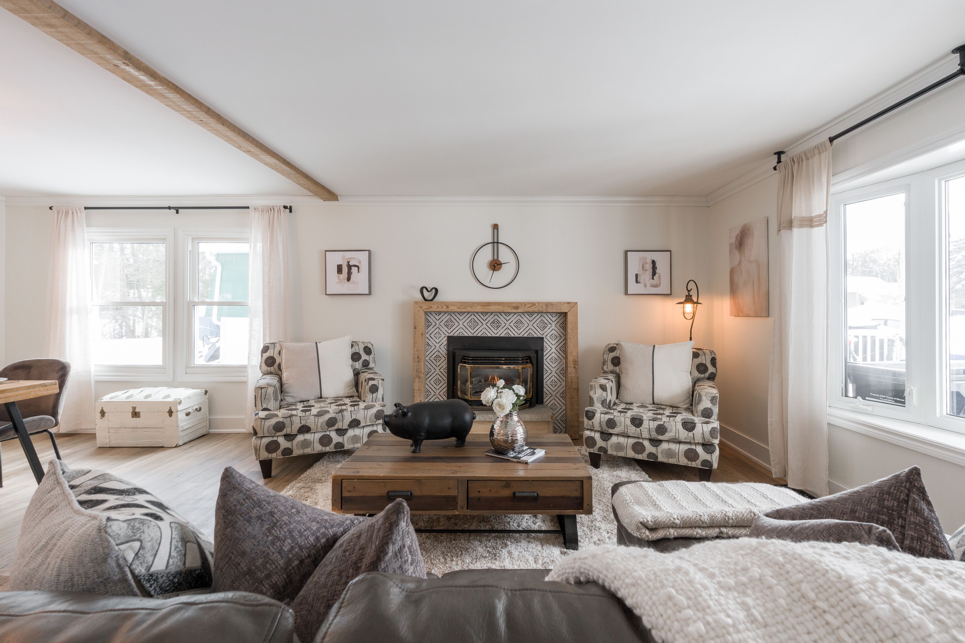 • Expansive living room with oversized windows and two gas fireplaces.