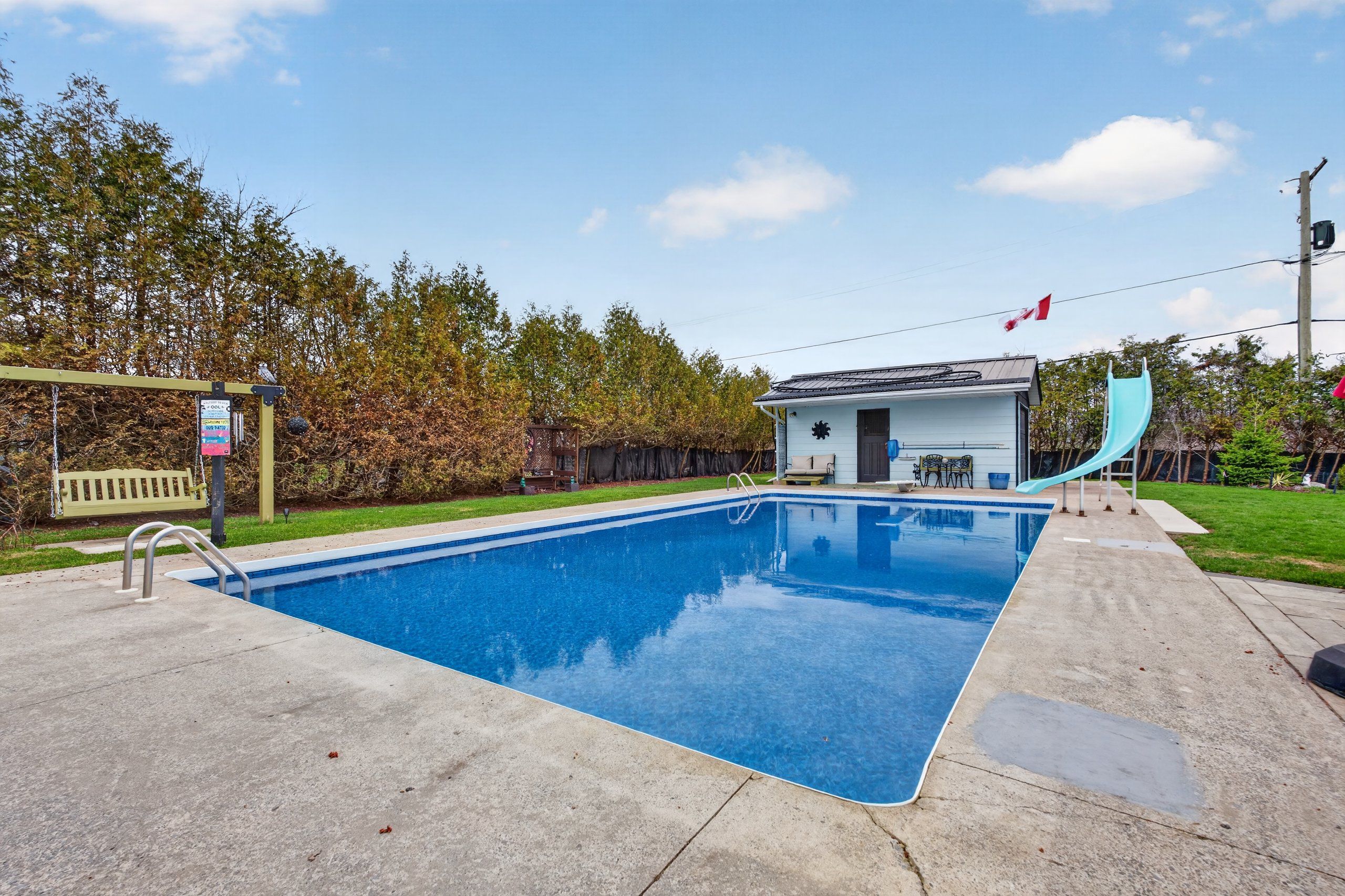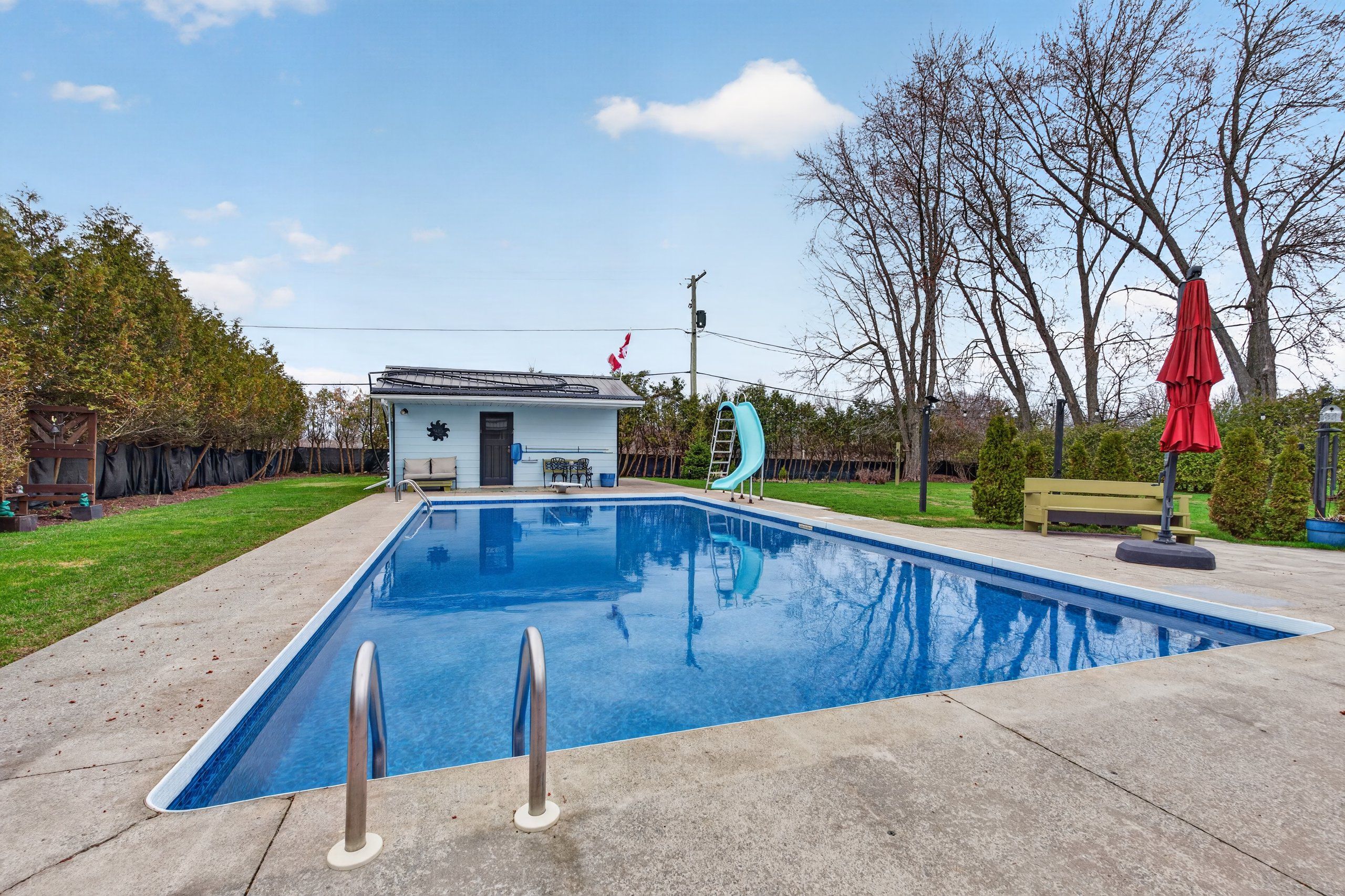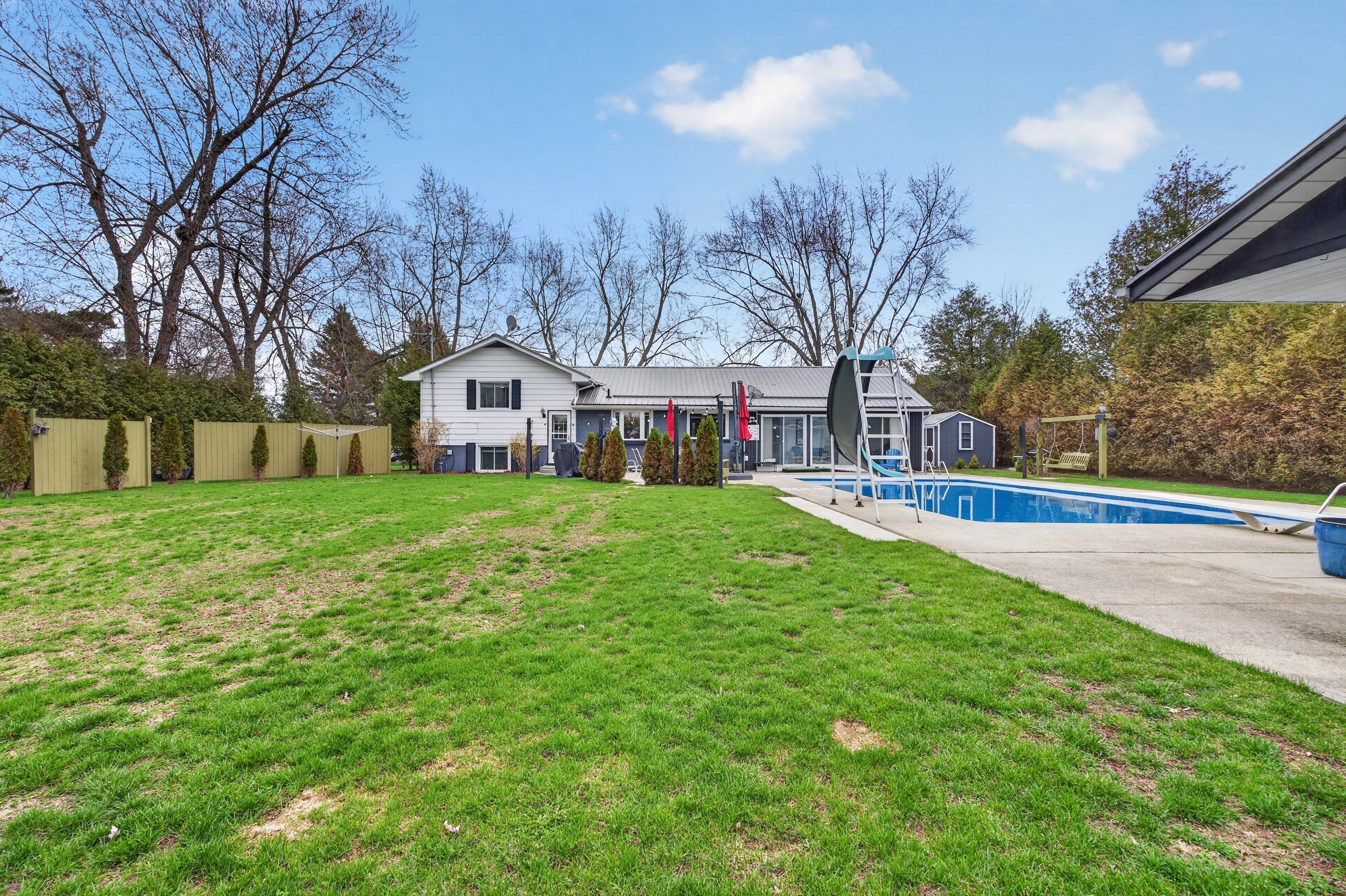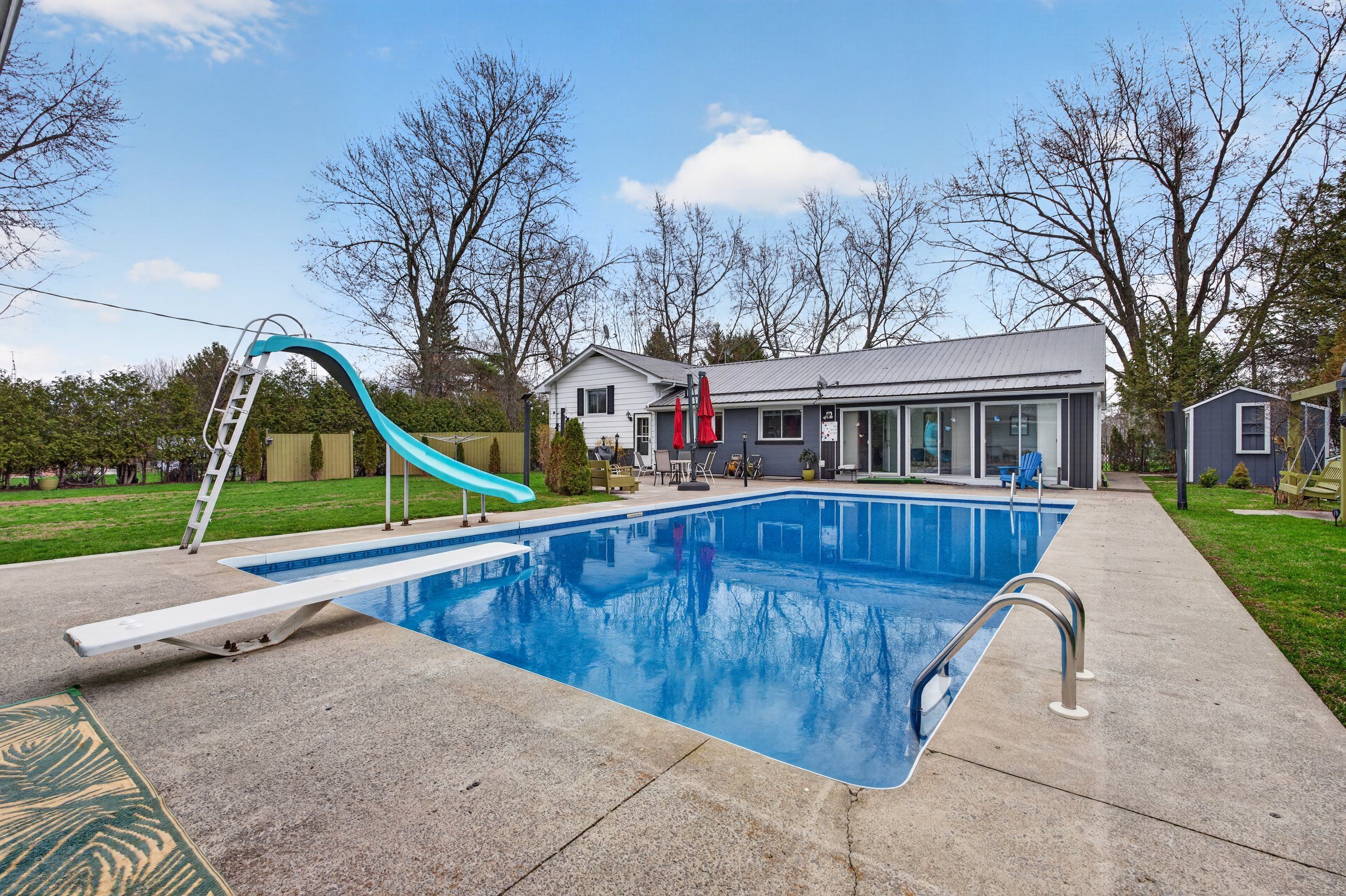 • Private backyard oasis with in-ground pool, pool shed, and mature evergreens.