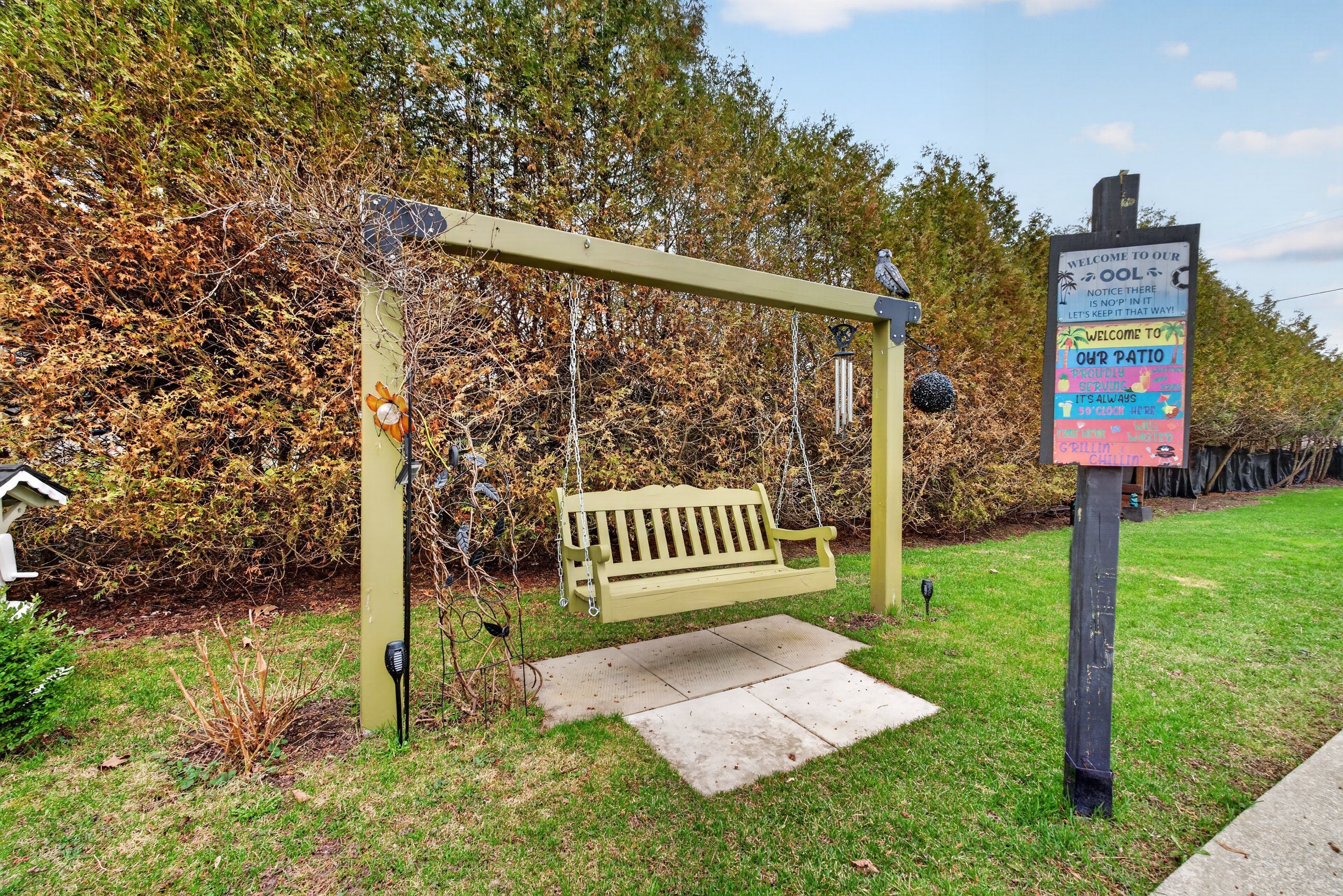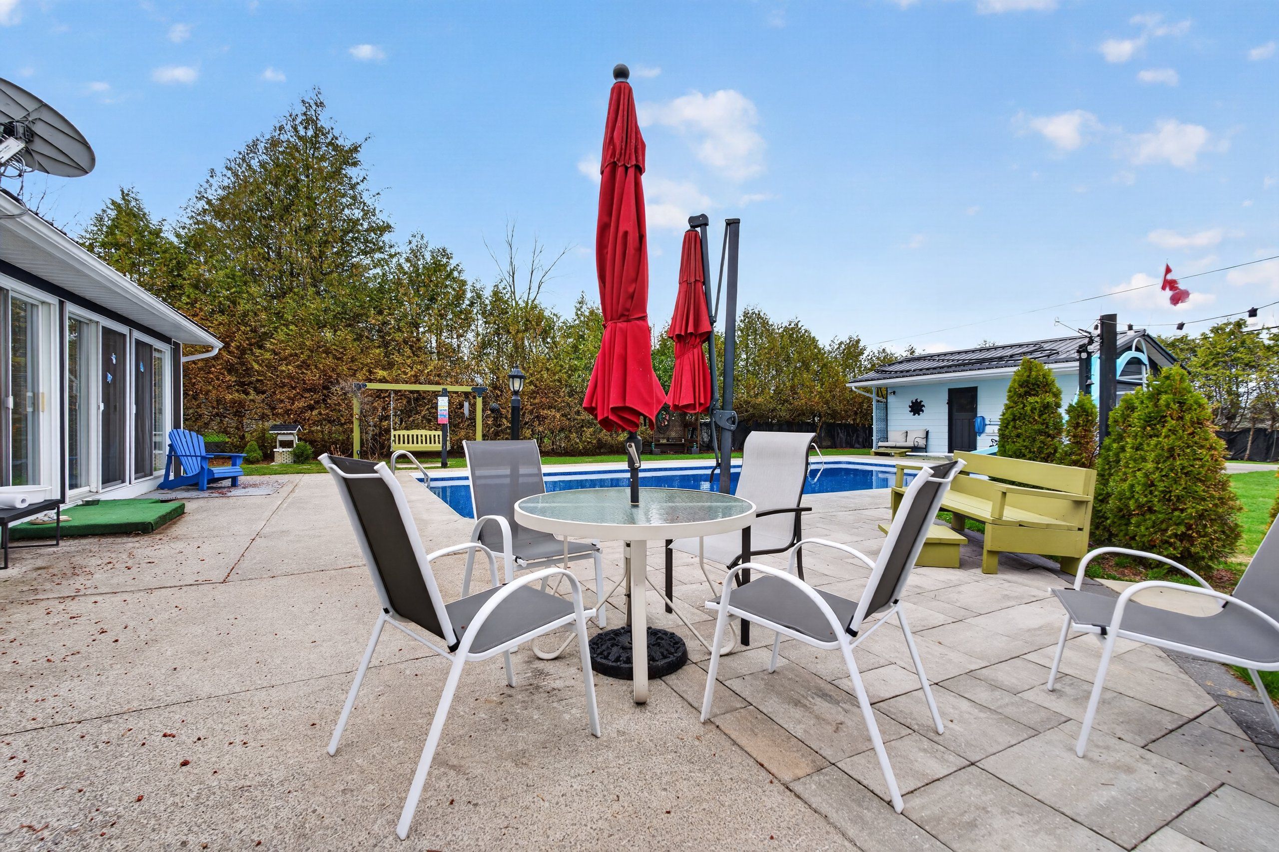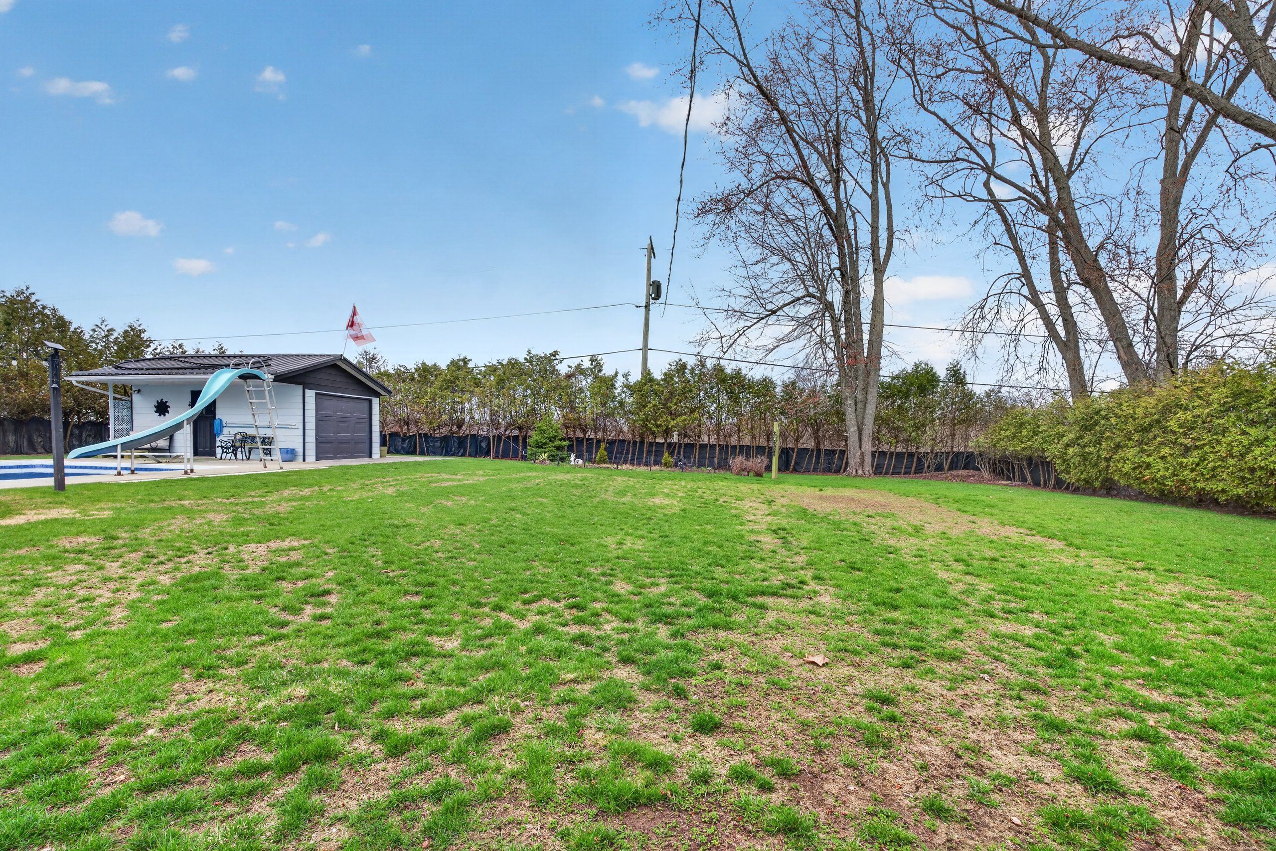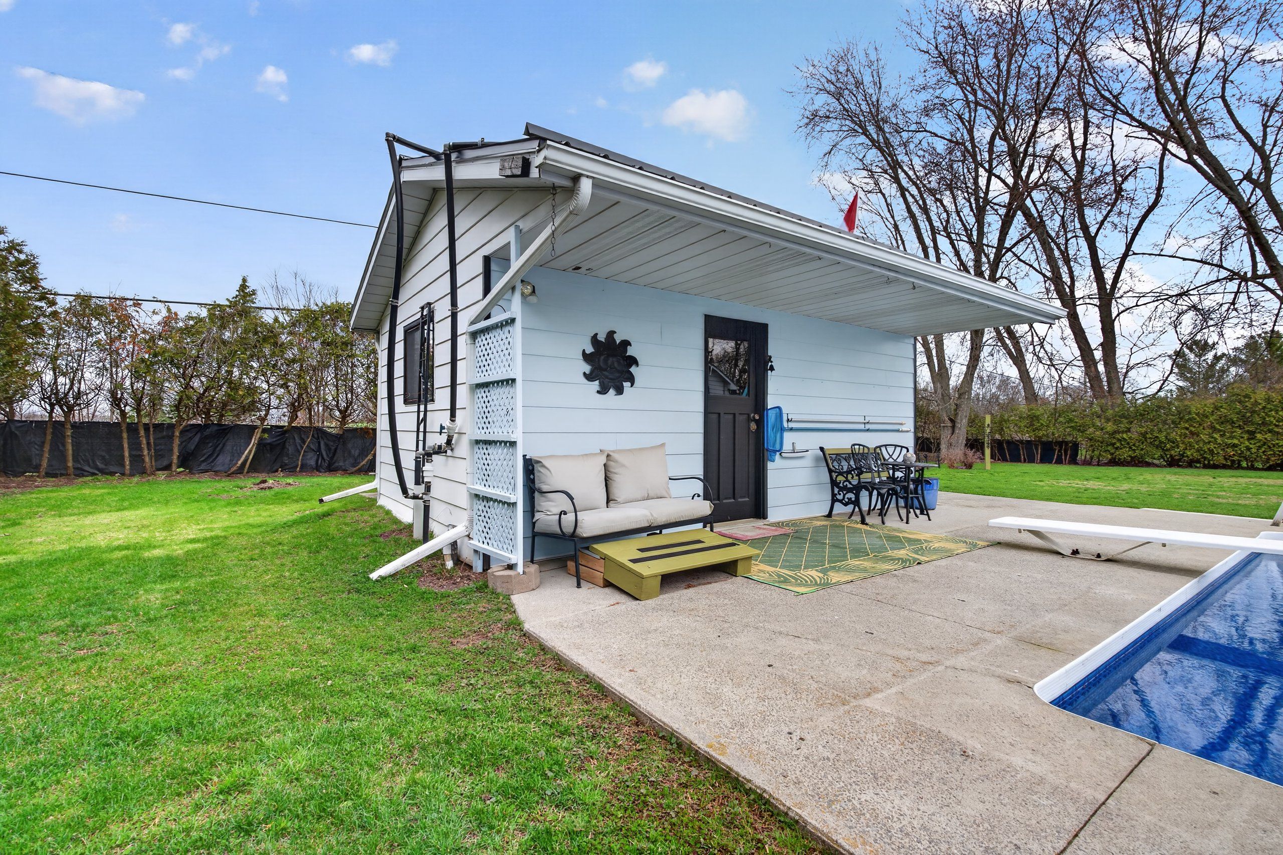 • Private backyard oasis with in-ground pool, pool shed, and mature evergreens.