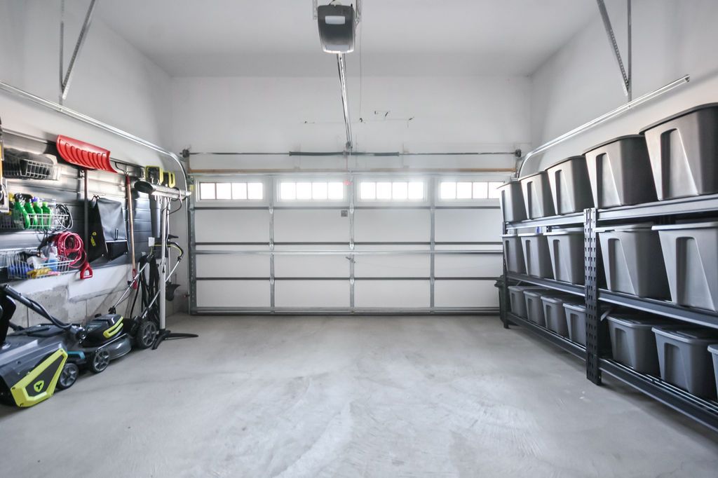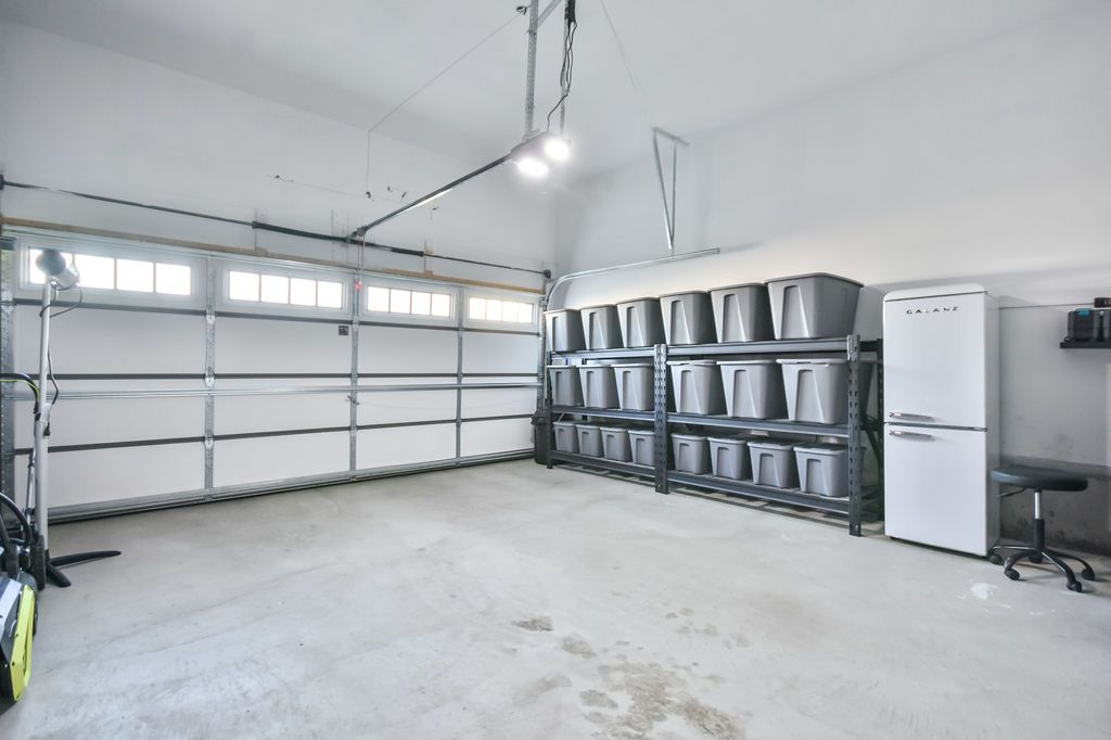 • Double car garage doubles as a fully outfitted workspace with storage.
