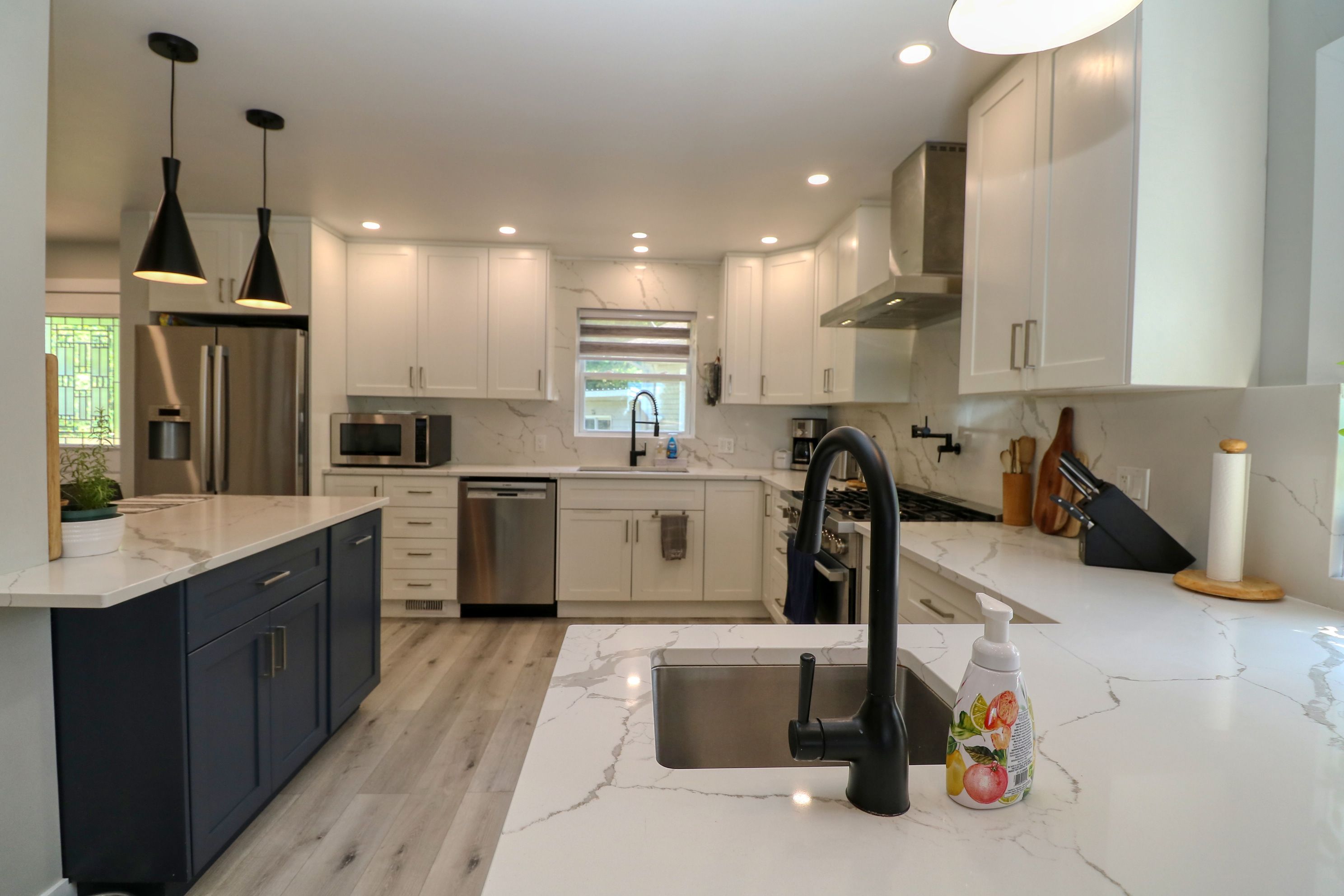 • Open-concept kitchen with quartz counters and modern appliances.