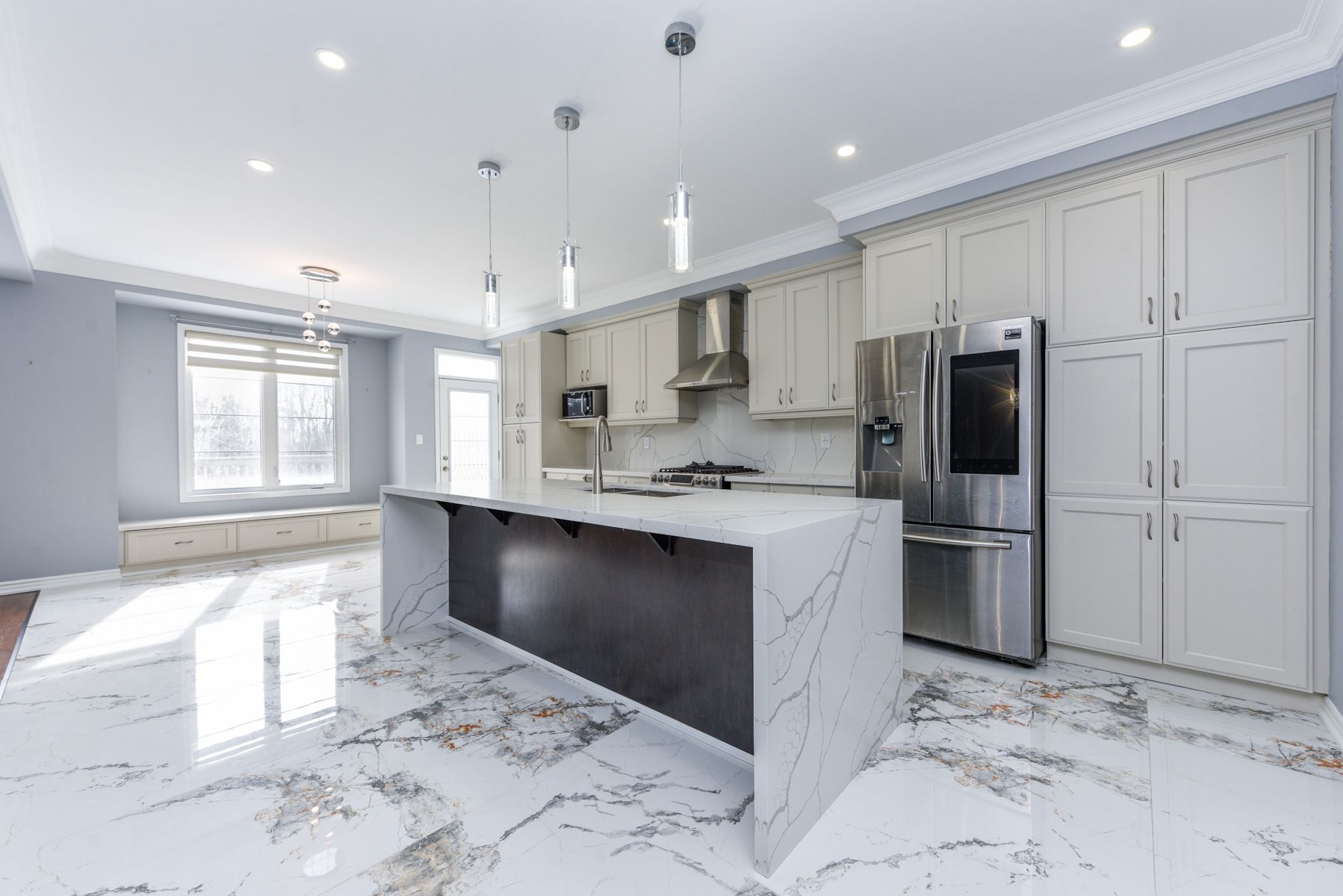 • Modern kitchen features granite counters, stainless steel appliances, and an island.