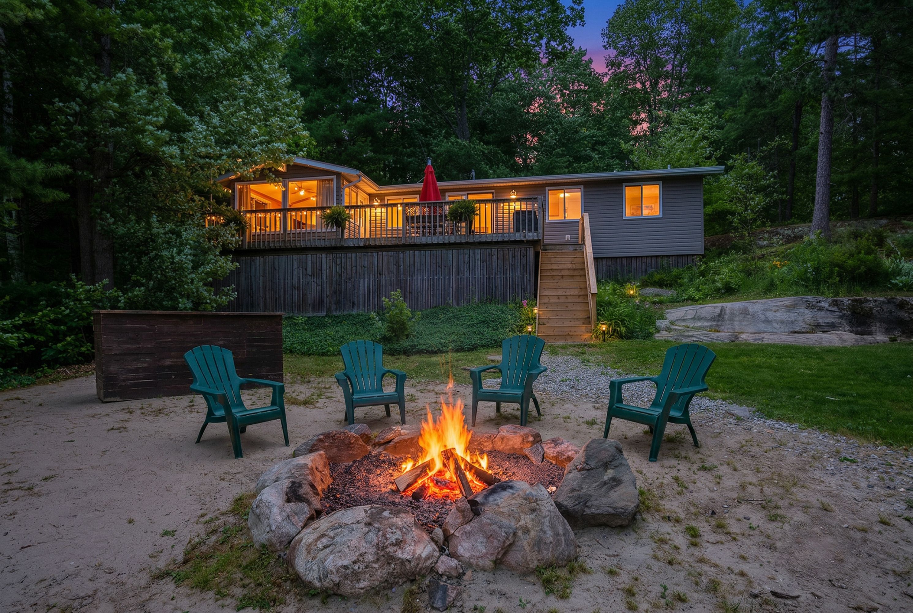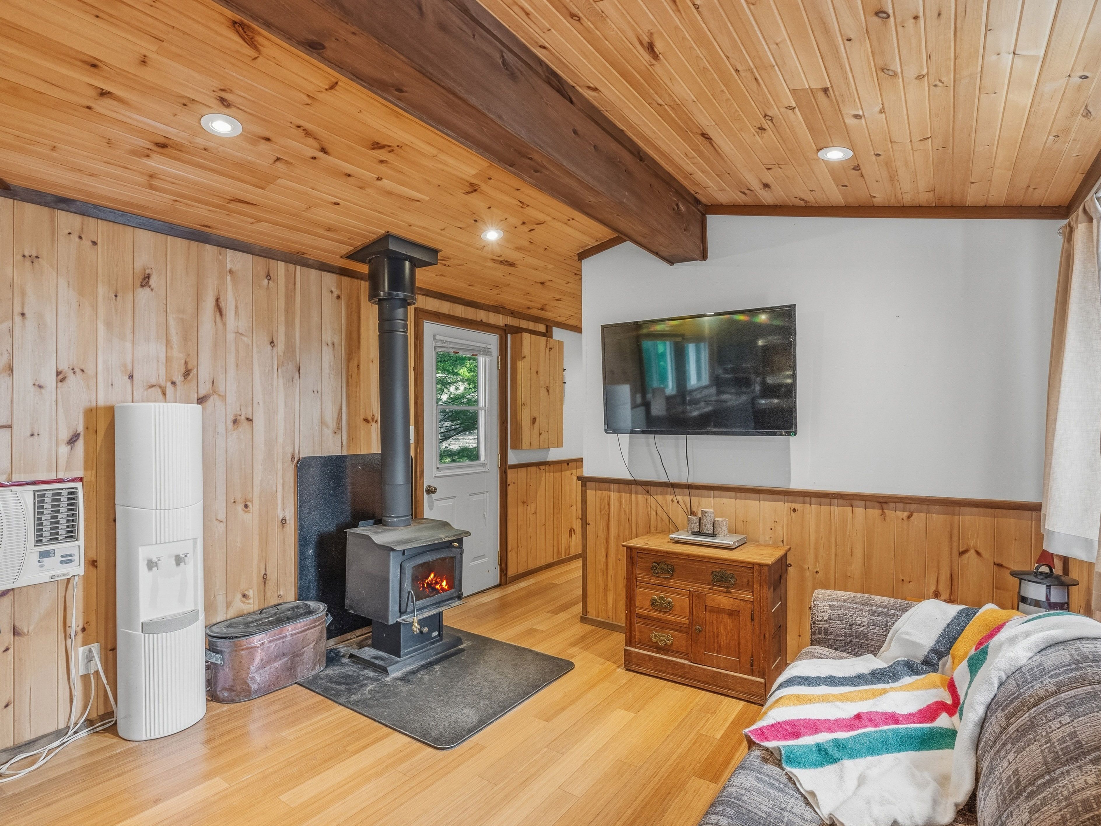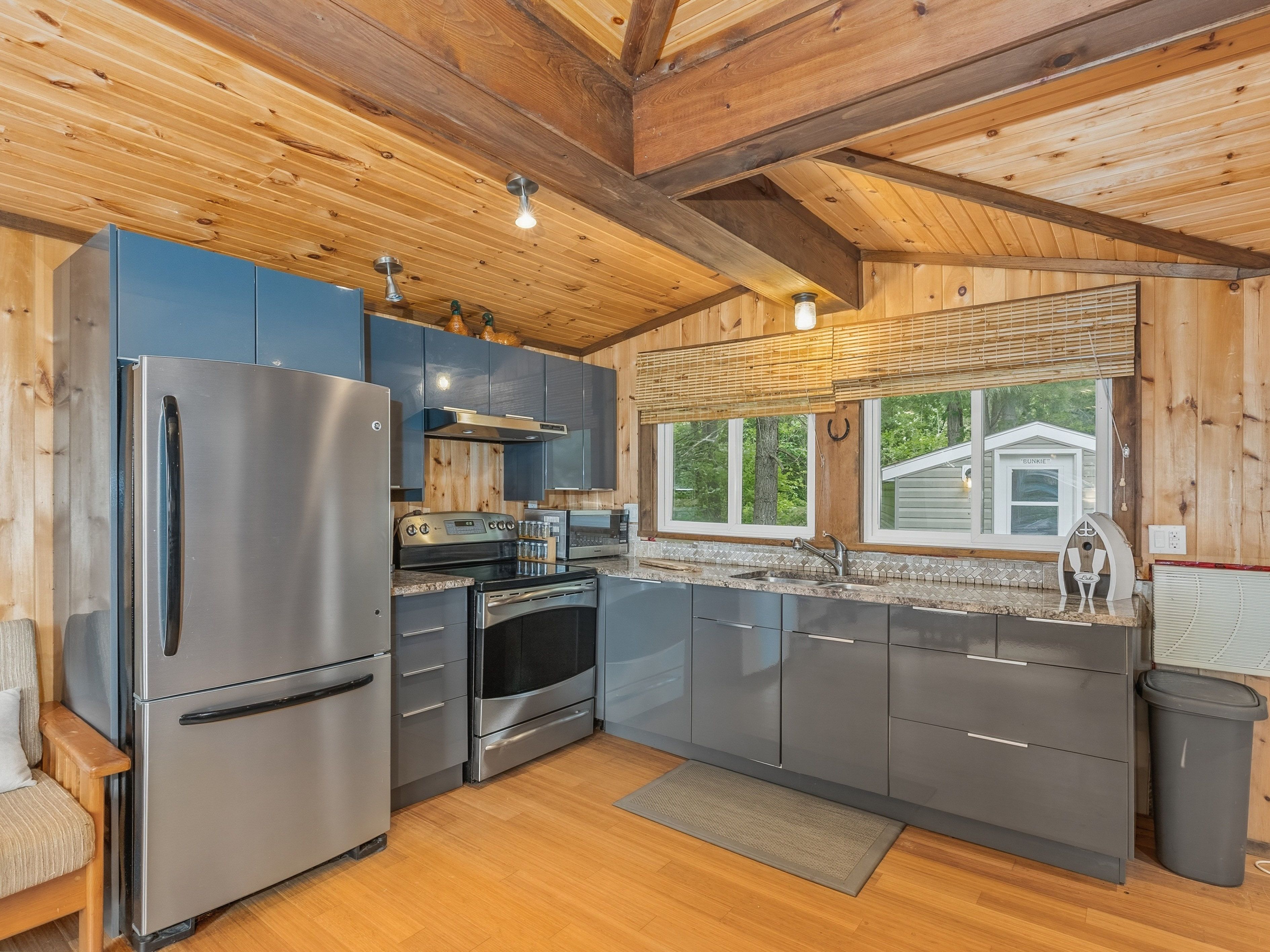 • Turnkey cottage with modern kitchen, cozy wood stove, and flexible spaces.
