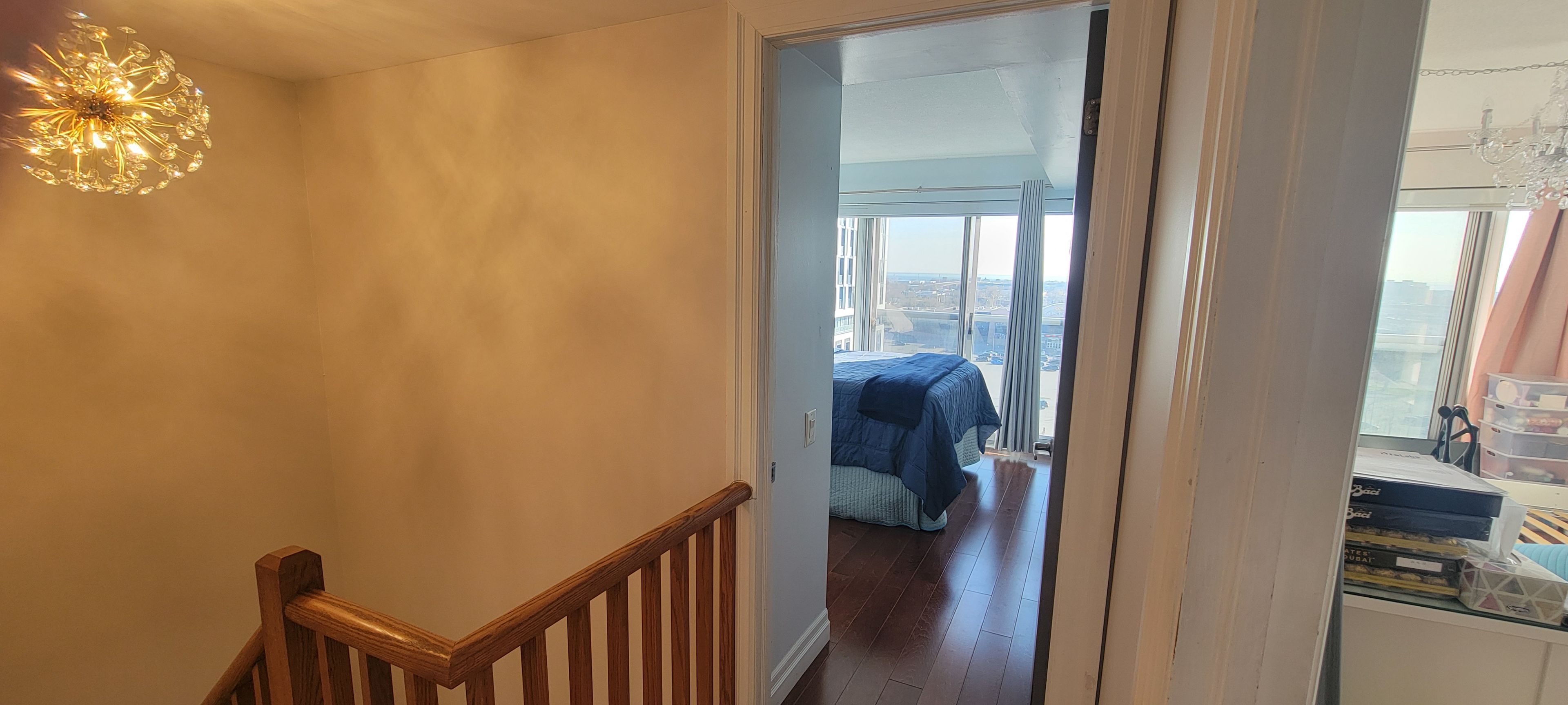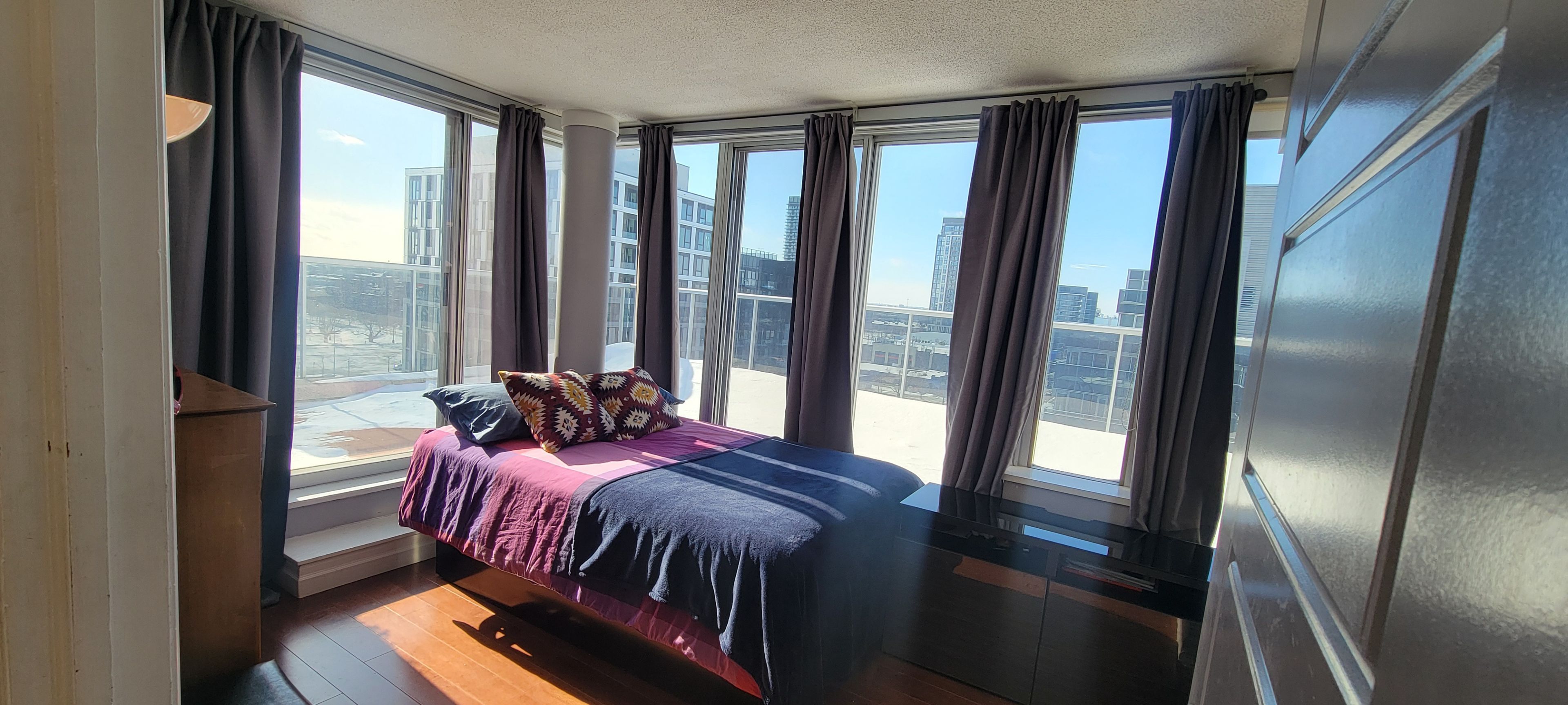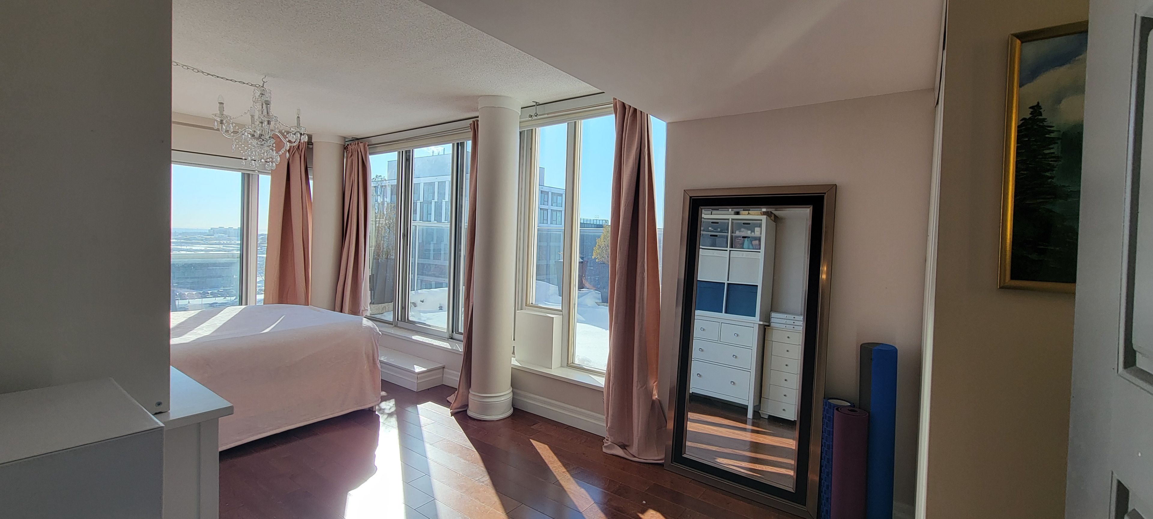 This unique and stunning 3 bed 3 bath corner penthouse unit offers abundance of light, storage, and space, featuring open layout with wrap-around terrace and a million dollar view of lake; cn tower, city, sunset, and other magnificent views. Approximately 1200 sq ft of living space plus 500 sq ft of wrap-around terrace and 2nd level balcony. Open concept beautiful kitchen with movable center island, and quartz counters is amazing for family and entertainment. Oversized primary bedroom face south and west, can easily fit king bed, has its own large open balcony that is great for exercise/yoga/tanning. Warm cambridge brown 5" wide plank maple hardwood is laid throughout entire apartment. Quart counters and marble floors in all bathrooms, maple stairs. Large second bedroom is currently used as an office. Water, heat, a/c, and common elements are included in the maintenance fee. Easy access to gardiner/qew, hwy 427, and downtown. Public transit, great schools, restaurants, movies, and shopping.