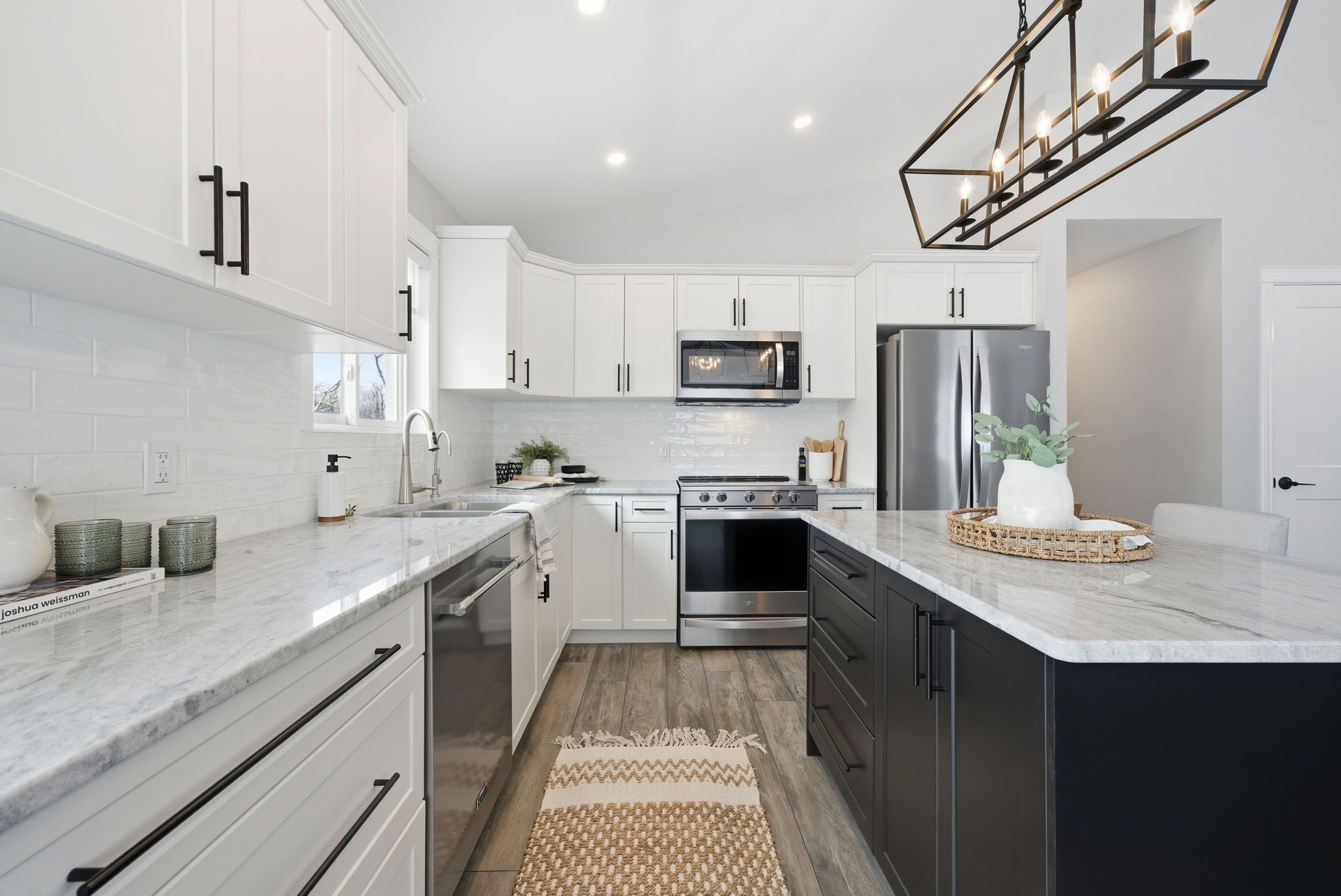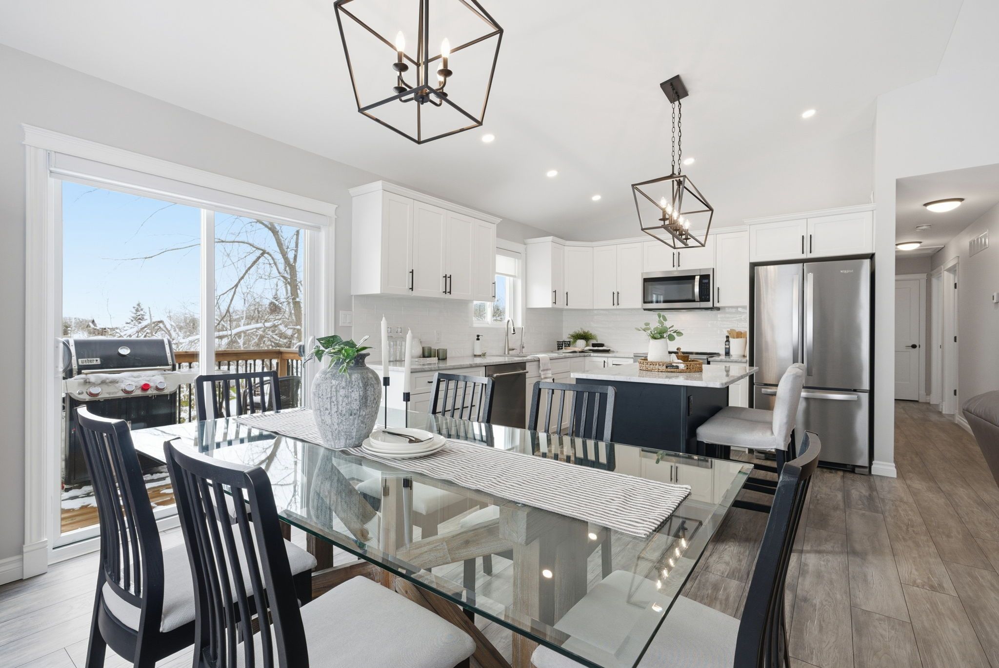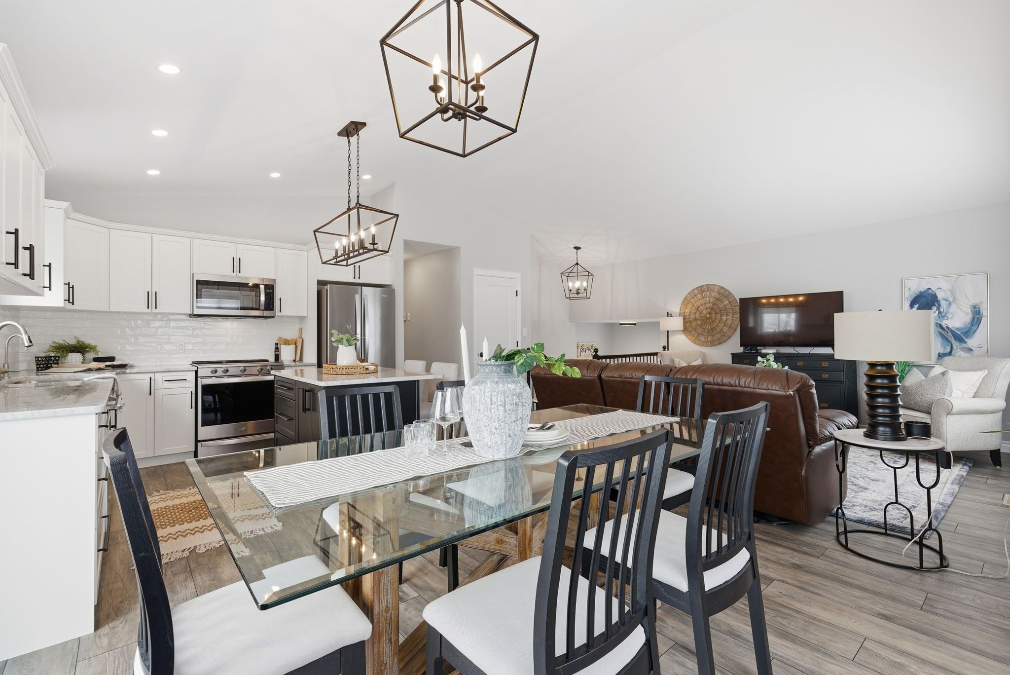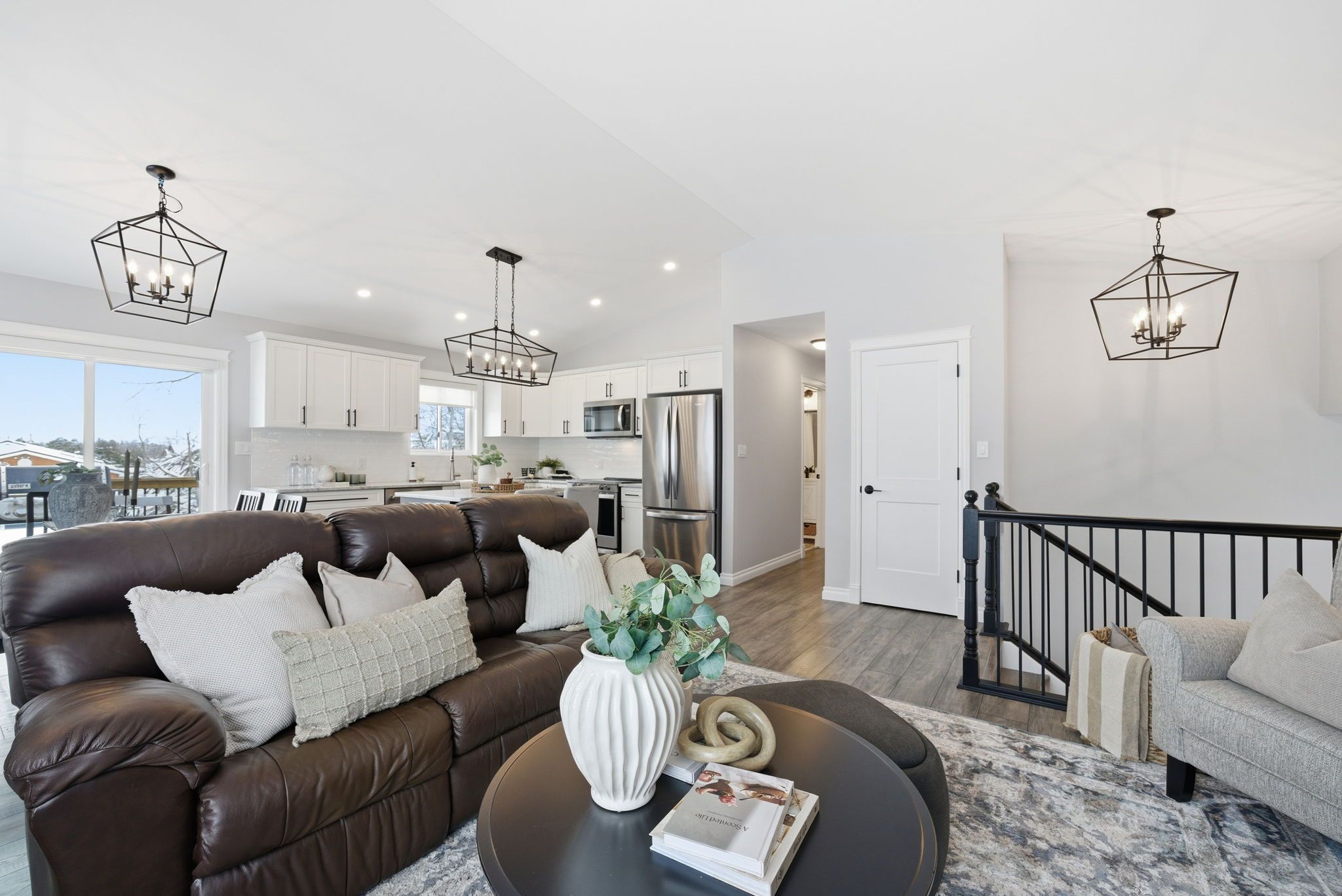 • Bright, open-concept living area flows from kitchen to dining to living rooms.