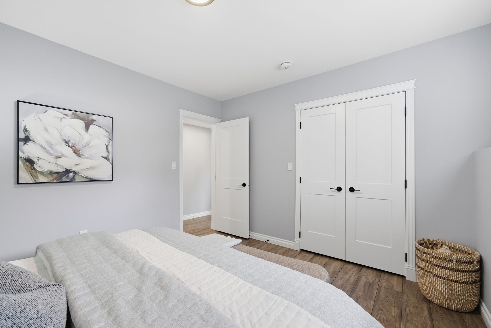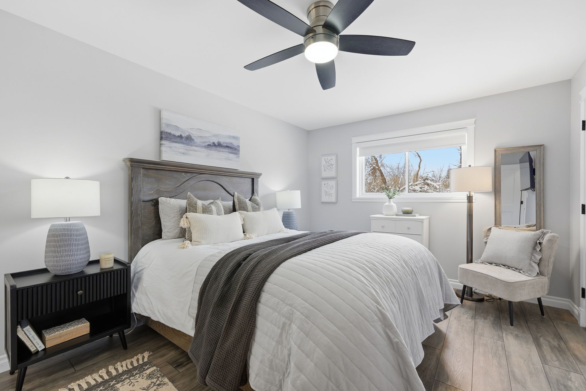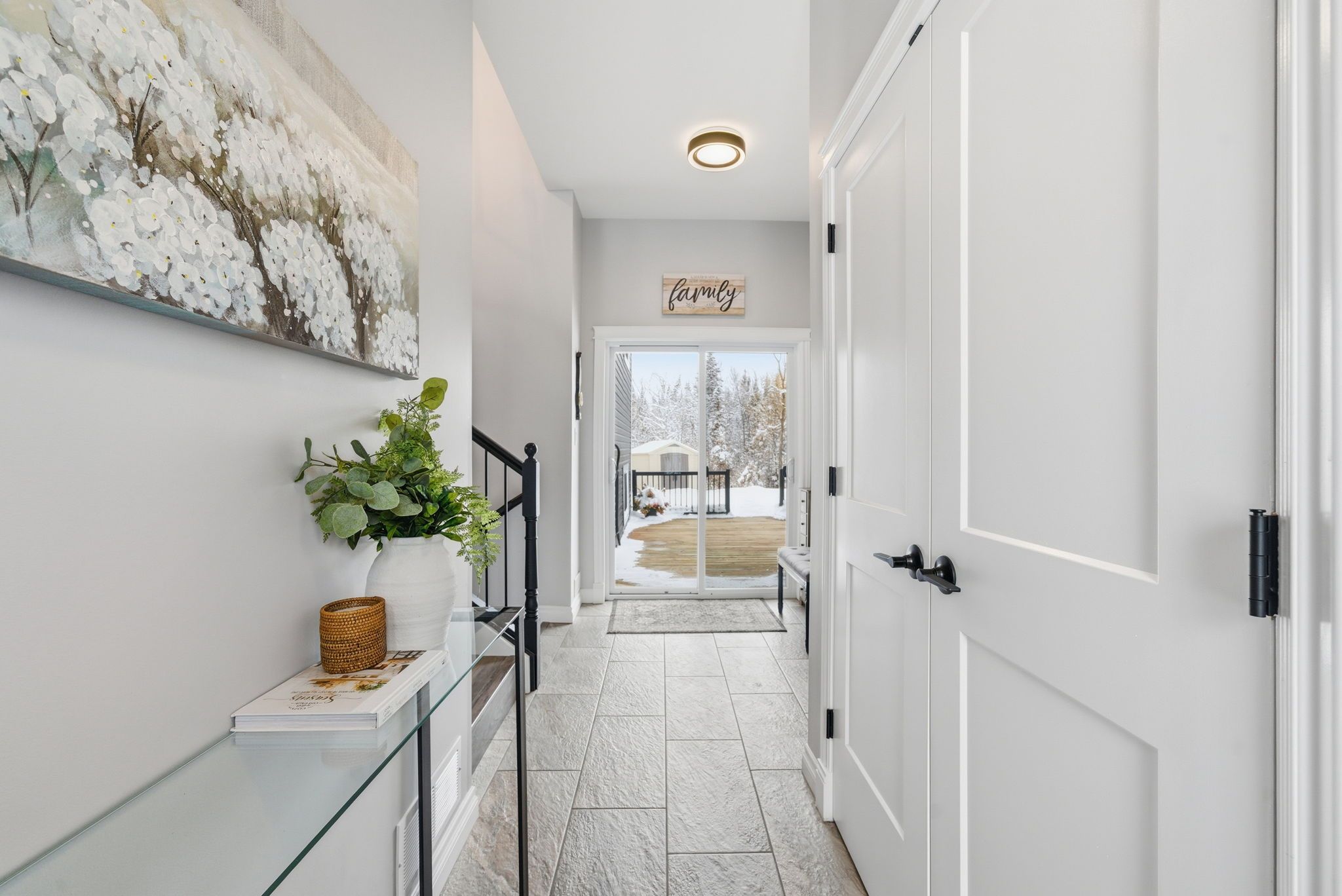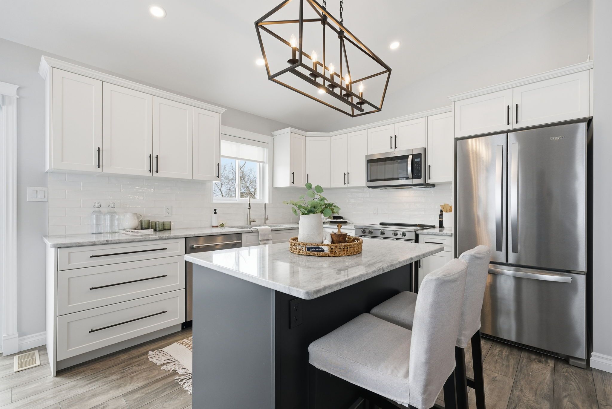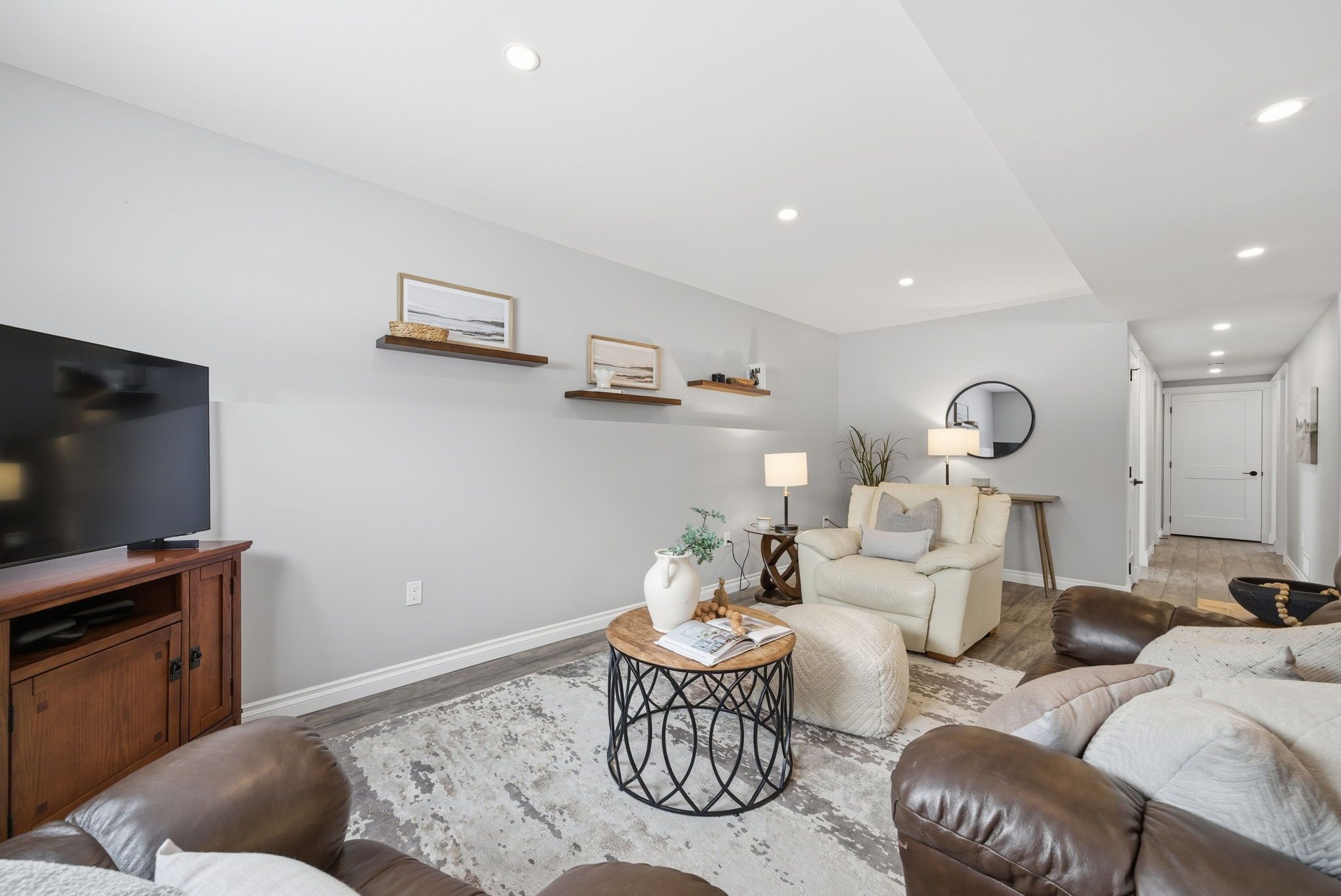 • Bright, open-concept living area flows from kitchen to dining to living rooms.