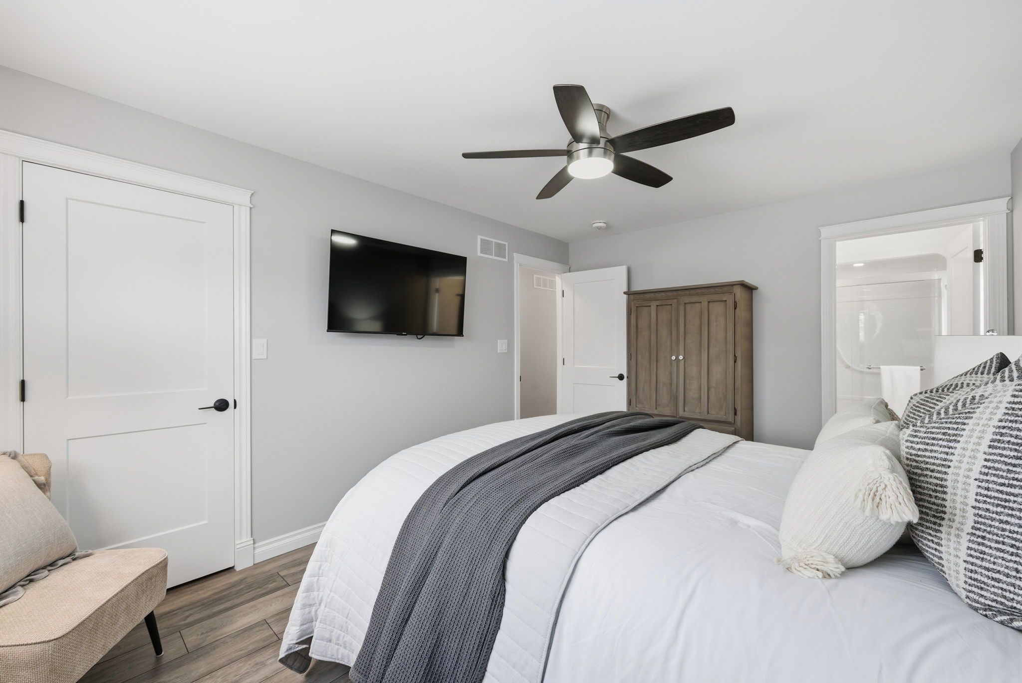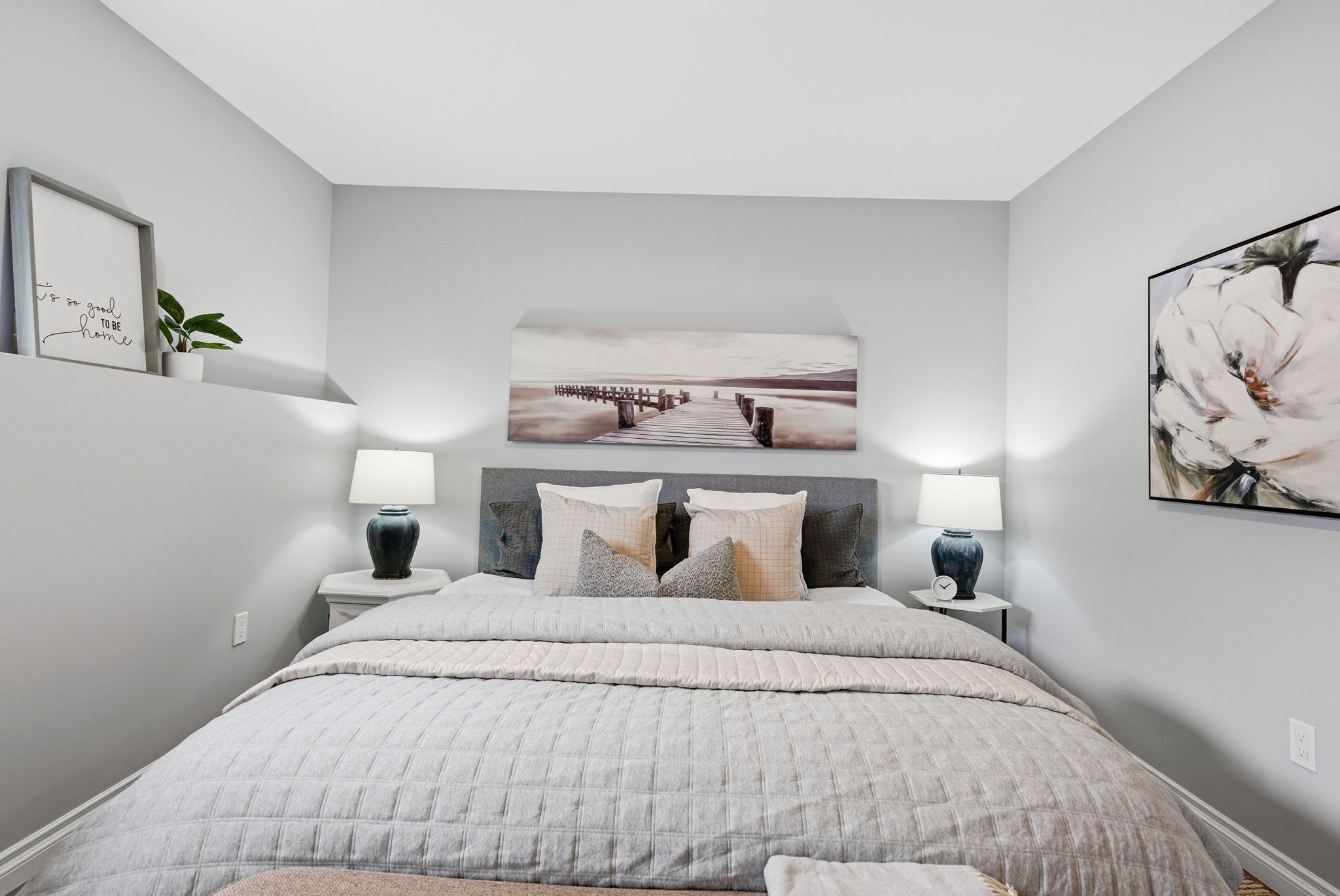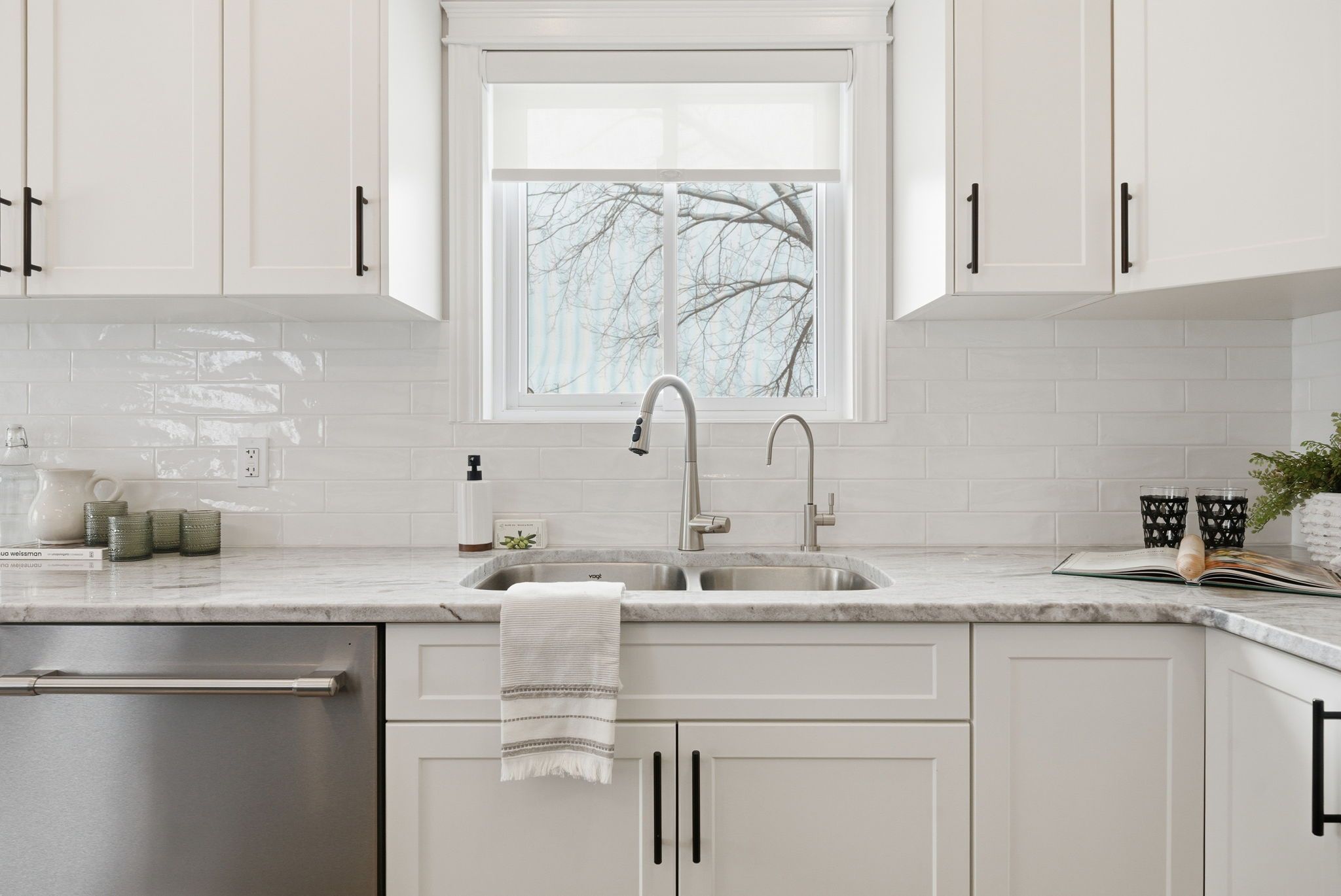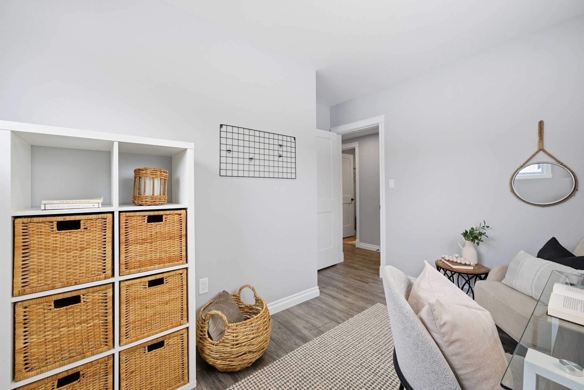 • Bright, open-concept living area flows from kitchen to dining to living rooms.