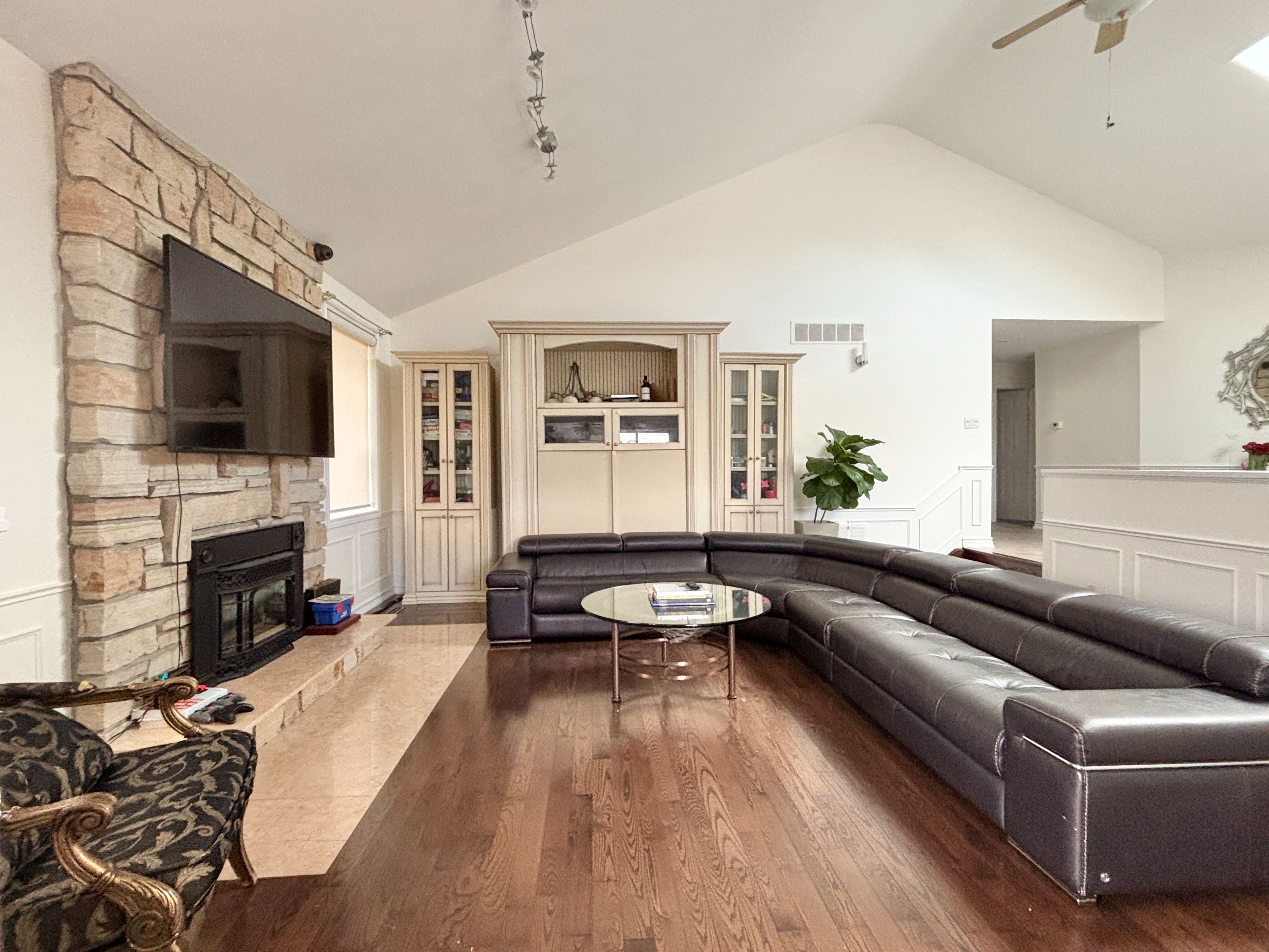 • Open concept kitchen with granite counters and gas stove for cooking enthusiasts.