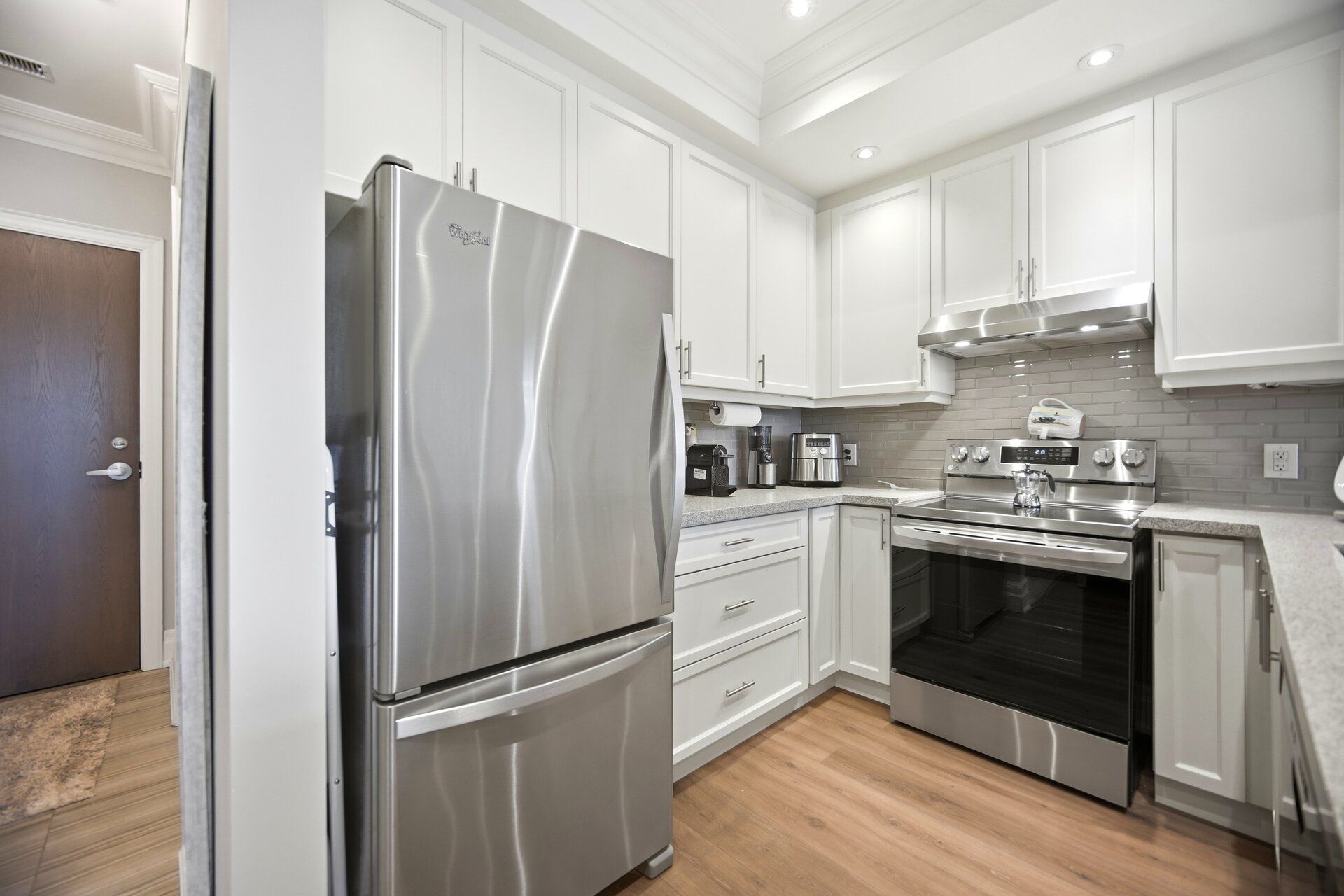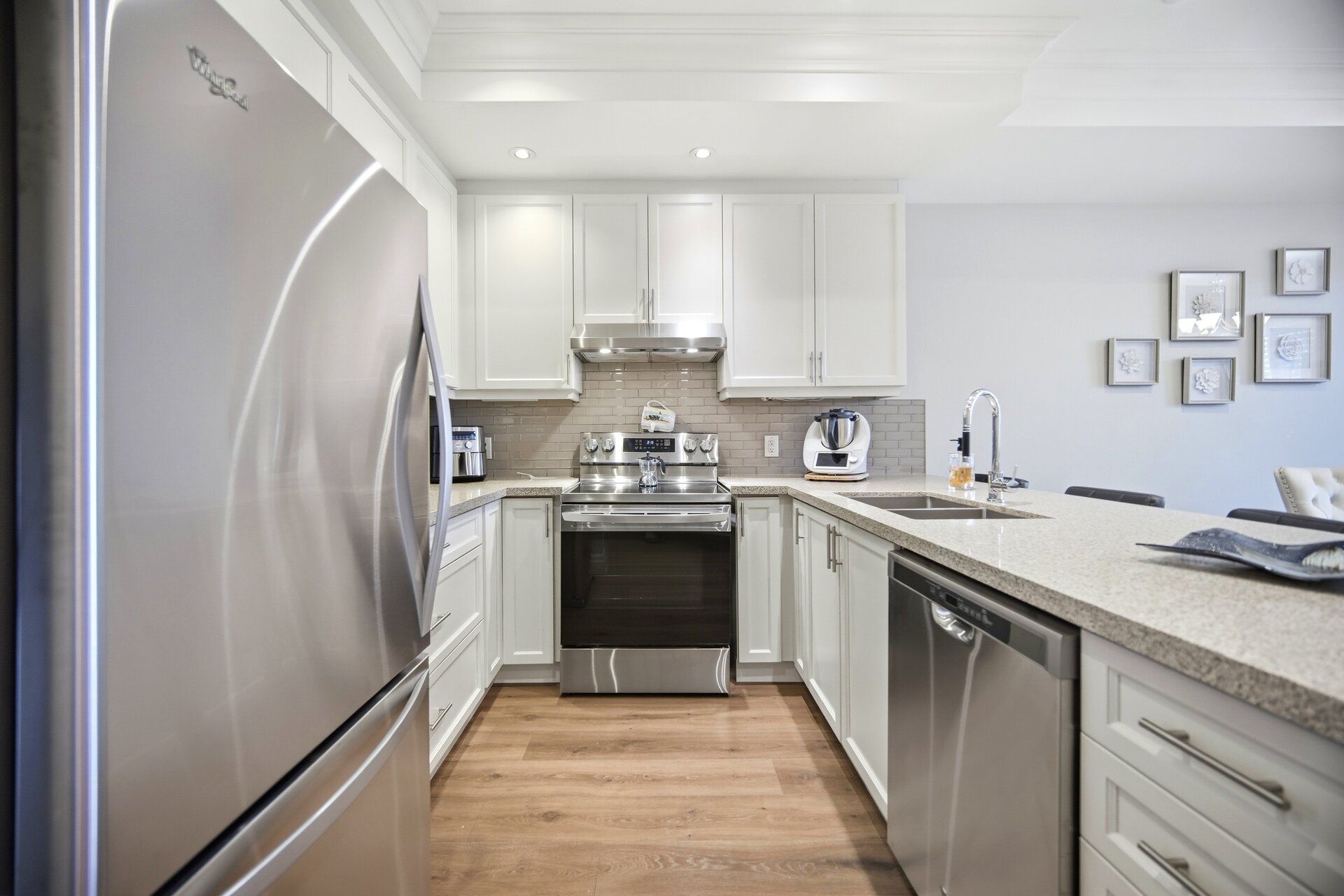 • Modern kitchen with granite countertops and stainless steel appliances.