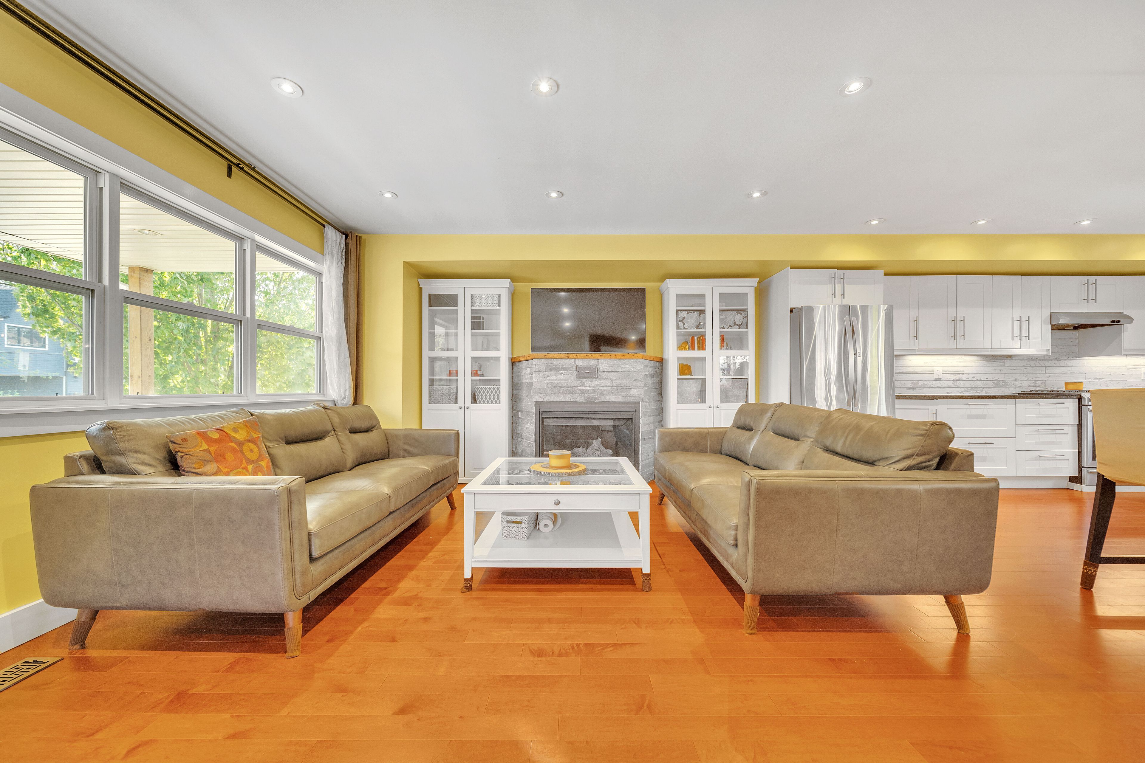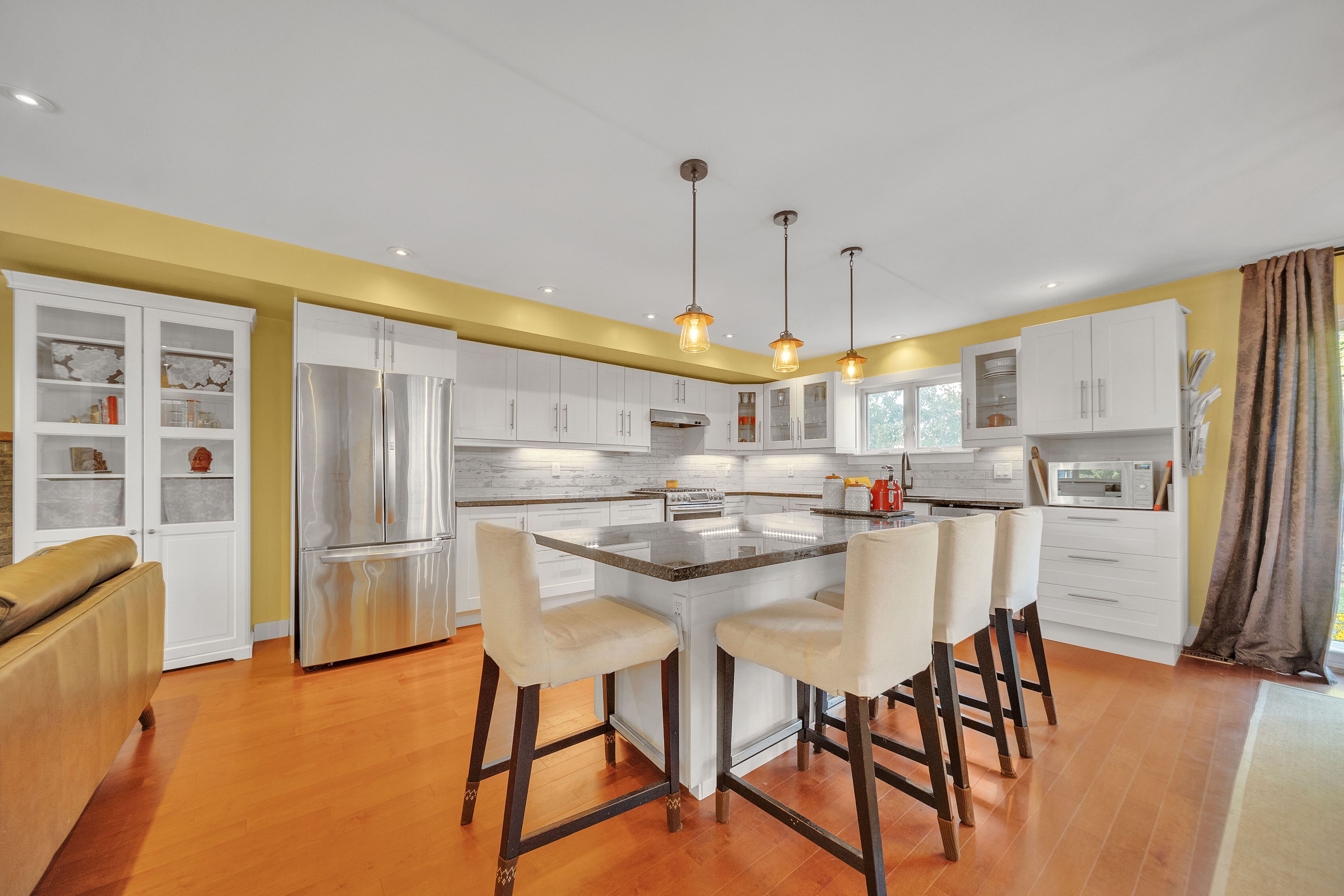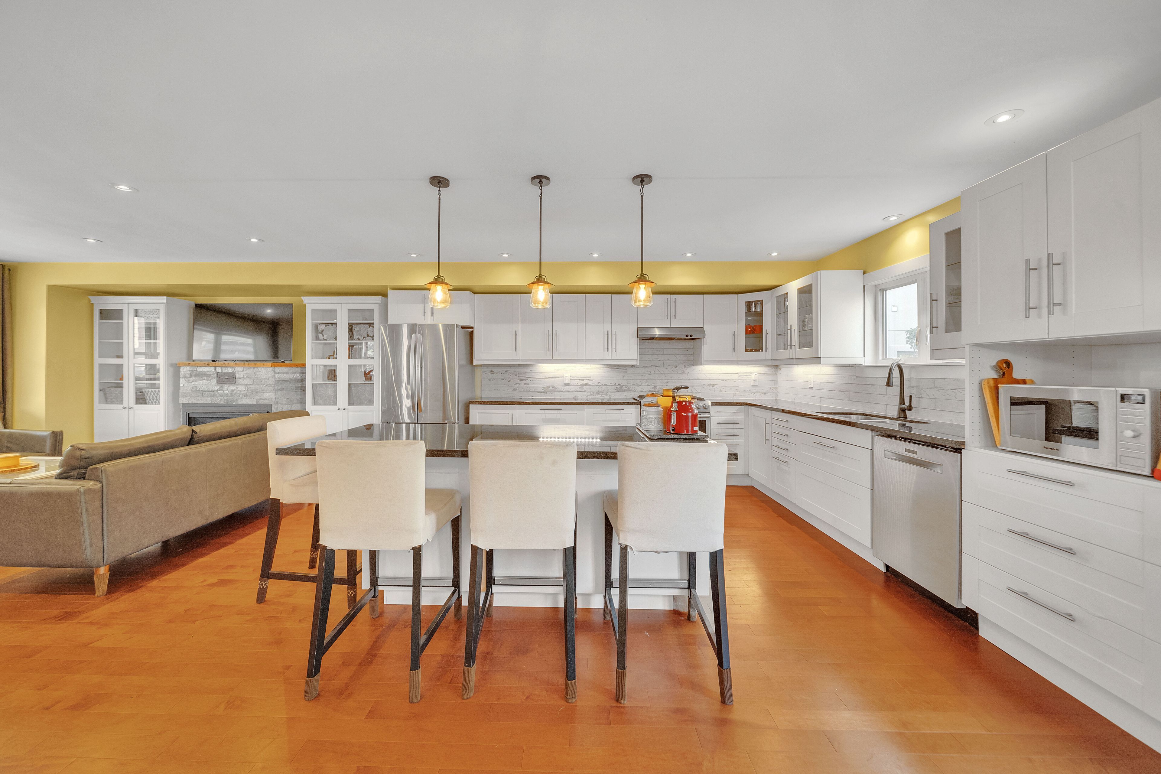 • Custom open-concept kitchen with stainless steel appliances and extended island.