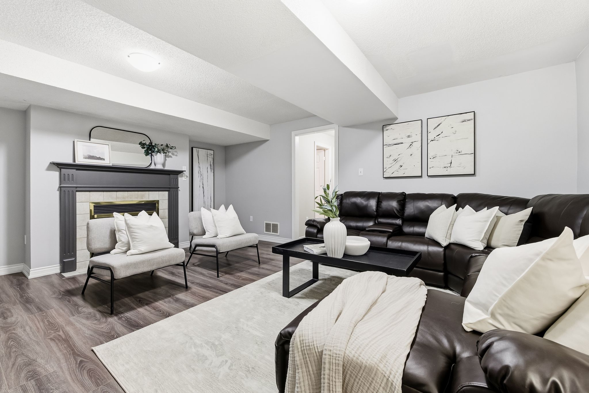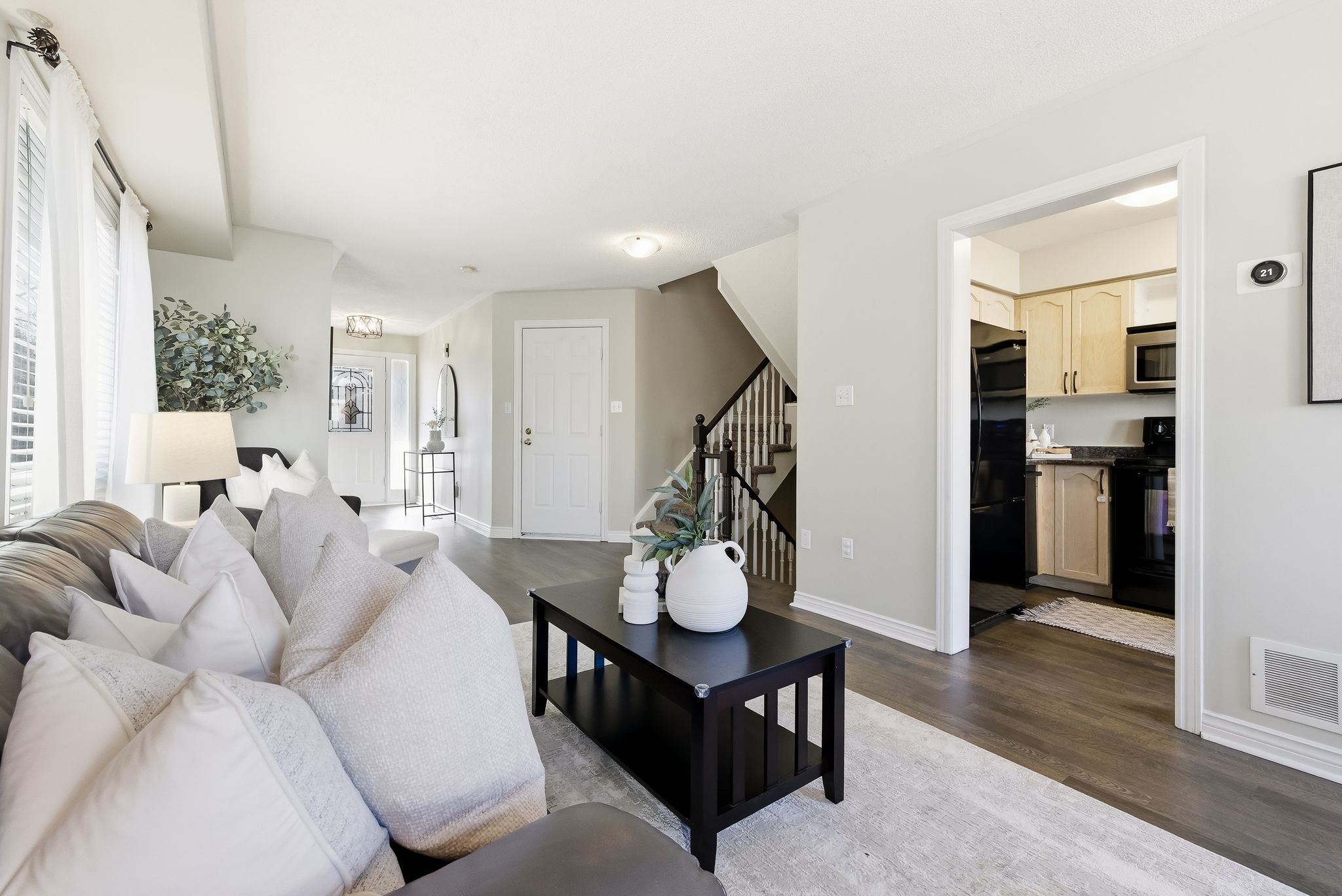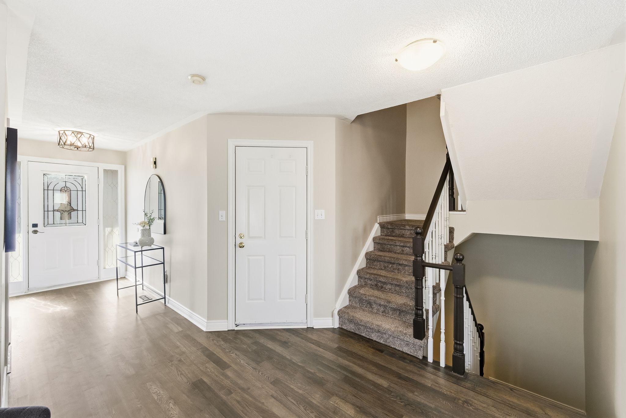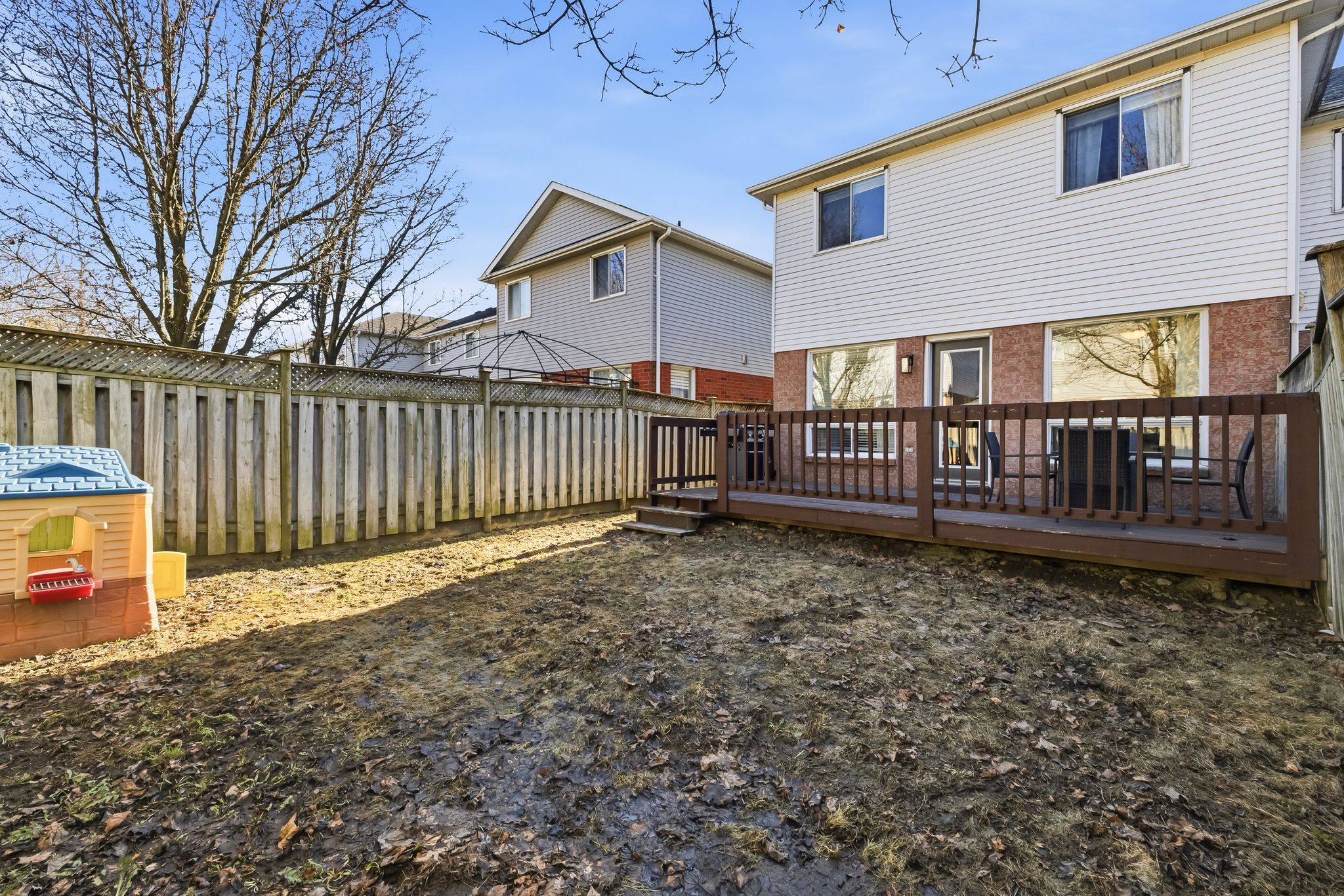 Welcome to brownstone crescent - this beautifully maintained end-unit townhome boasts what others can't. With nearly 1,400 sq ft above grade, a 4th bathroom, home-access to the built-in garage, plus a fully finished basement. Conveniently located on a quiet, family-friendly neighbourhood in courtice. The main floor showcases newly re-finished hardwood floors, plenty of windows, creating a bright and welcoming atmosphere and a rear walk-out to the private backyard. Upon entering the foyer you'll find a closet, a 2-pc bathroom, and the convenience of direct access to the 1-car garage. Enjoy open-concept main floor with large windows offers natural light in the family room and dining rooms, making it ideal for entertaining. The eat-in kitchen features whirlpool and bosch appliances, hardwood flooring, a breakfast bar, and a bay window shining even more natural light into the space. The second storey provides newer carpeted floors in the three generously sized bedrooms, along with two full 4-piece bathrooms. The primary bedroom includes a double-wide closet and private 4-pc ensuite, while the additional 2 bedrooms are perfect for children, guests, or a home office. The professionally finished basement adds valuable living space with a cozy den complete with gas fireplace, a second 2-piece bathroom, and a dedicated laundry/utility area- all ideal for convenience and relaxation, working from home or hosting guests. This home is perfectly positioned close to highly regarded schools, everyday shopping amenities, and excellent commuter access. Enjoy nearby green spaces including glenabbey and stuart parks, with the courtice community complex just minutes away. Commuters will appreciate the quick access to highways 401 and 407, as well as proximity to the oshawa go station. This move-in-ready end unit offers space, comfort, and an unbeatable location for families and professionals alike.