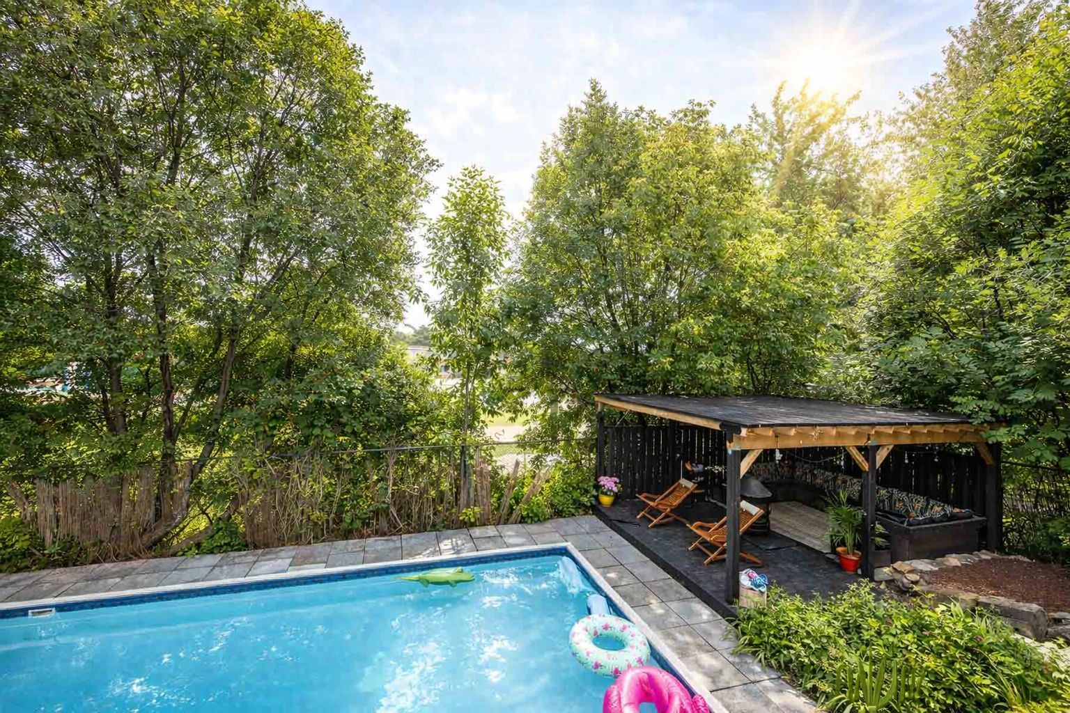 • Private backyard oasis with a pool and wrap-around deck for gatherings.