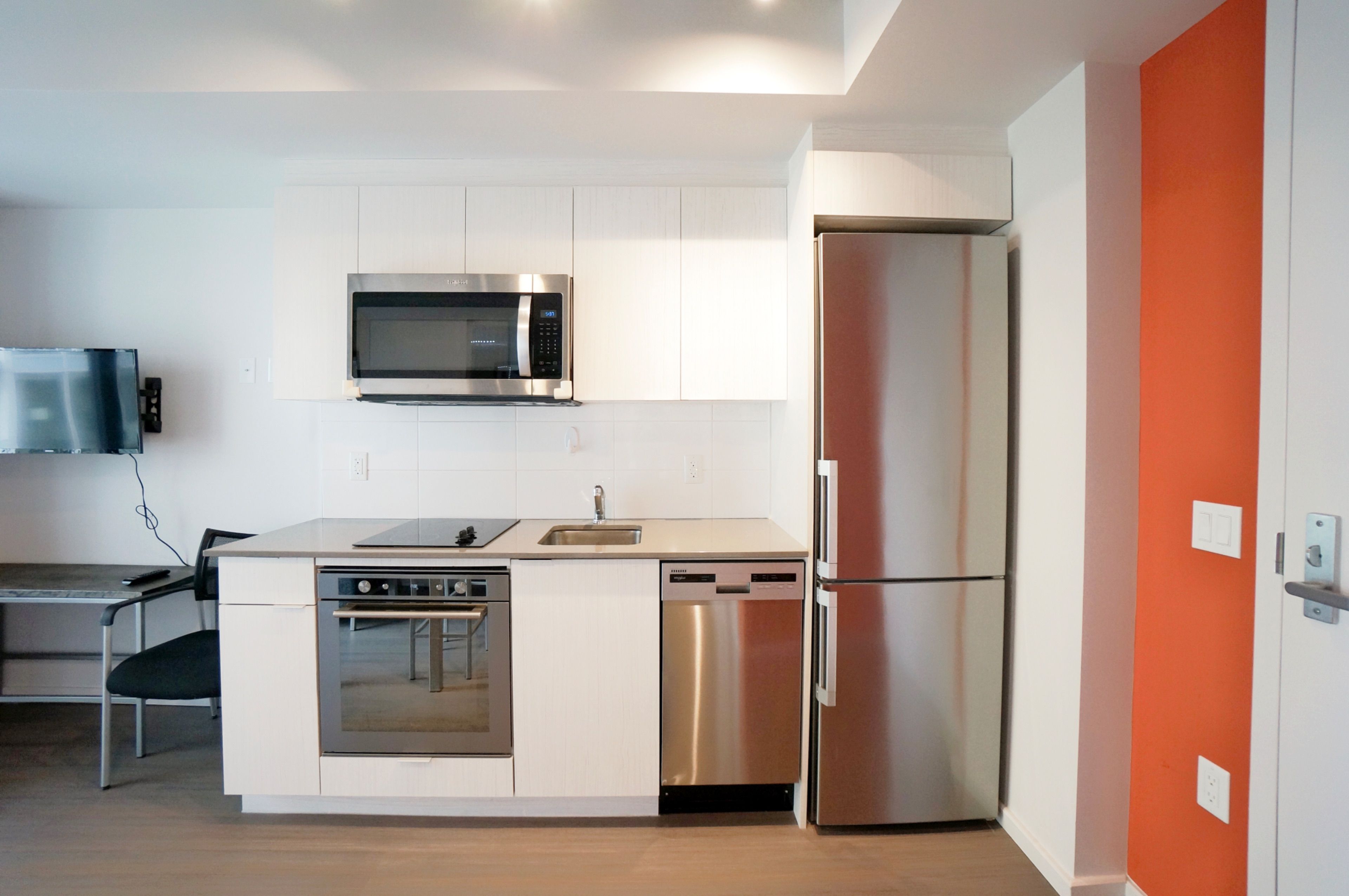 • Open concept kitchen equipped with stainless steel appliances.