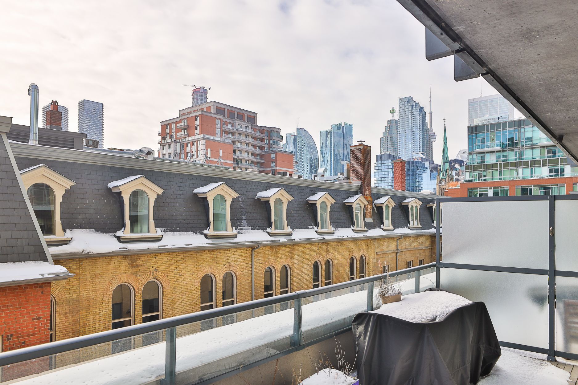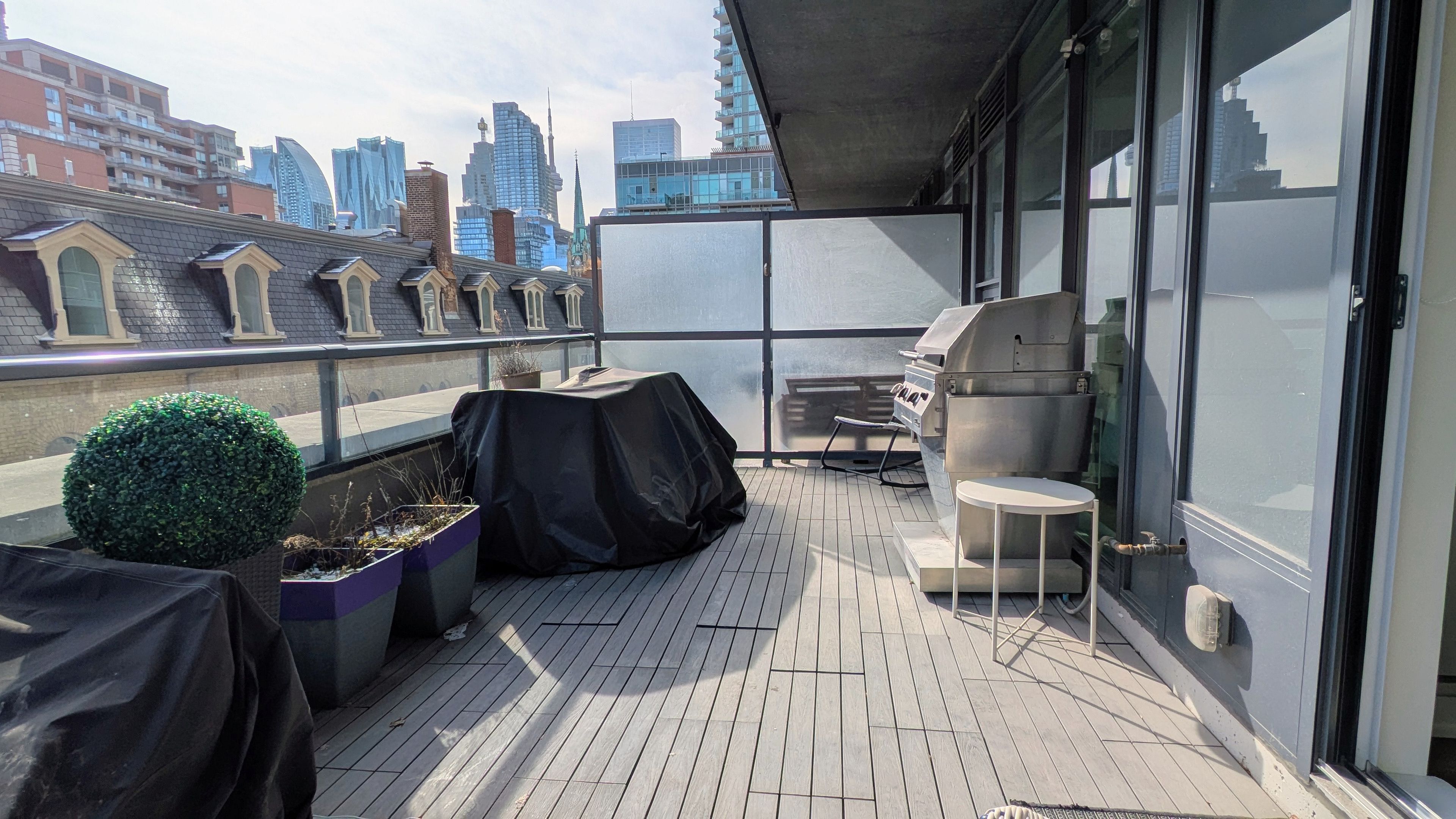 Welcome to post house condos! This spacious 1 bedroom plus den suite with a 200 sq ft private terrace nestled behind toronto's first post office, literally three blocks from st lawrence market has everything you could ask for - 9' ceilings, a bright spacious living area that comfortably fits real furniture, a slick kitchen with quartz counters, tons of tall cabinets, a centre island, and stainless steel appliances, a true bedroom that easily fits a queen-size bed with a private ensuite bathroom, a cozy den perfect for those work-from-home days with a sliding barn door for extra privacy, custom closet built-ins throughout, a bonus power room just for guests... And the best part? A nearly 200 sq ft south-facing private terrace complete with gas line for a bbq overlooking a private courtyard! **all that plus a parking spot, a great sized locker for all your stuff, and a your own dedicated bike rack!** fantastic building with great amenities - 24 hour concierge, gym, yoga studio, a sweet party room, billiard lounge, roof deck with bbqs, sauna, a guest suite, and visitor parking. And just a quick stroll to the financial district, eaton centre, king or queen station, distillery district, st james park mere steps away, king and queen streetcars, and super easy access to the dvp and gardiner. And walking distance to a new ontario line station. The east side is where it's at!